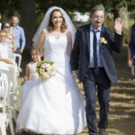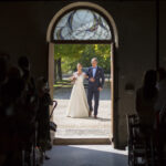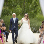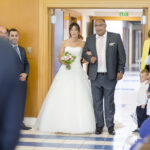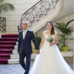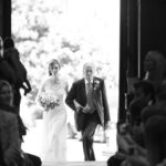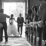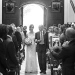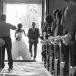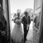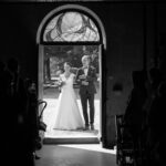 De belles photos de mariée entrant dans l'église au bras de leur père dans leur superbe robe de mariée blanche. Mariage religieux, cérémonie religieuse de mariage dans le respect des traditions.