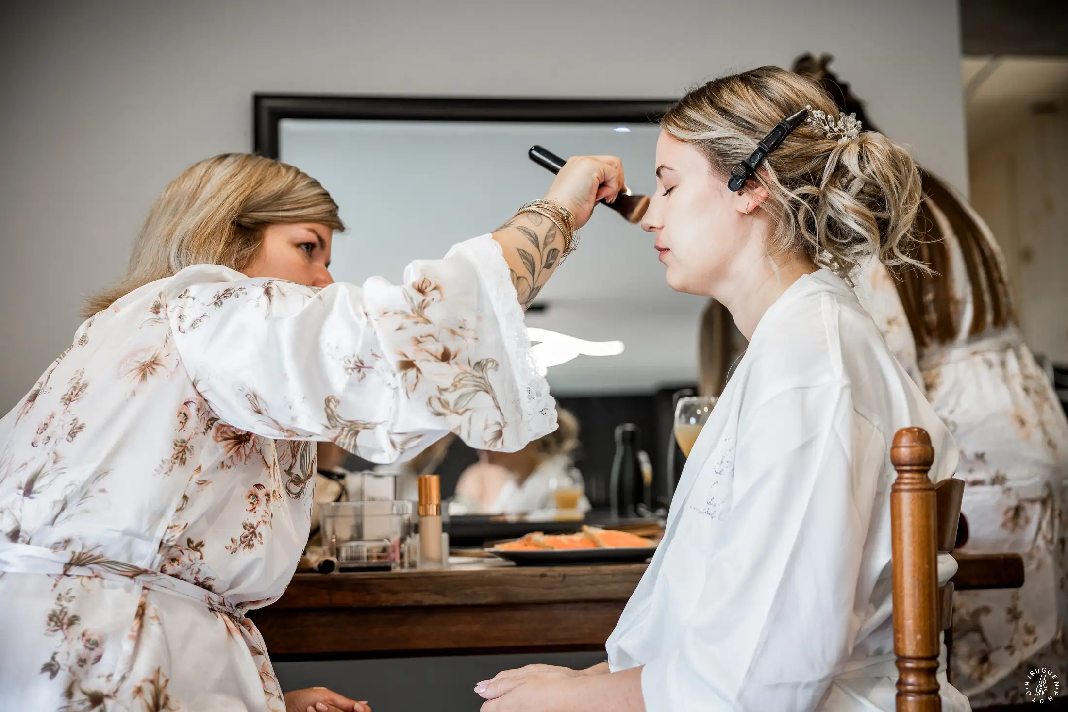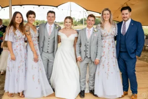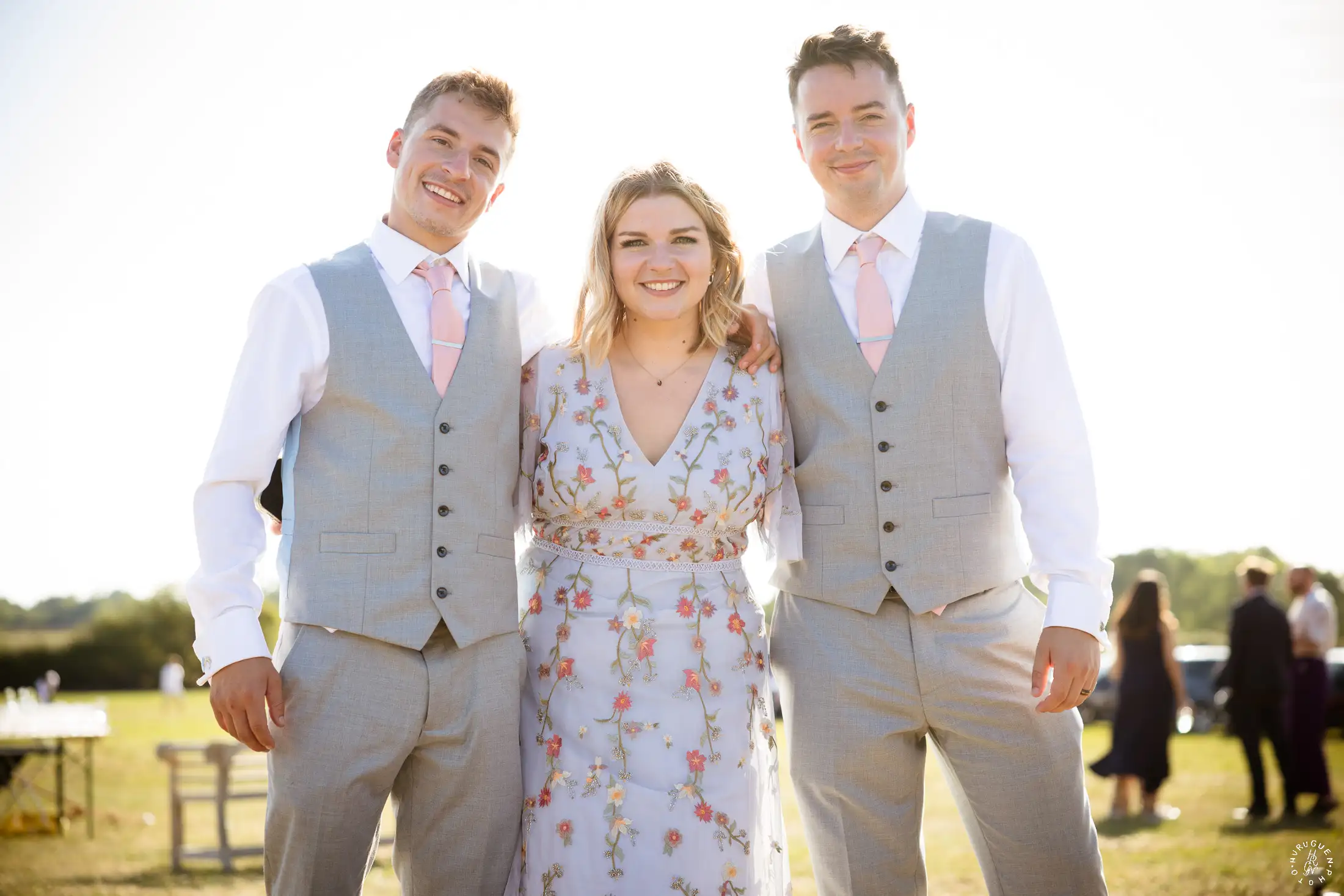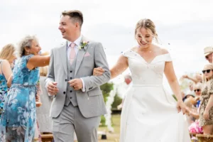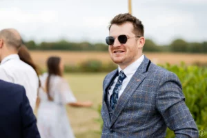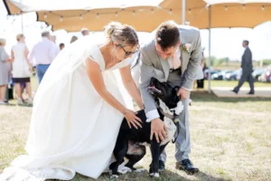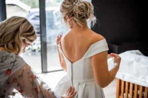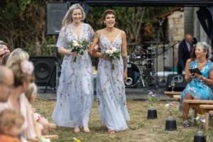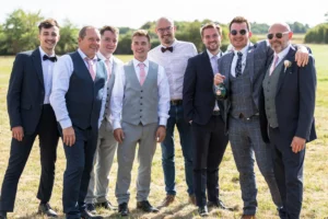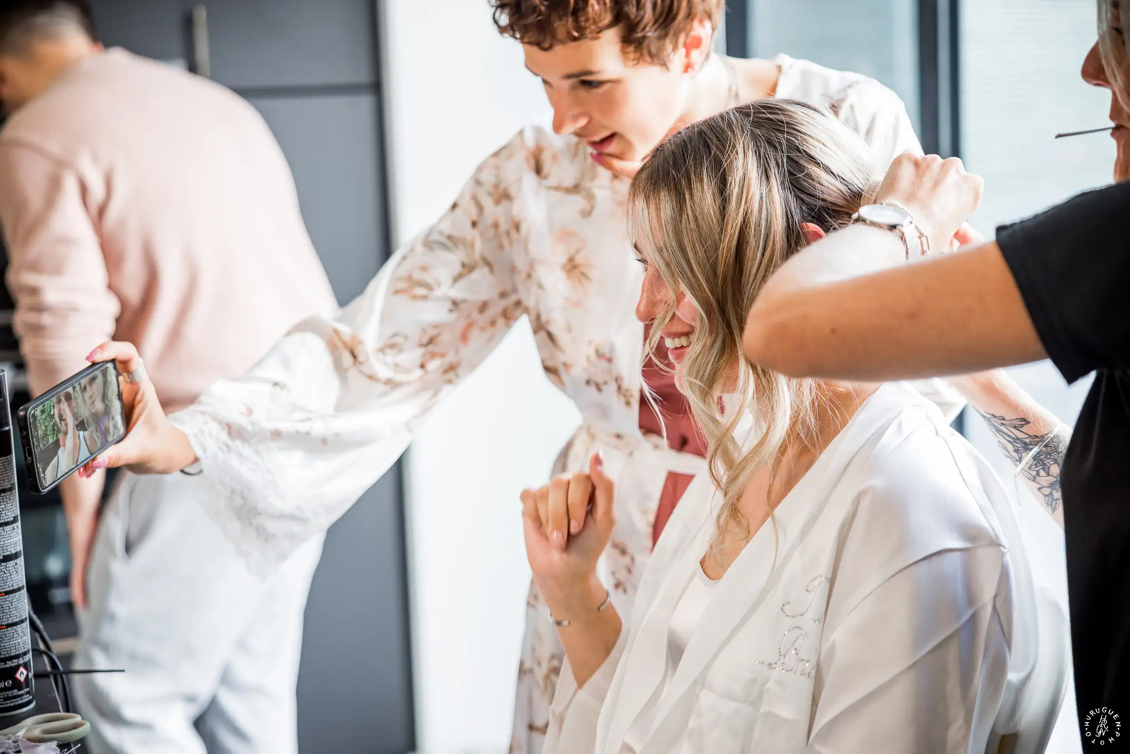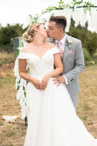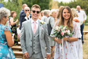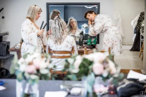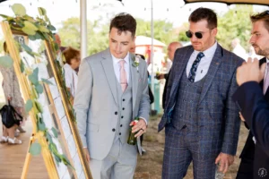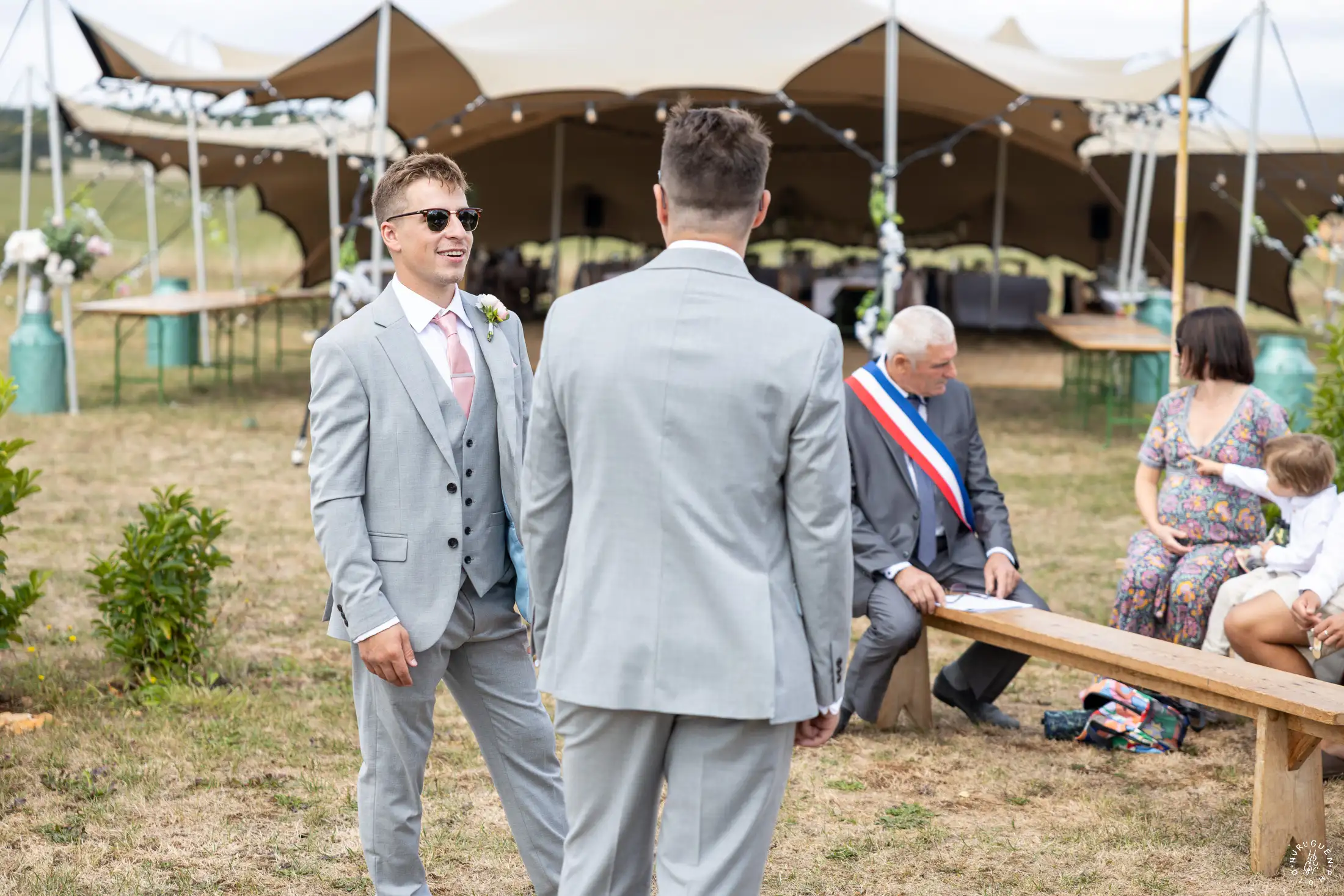 La journée a commencé dans une ambiance détendue. Entre les rires des demoiselles d’honneur et les préparatifs du marié, bière à la main avec ses témoins, le ton était donné : une fête sans chichis mais soignée dans les moindres détails. Le marié arborait un costume gris clair parfaitement coupé, rehaussé d’une cravate rose pâle, tandis que la mariée rayonnait dans une robe bustier d’une grande élégance.