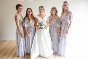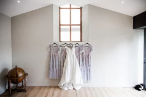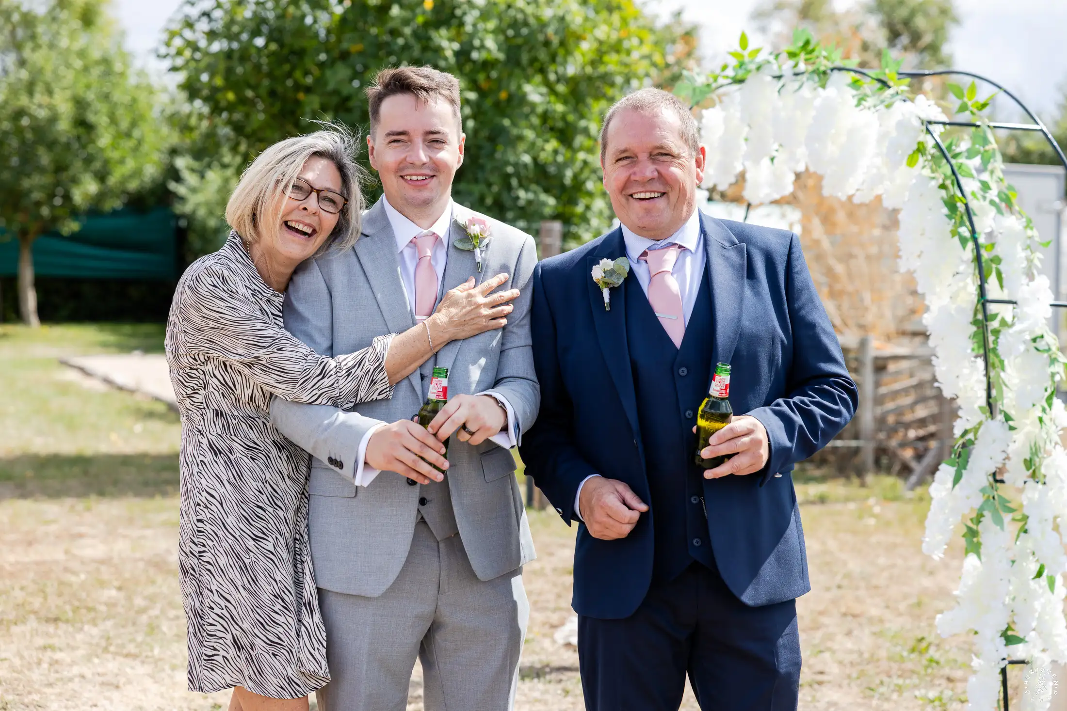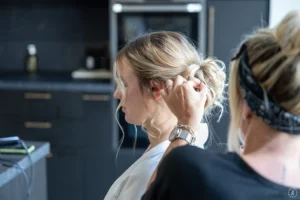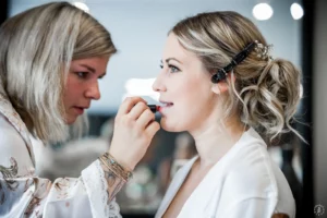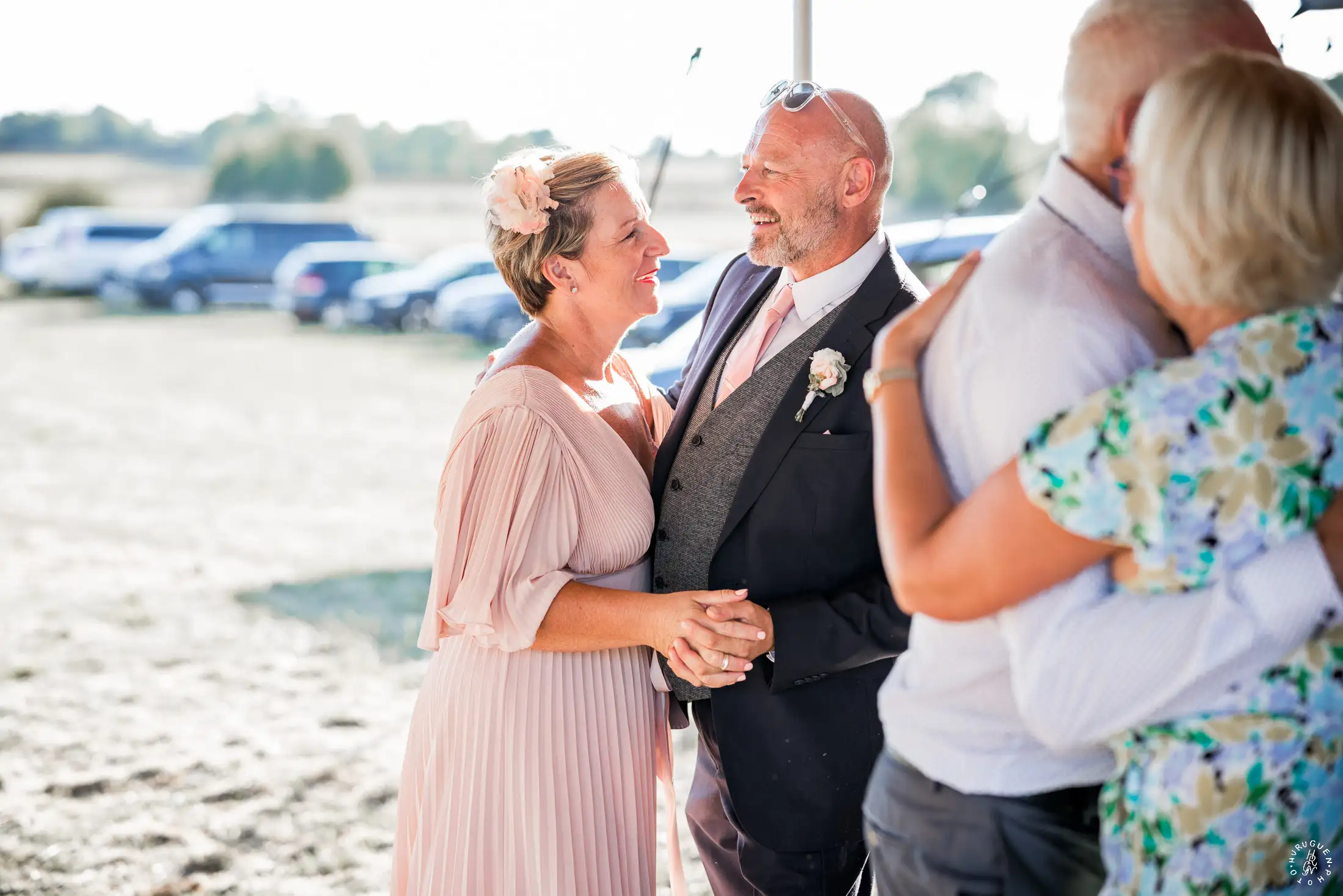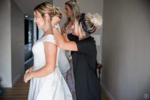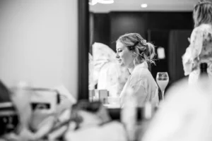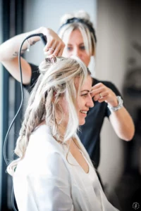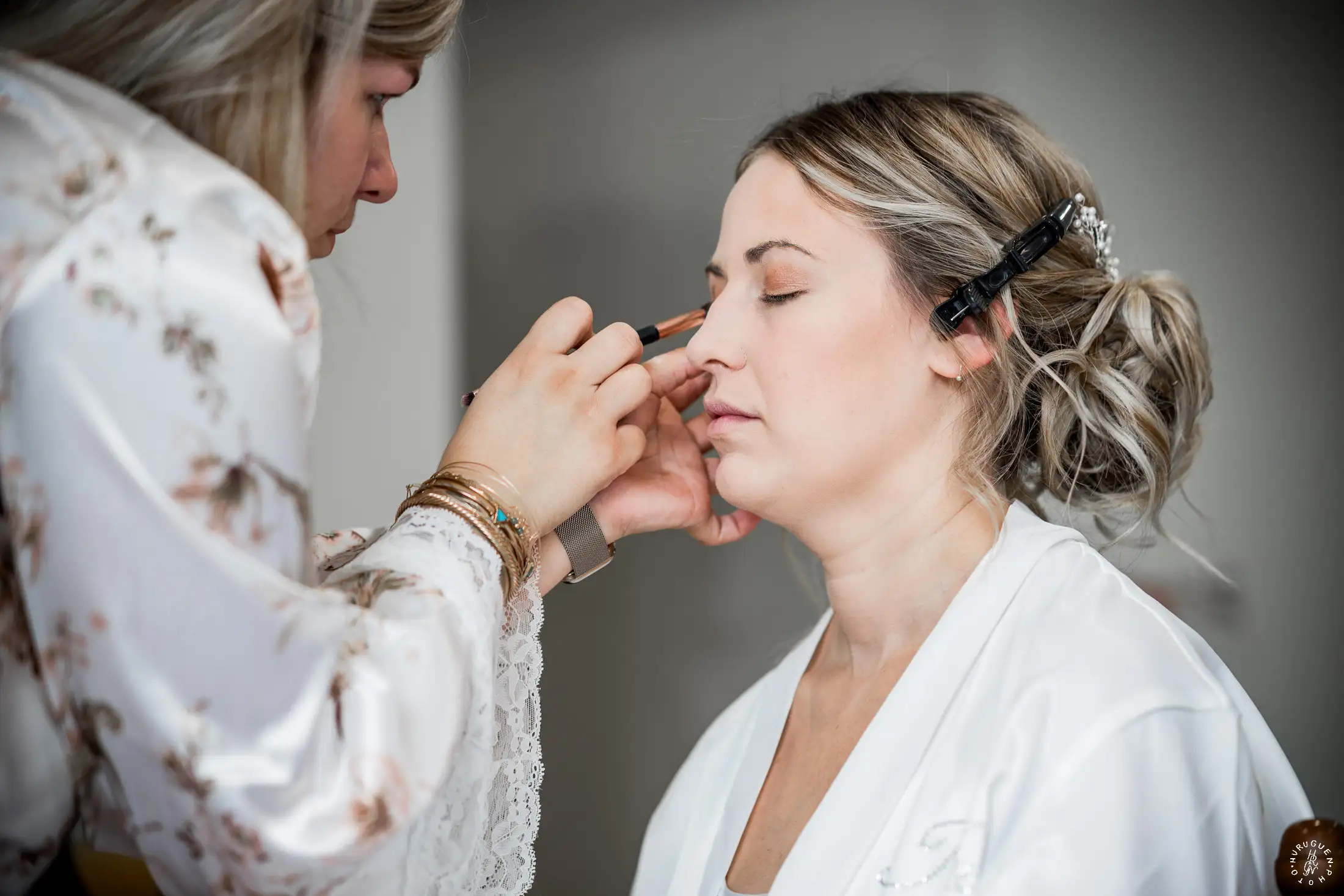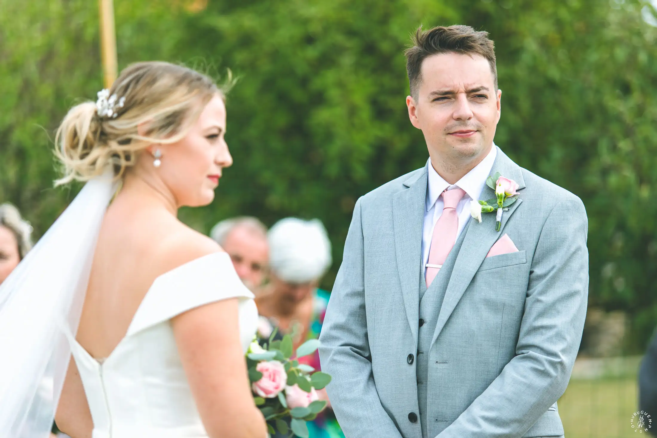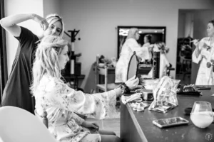 La journée a commencé dans une ambiance détendue. Entre les rires des demoiselles d’honneur et les préparatifs du marié, bière à la main avec ses témoins, le ton était donné : une fête sans chichis mais soignée dans les moindres détails. Le marié arborait un costume gris clair parfaitement coupé, rehaussé d’une cravate rose pâle, tandis que la mariée rayonnait dans une robe bustier d’une grande élégance.