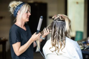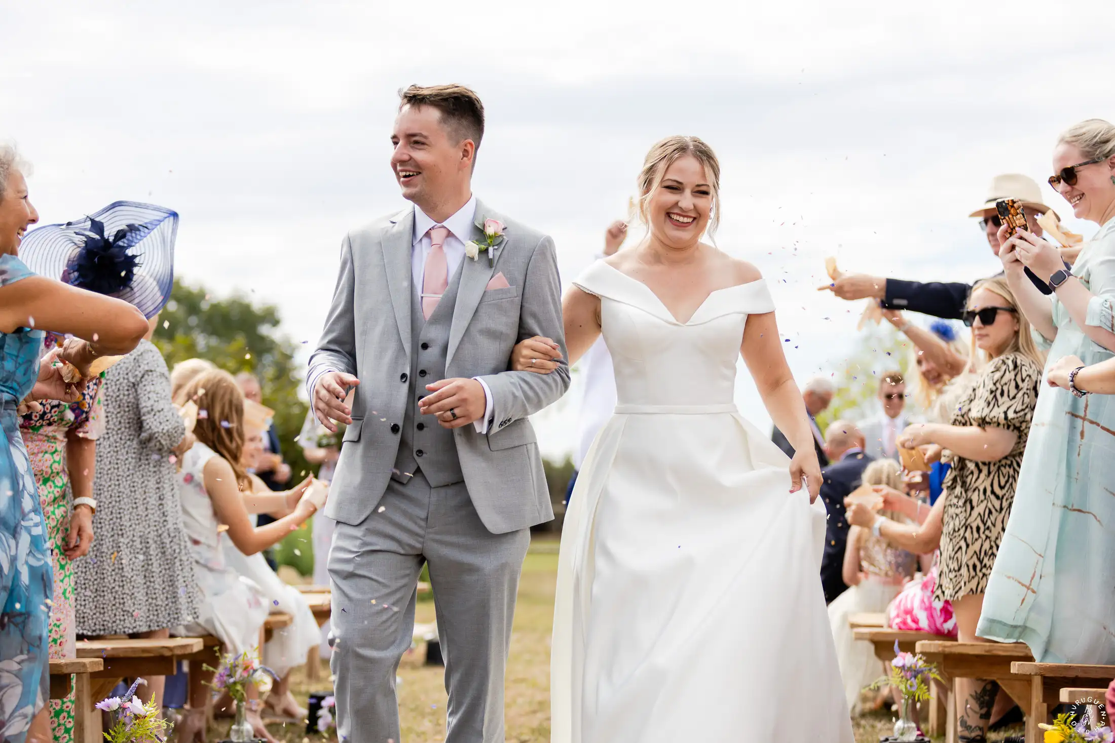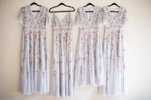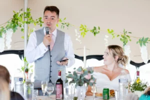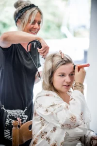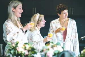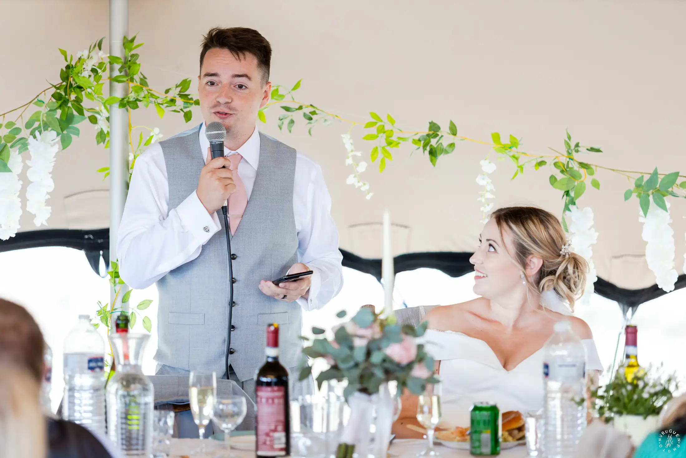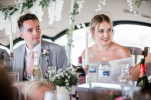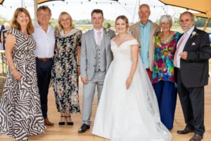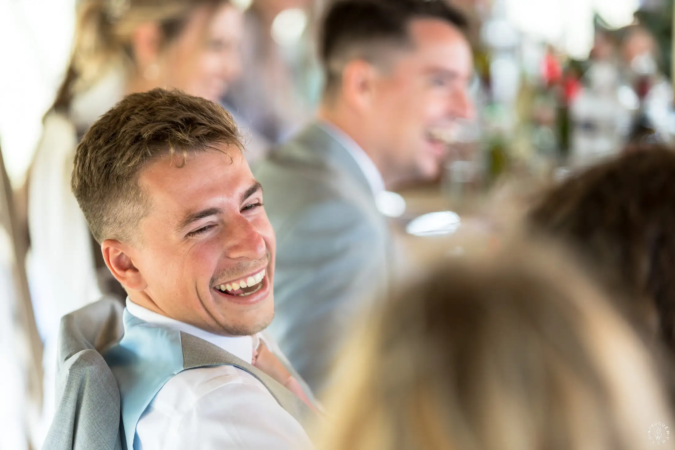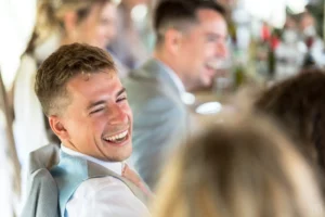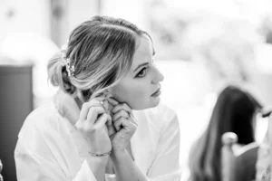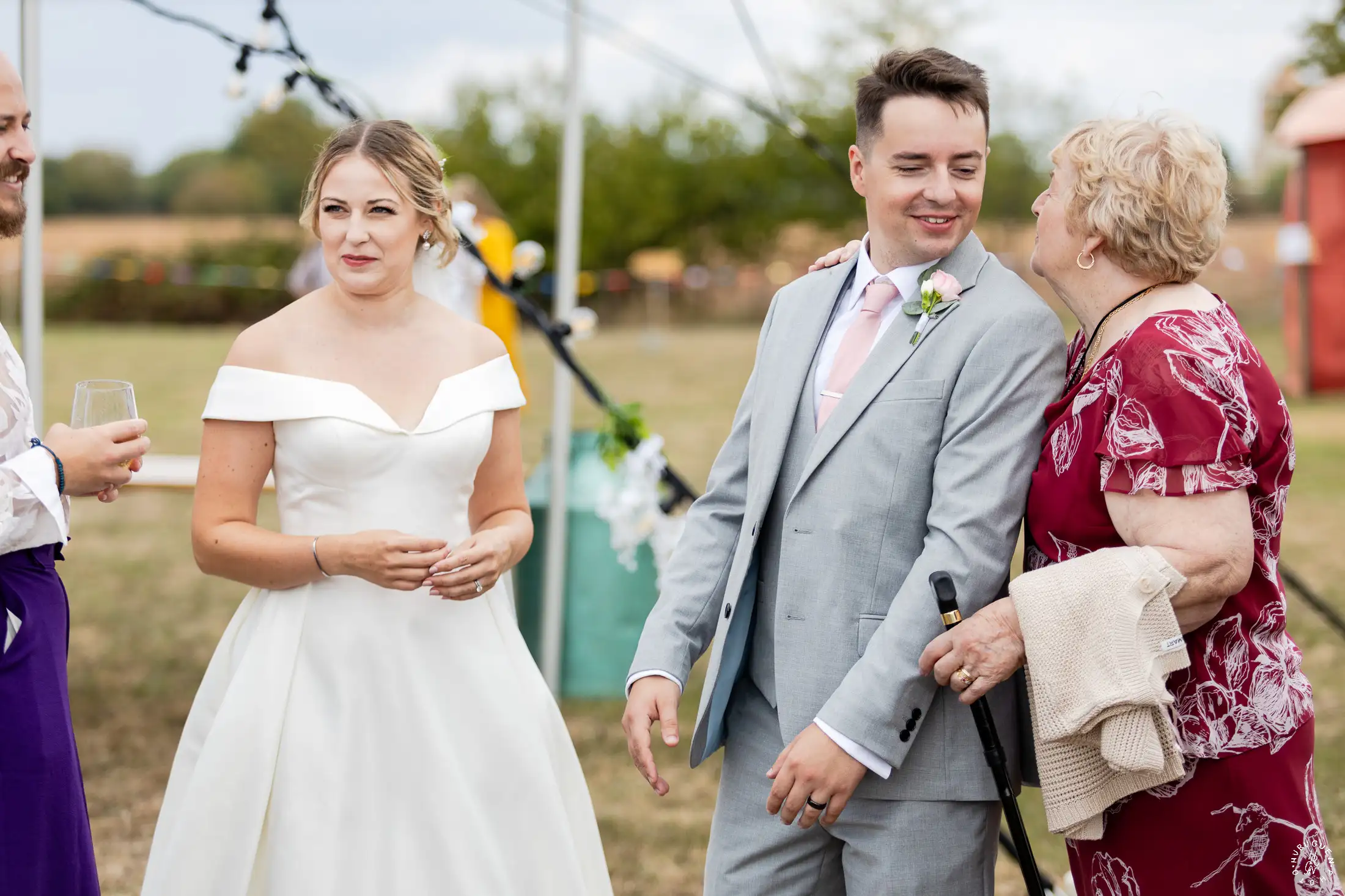 La journée a commencé dans une ambiance détendue. Entre les rires des demoiselles d’honneur et les préparatifs du marié, bière à la main avec ses témoins, le ton était donné : une fête sans chichis mais soignée dans les moindres détails. Le marié arborait un costume gris clair parfaitement coupé, rehaussé d’une cravate rose pâle, tandis que la mariée rayonnait dans une robe bustier d’une grande élégance.