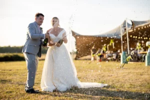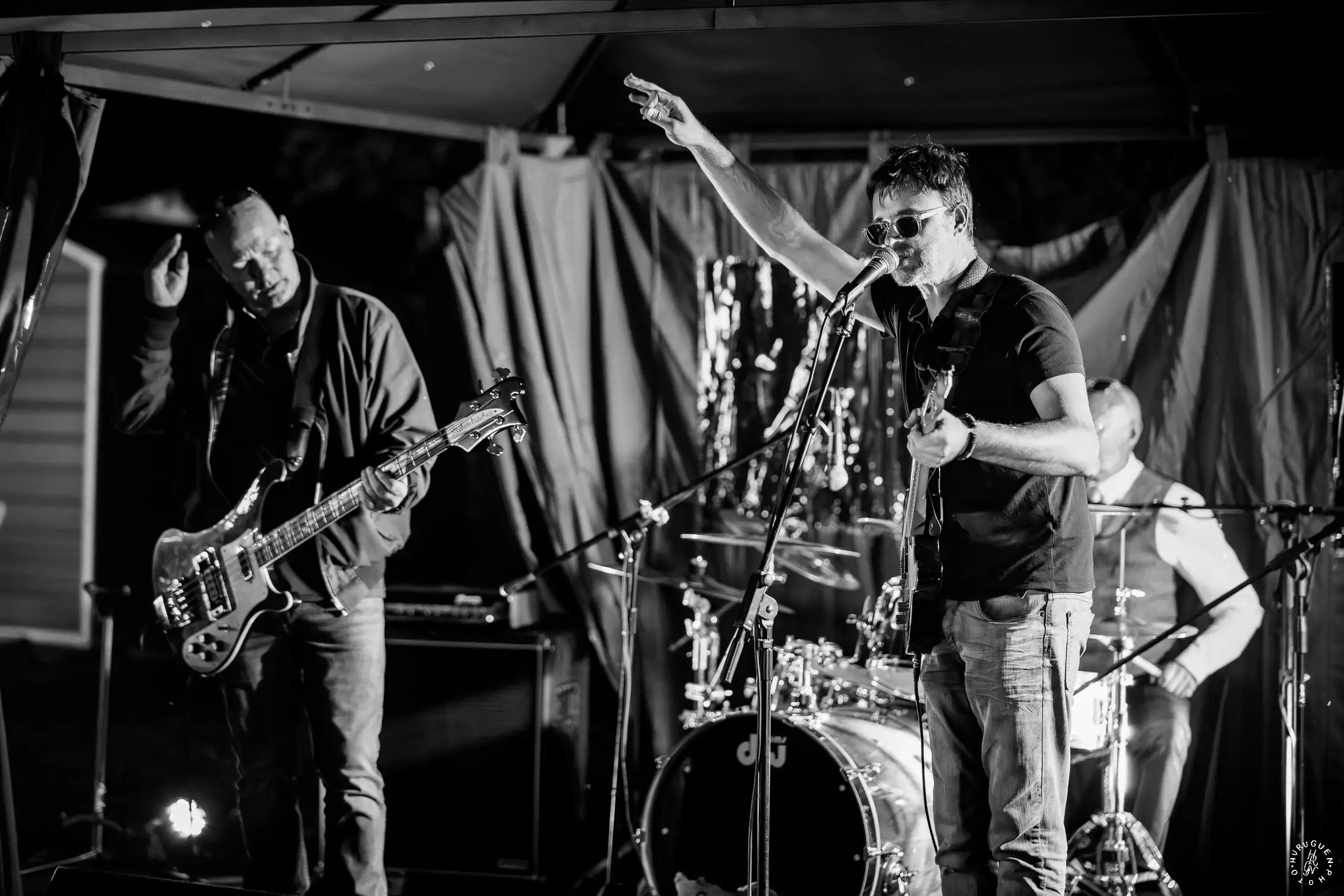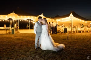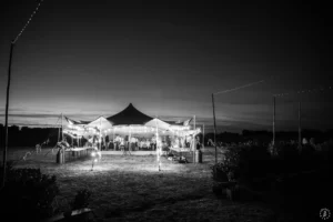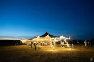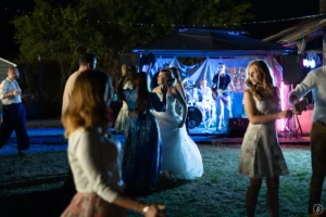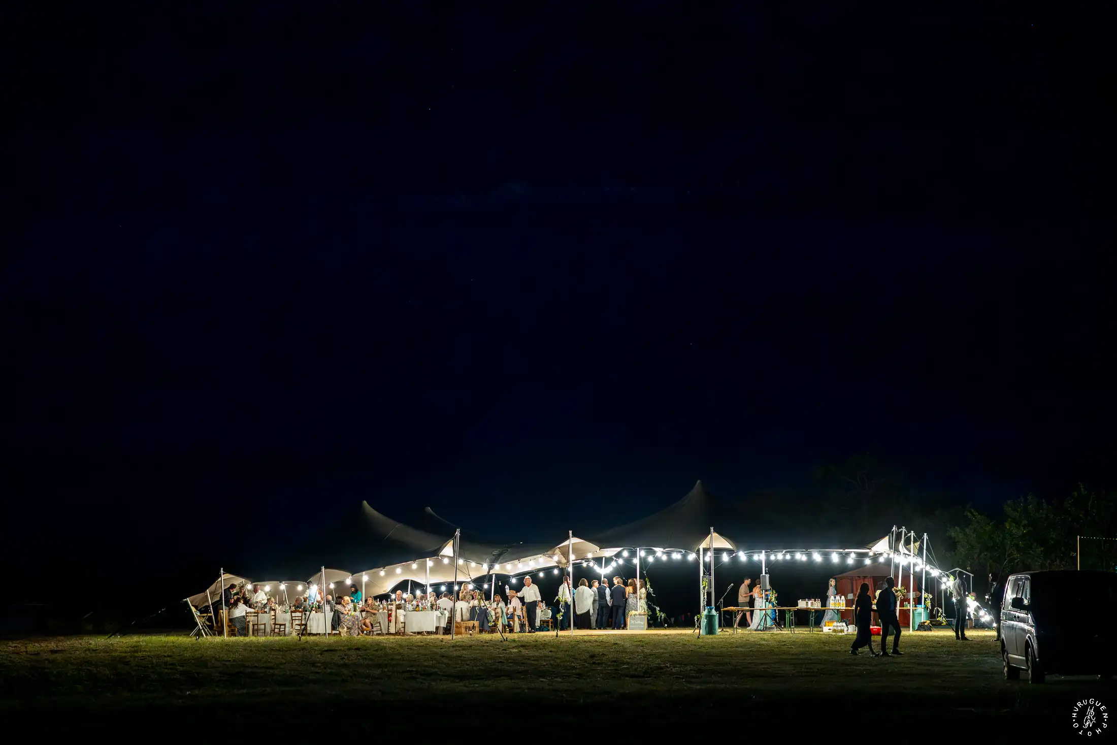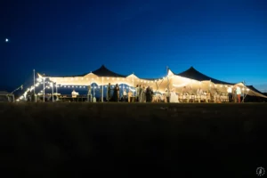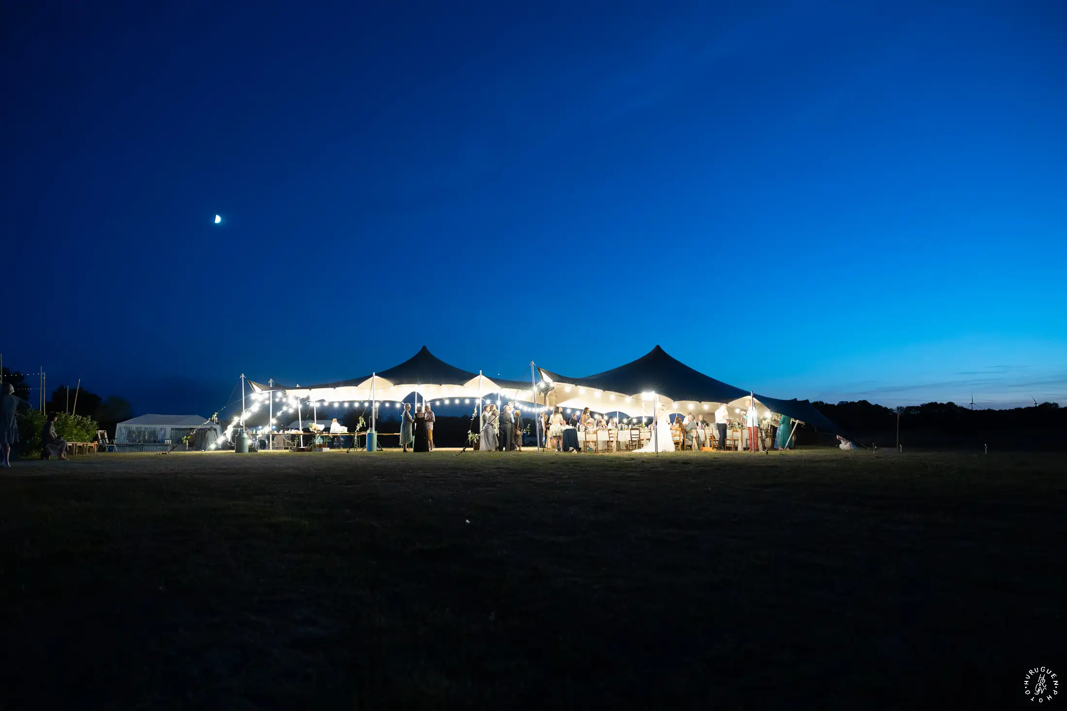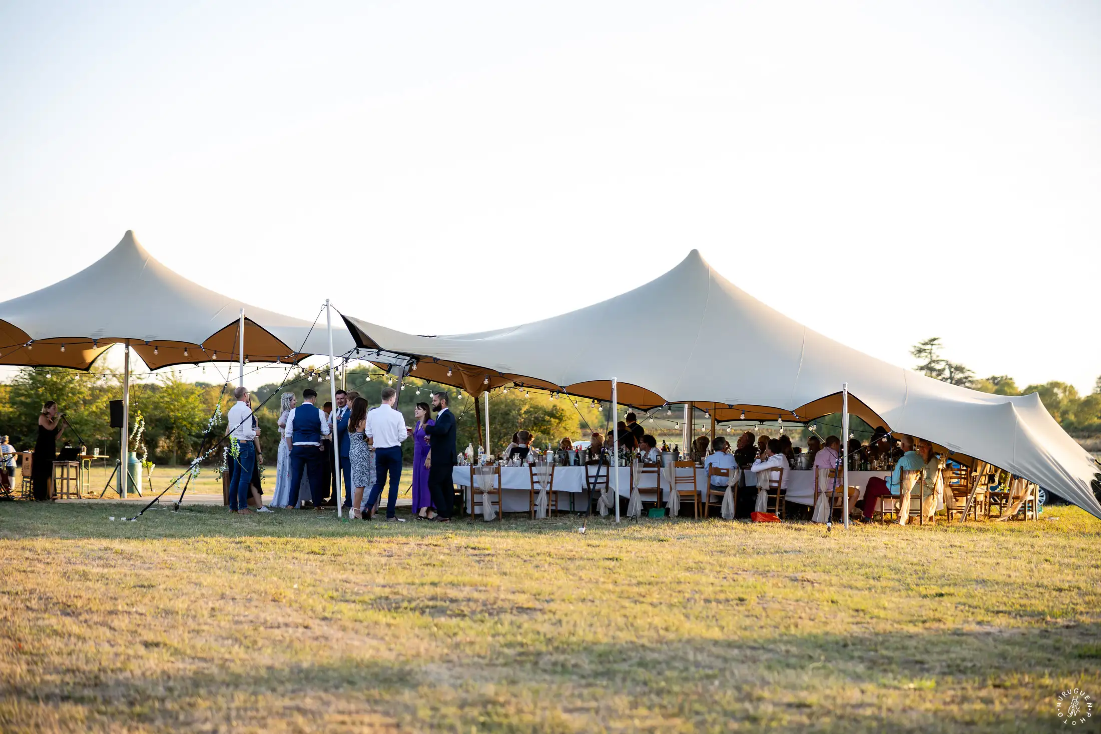 La soirée s’est poursuivie sous une magnifique tente stretch (nomade), illuminée par des guirlandes guinguettes. Le point d’orgue de la réception a sans aucun doute été l’énergie du groupe de rock live. Guitares électriques et rythmiques entraînantes ont transformé le dîner en un véritable concert privé, où les mariés n’ont pas hésité à trinquer au goulot pour célébrer leur bonheur.