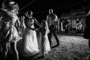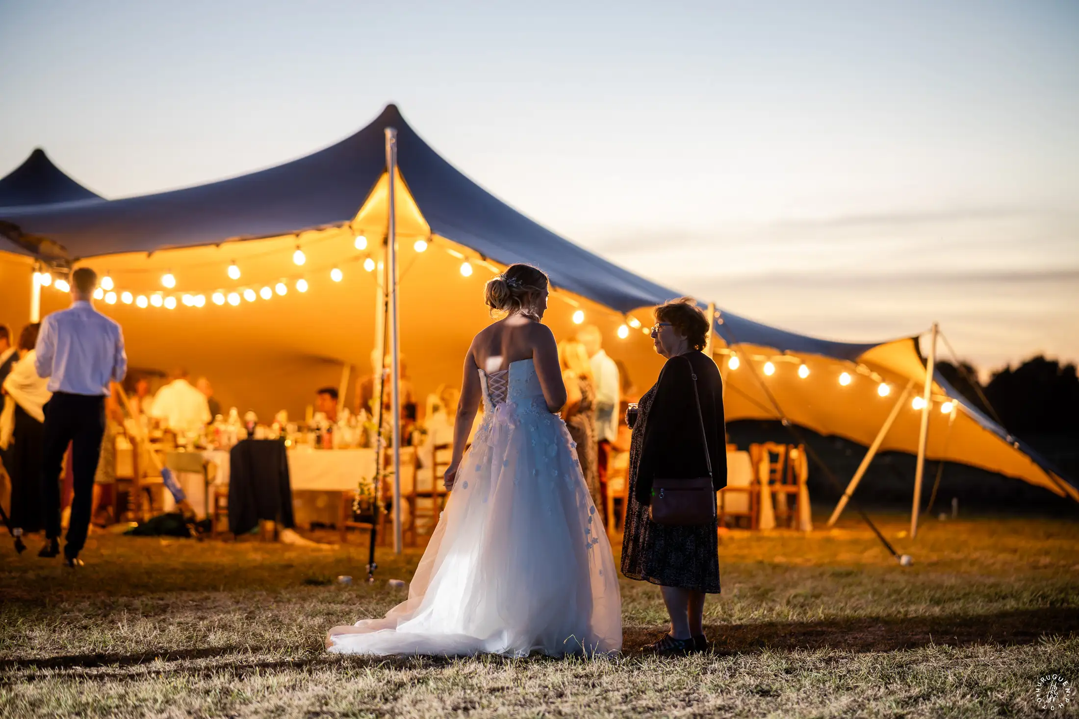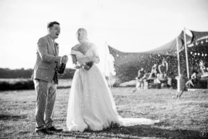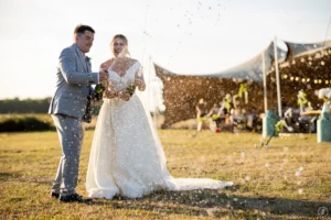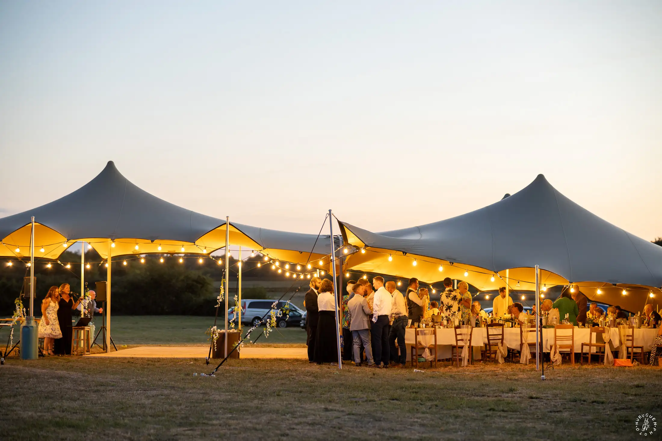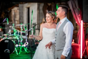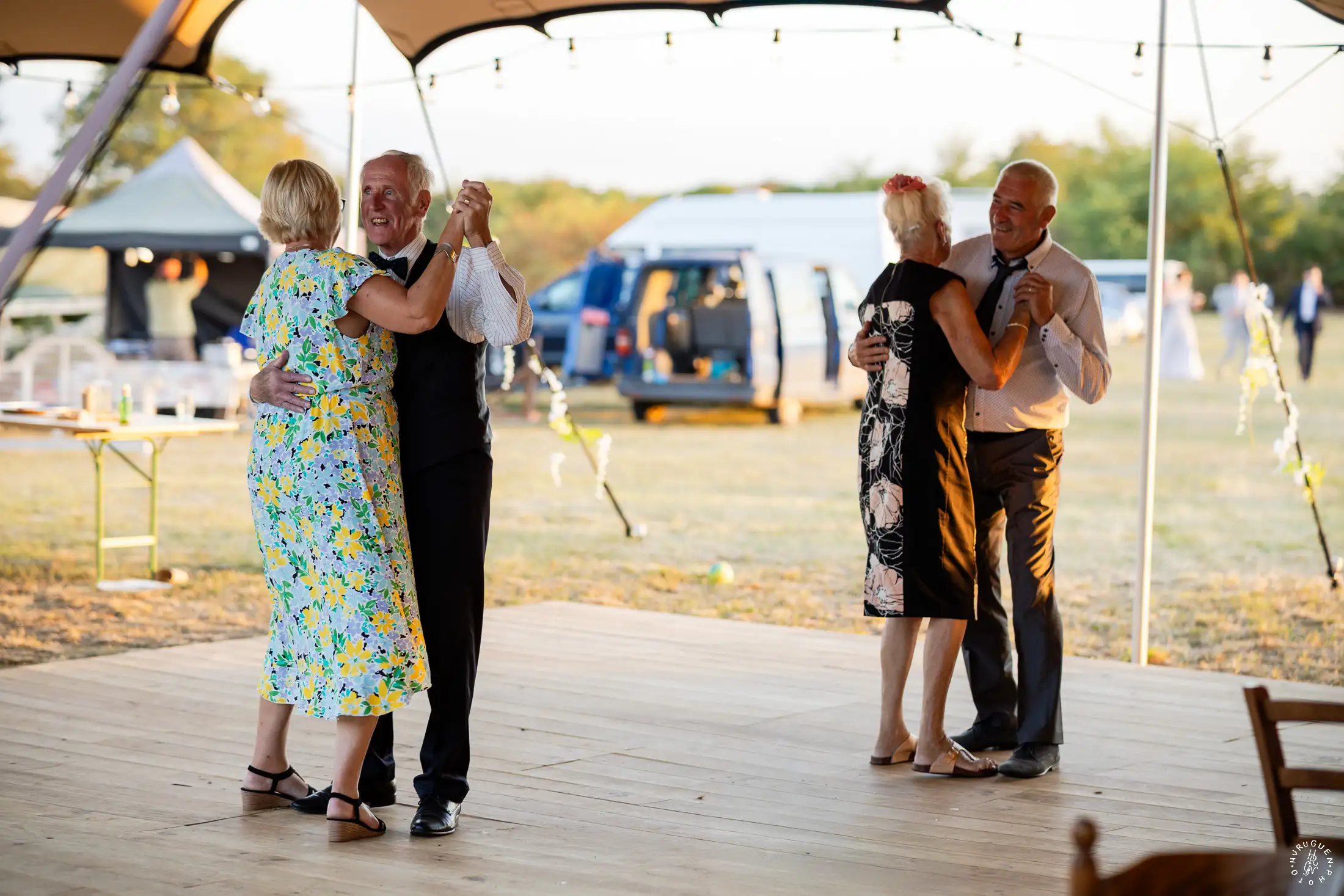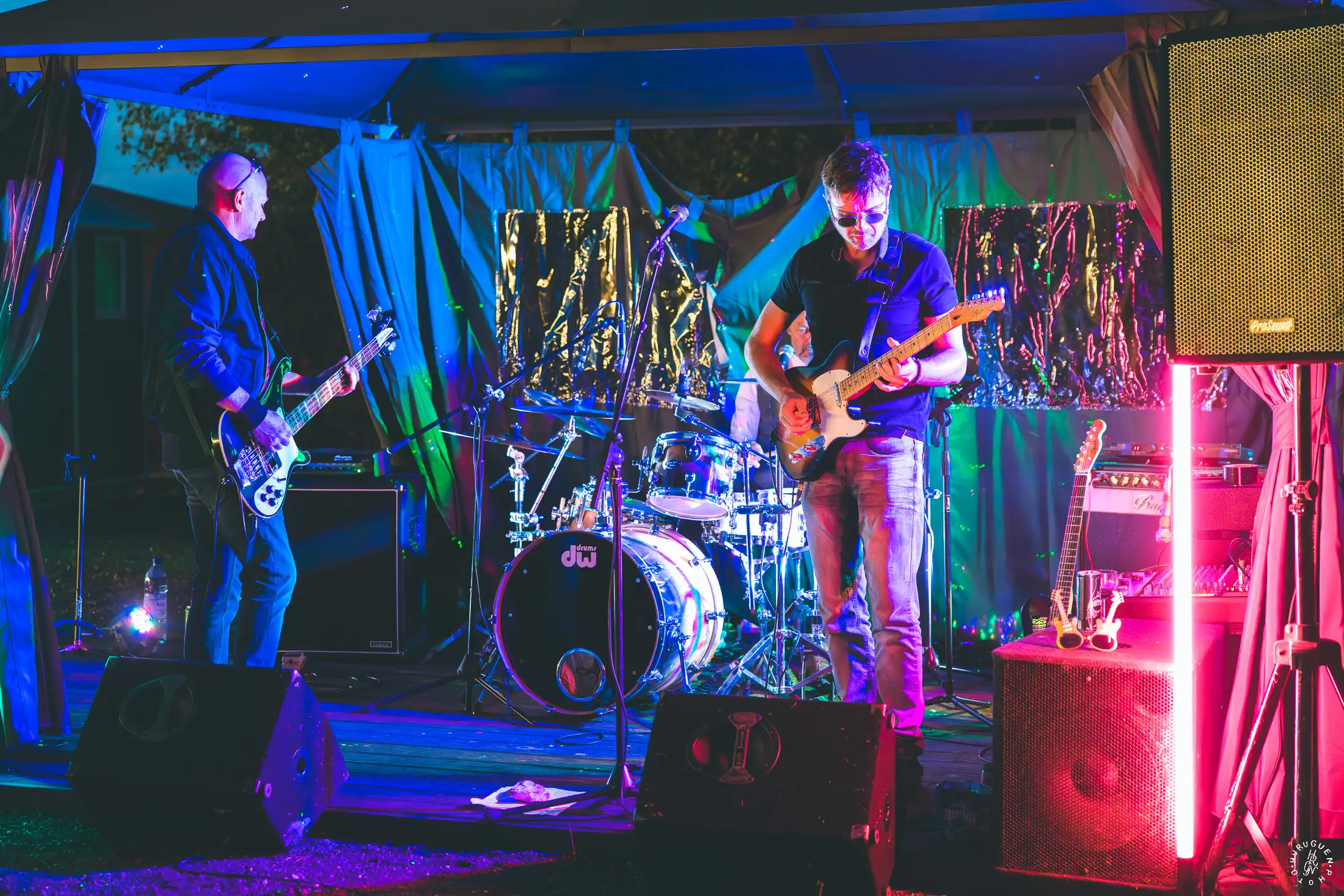 La soirée s’est poursuivie sous une magnifique tente stretch (nomade), illuminée par des guirlandes guinguettes. Le point d’orgue de la réception a sans aucun doute été l’énergie du groupe de rock live. Guitares électriques et rythmiques entraînantes ont transformé le dîner en un véritable concert privé, où les mariés n’ont pas hésité à trinquer au goulot pour célébrer leur bonheur.