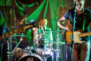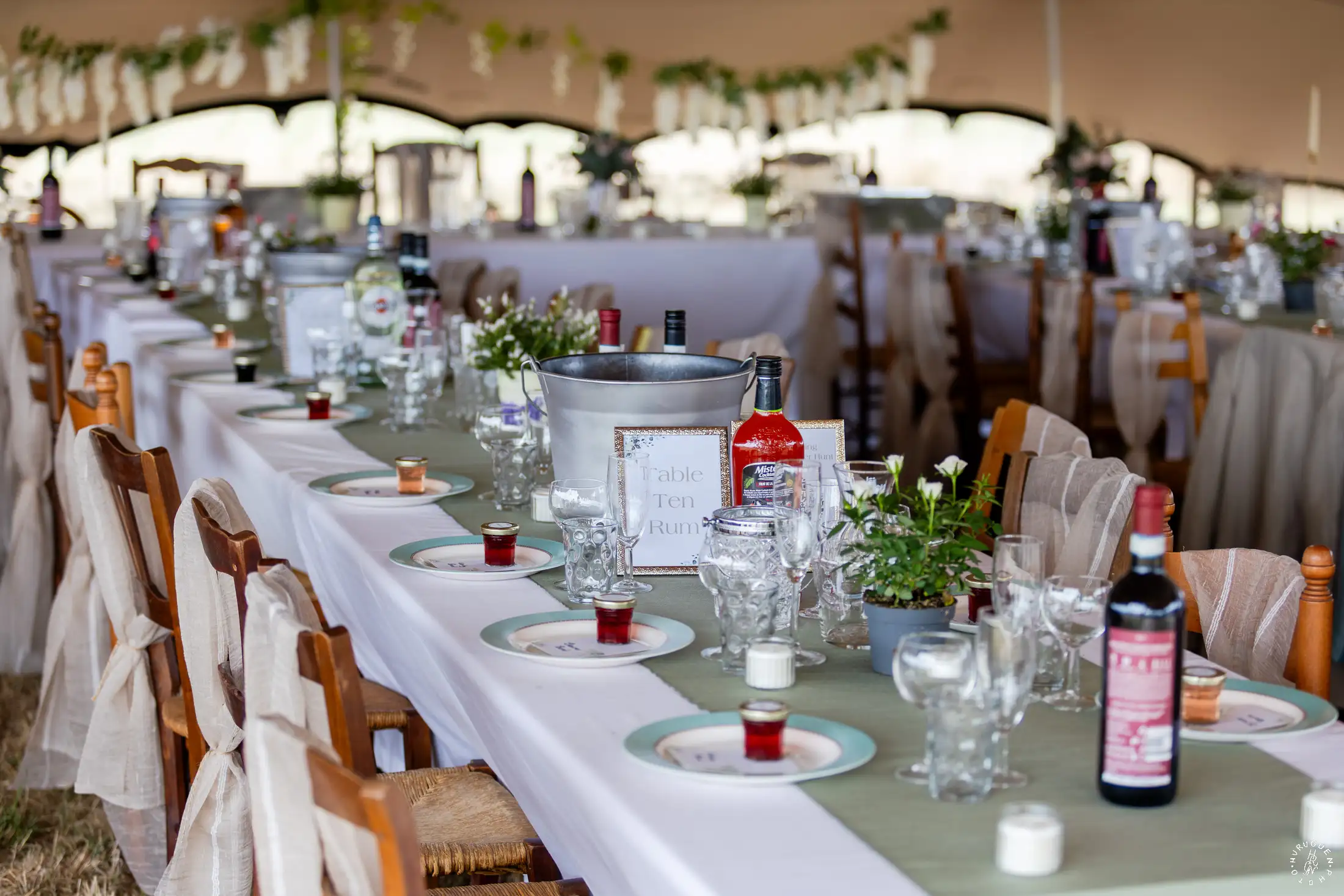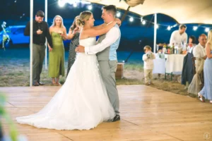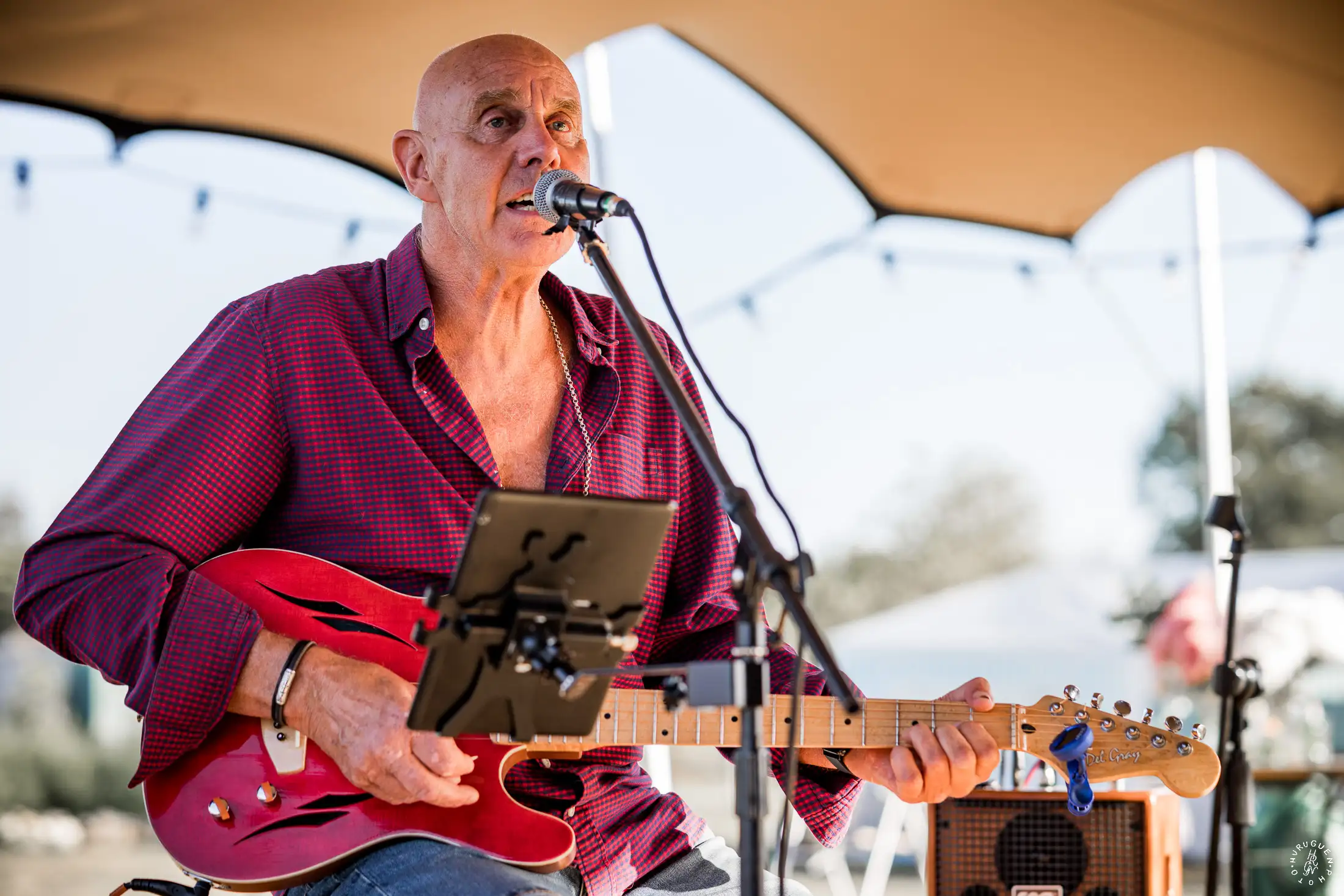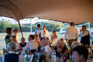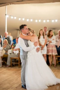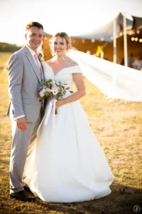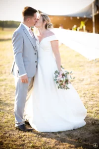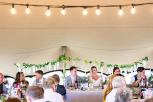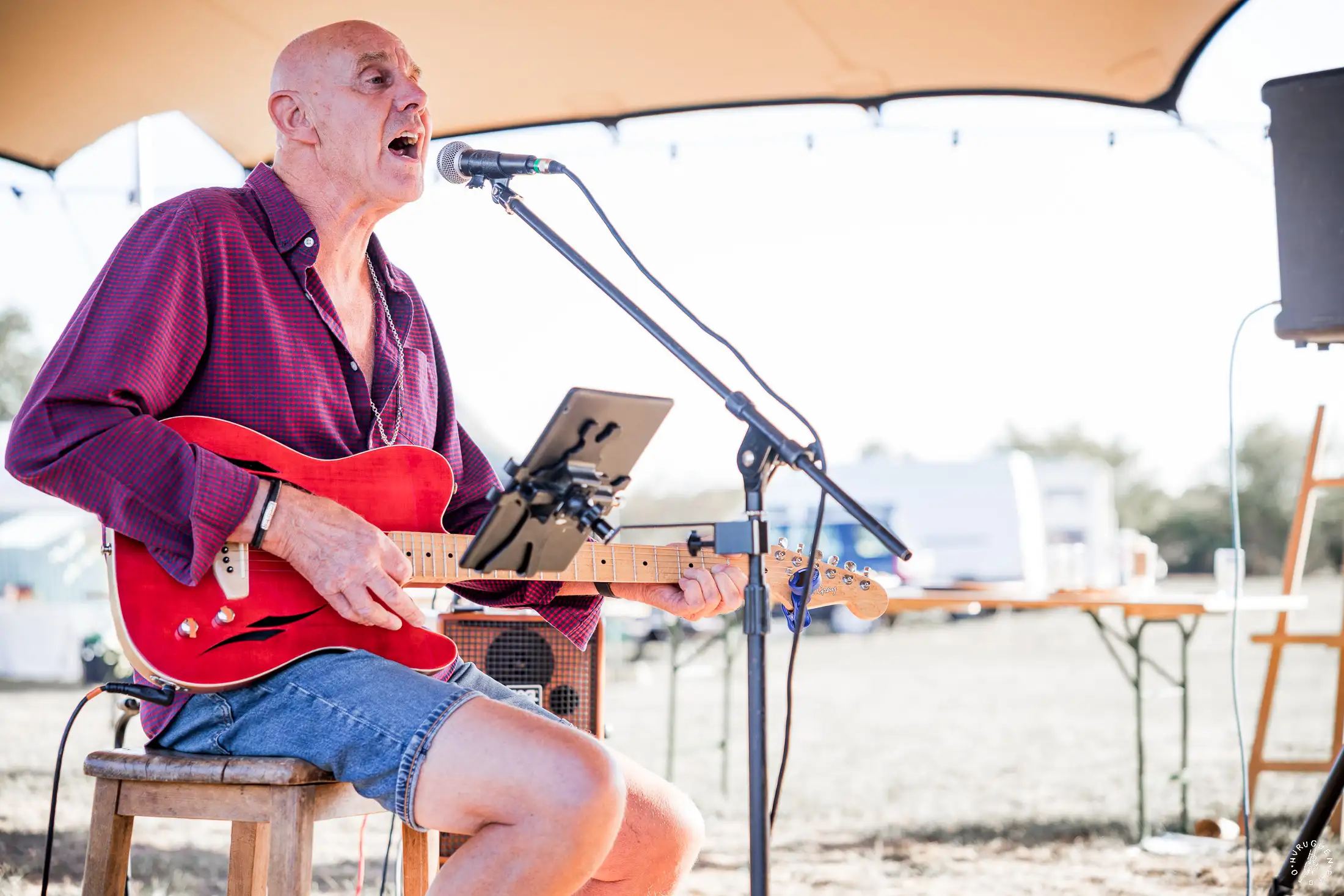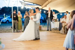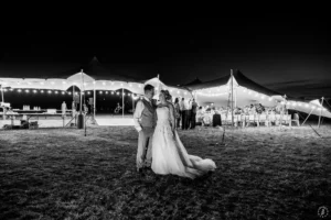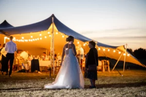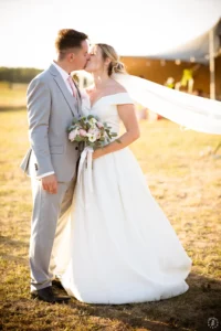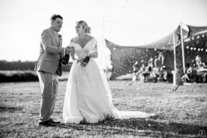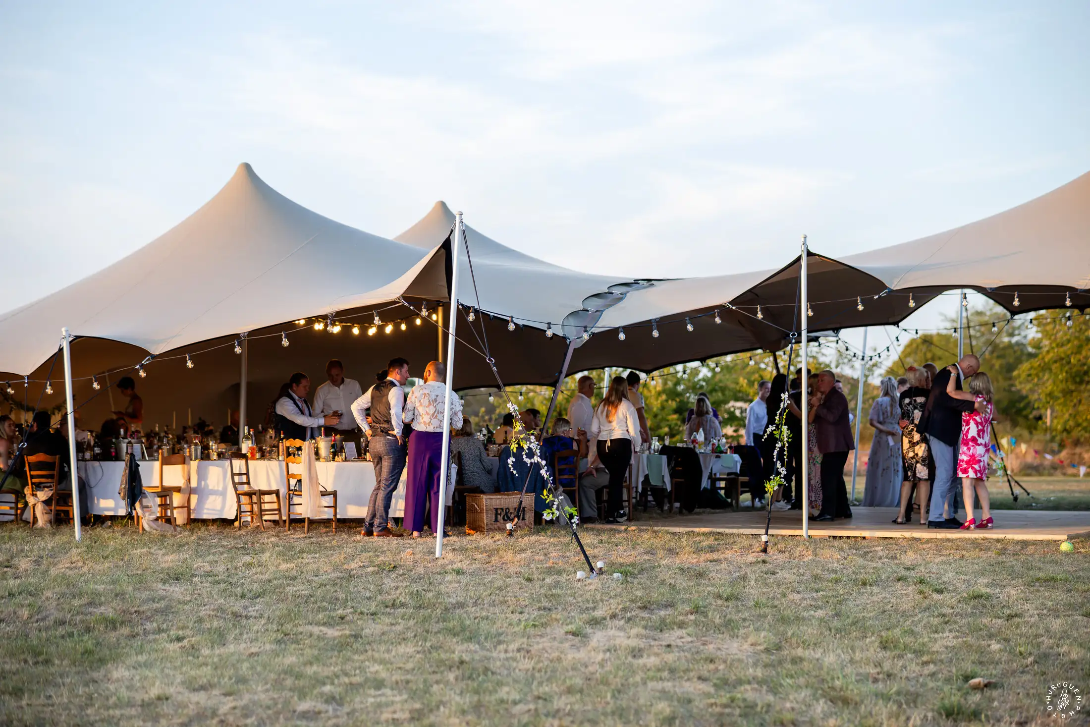La soirée s’est poursuivie sous une magnifique tente stretch (nomade), illuminée par des guirlandes guinguettes. Le point d’orgue de la réception a sans aucun doute été l’énergie du groupe de rock live. Guitares électriques et rythmiques entraînantes ont transformé le dîner en un véritable concert privé, où les mariés n’ont pas hésité à trinquer au goulot pour célébrer leur bonheur.