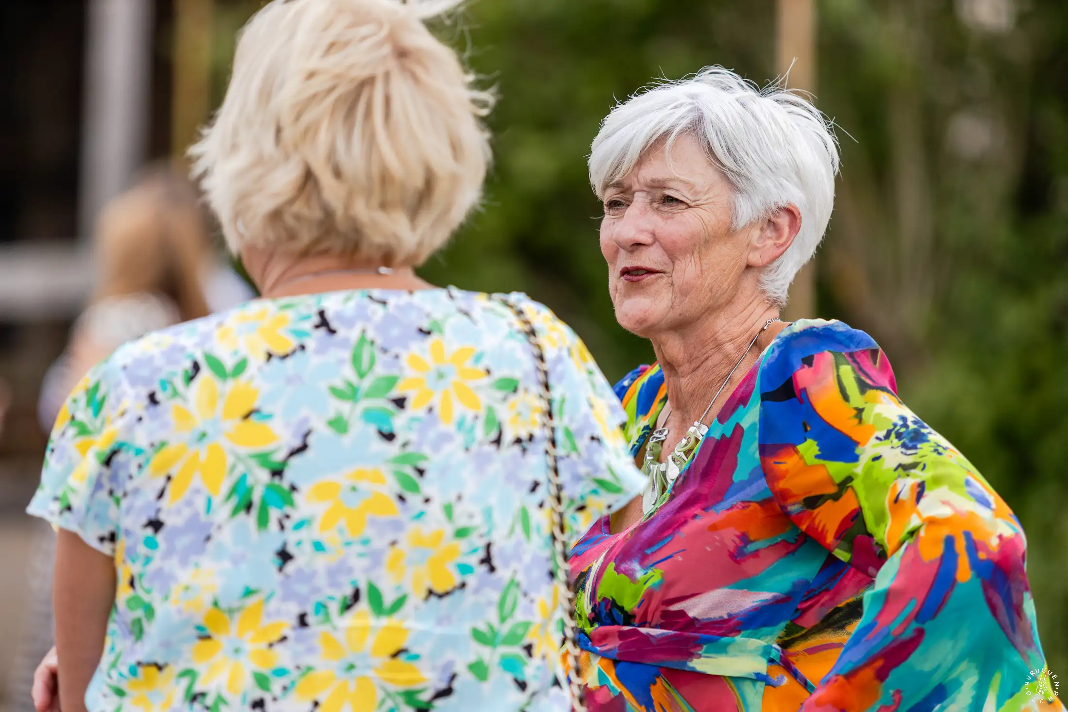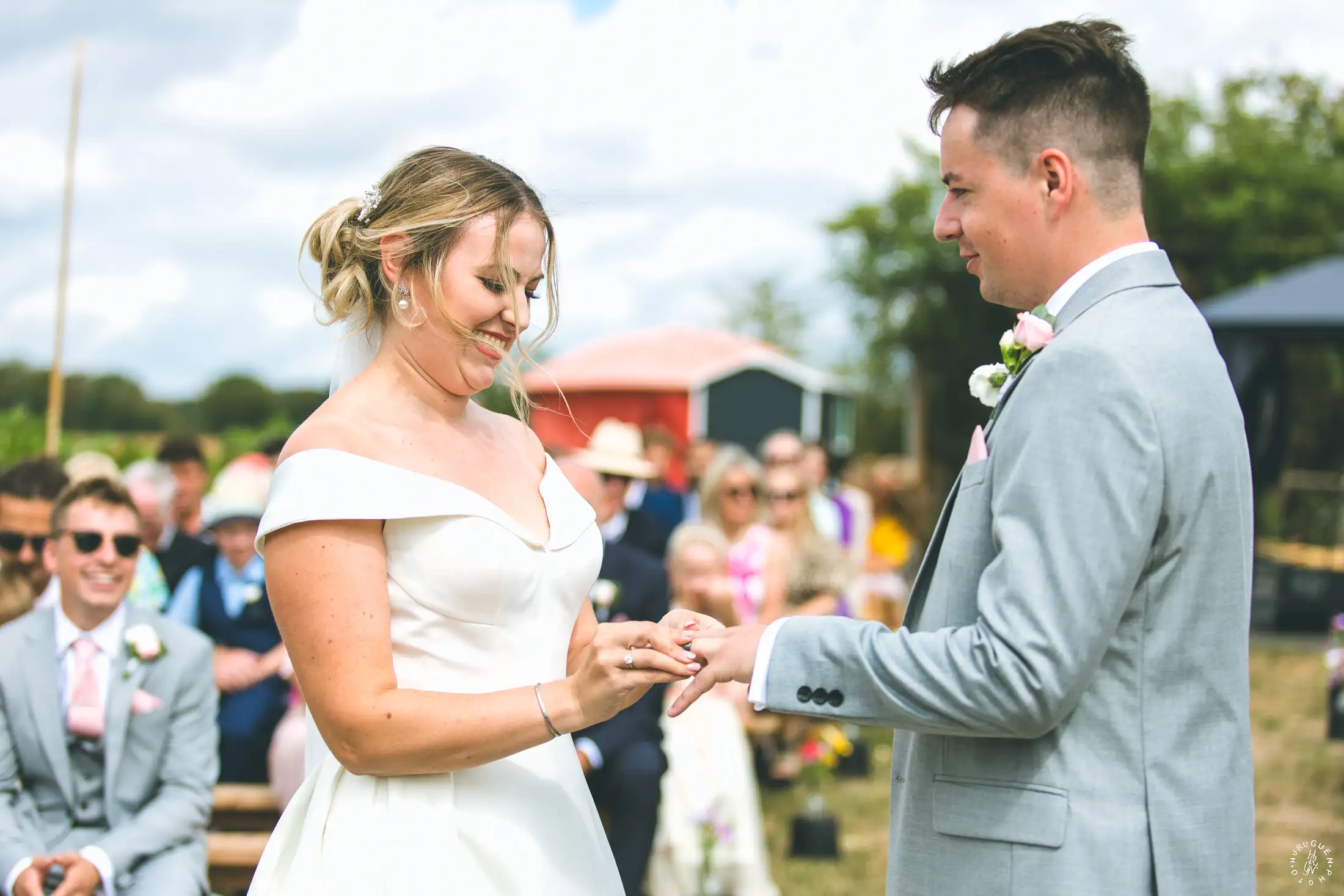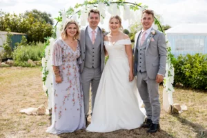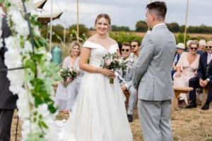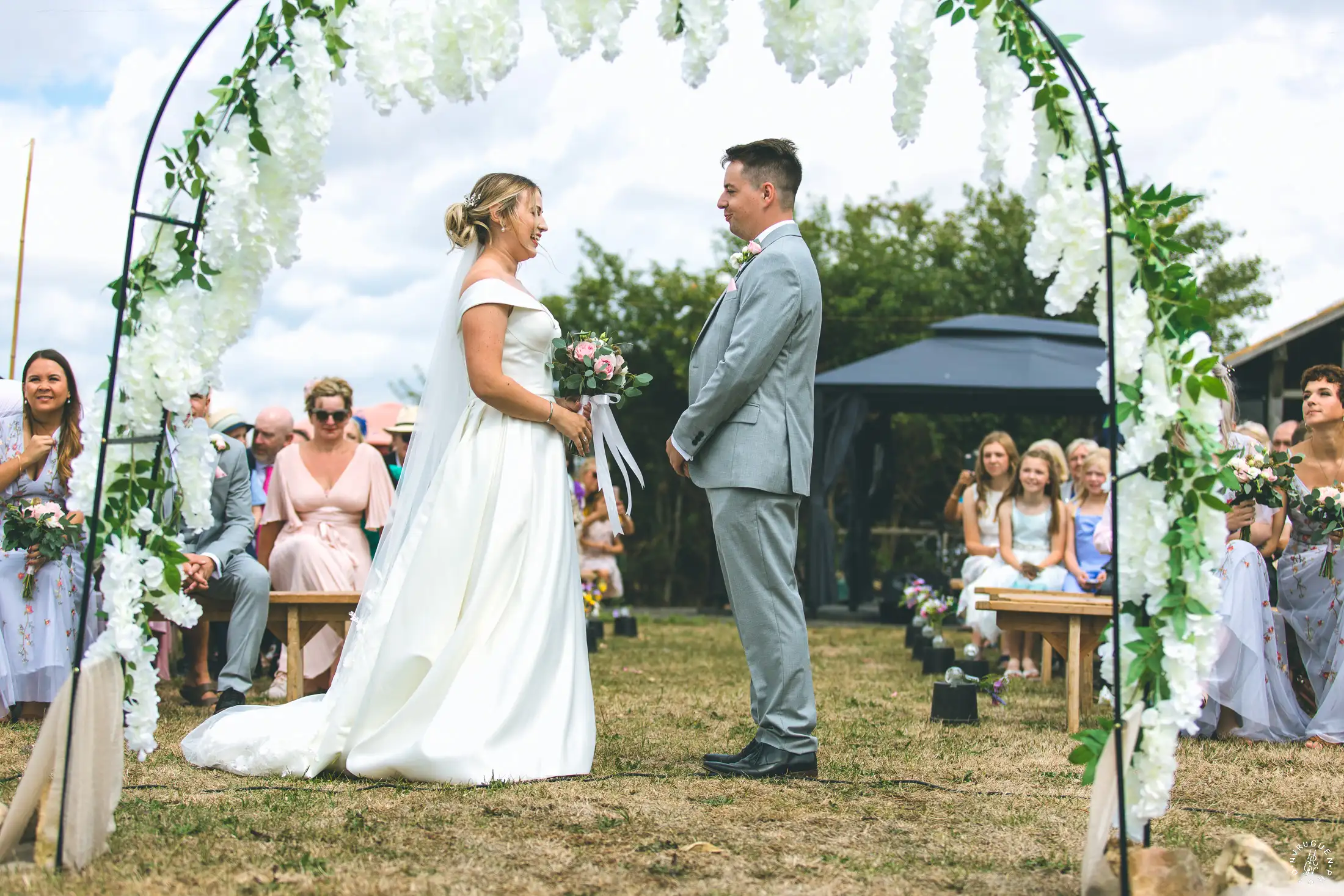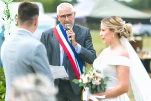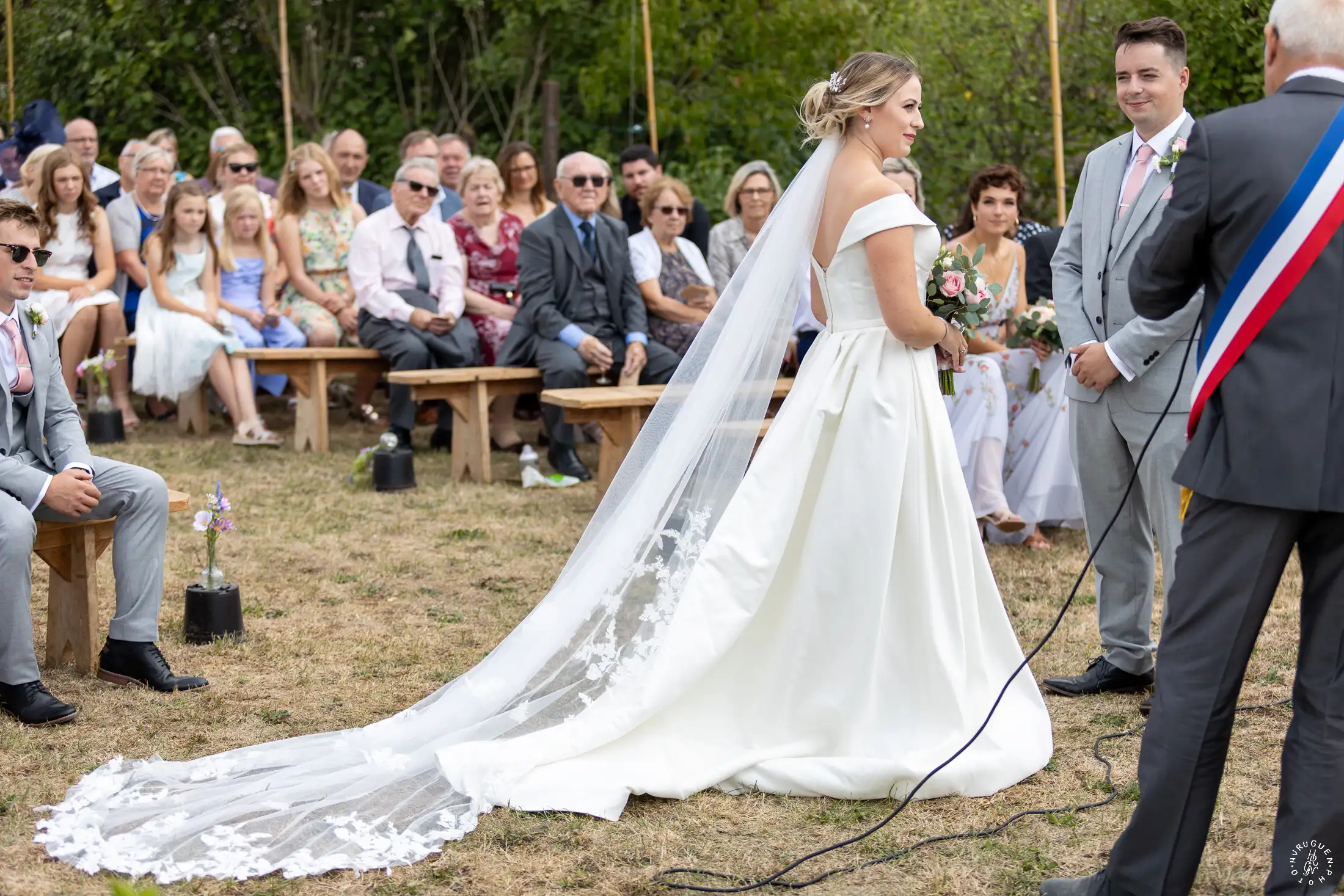 Le jardin familial s’est transformé, le temps d’un après-midi, en un écrin de verdure pour la cérémonie laïque. Sous une arche sobre fleurie de blanc, le couple a échangé ses vœux devant ses proches.