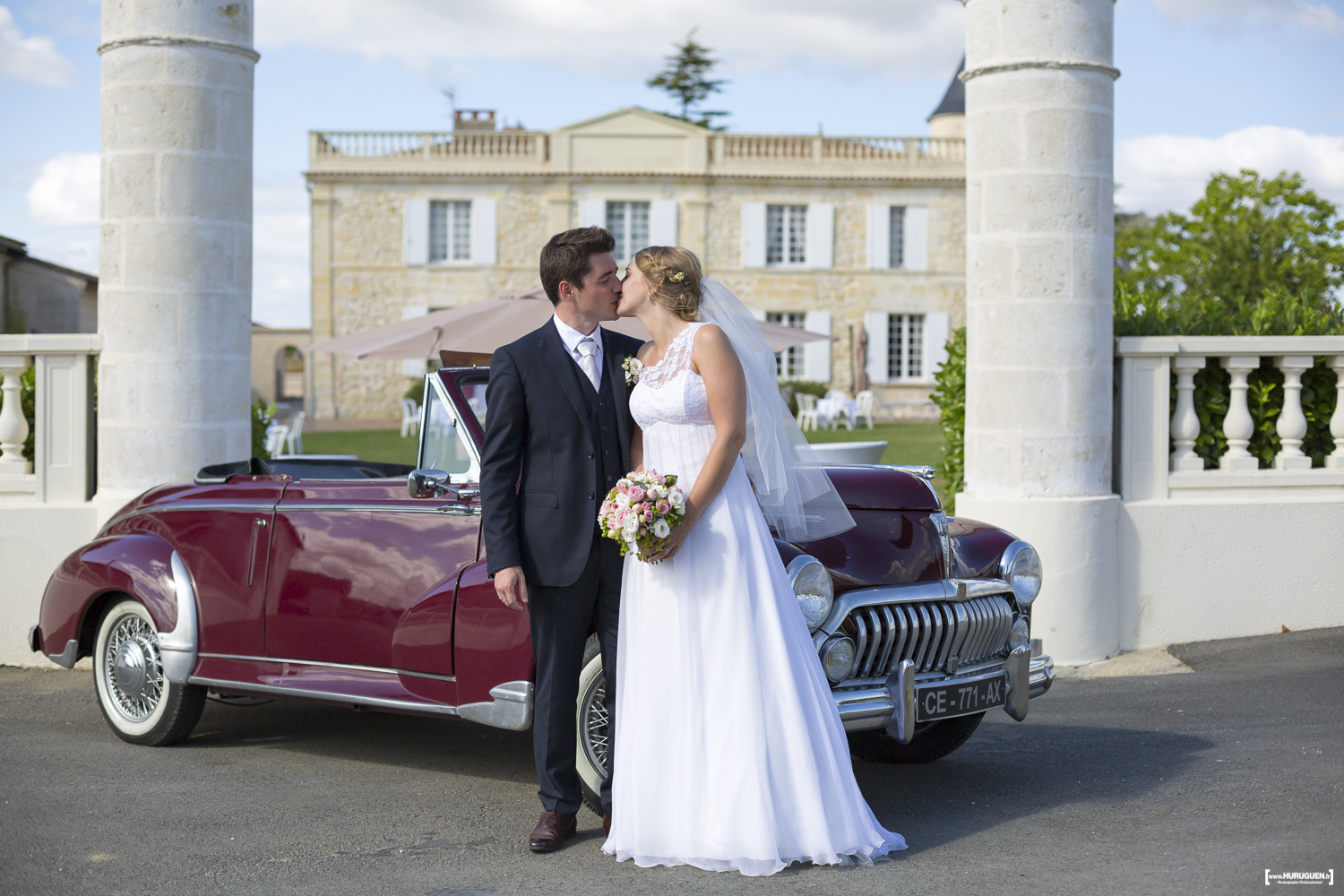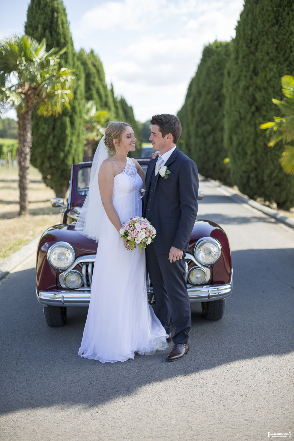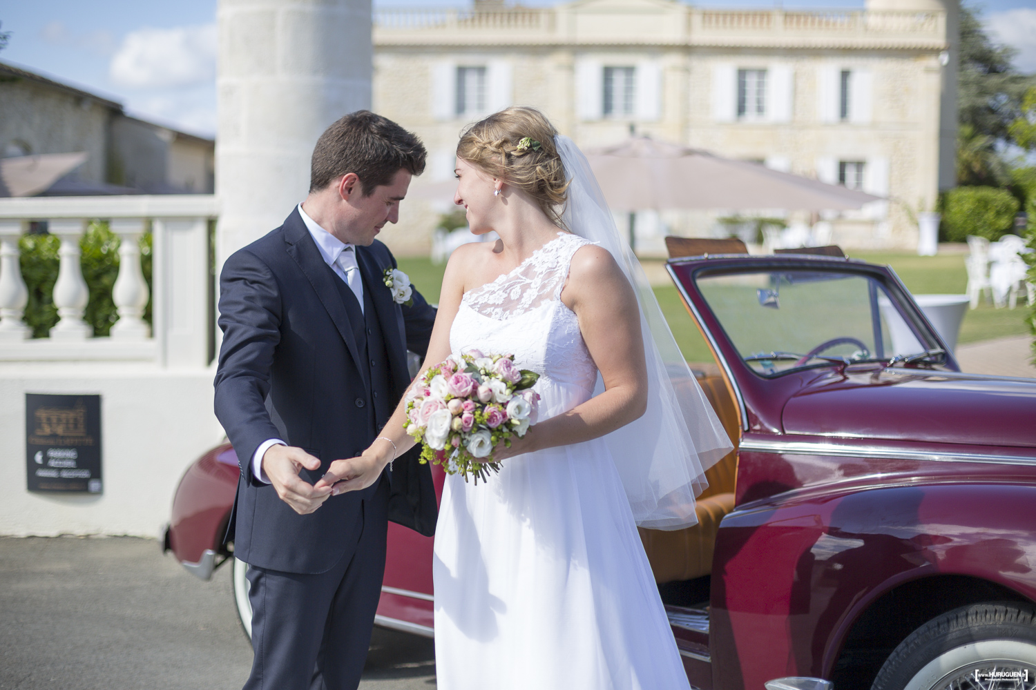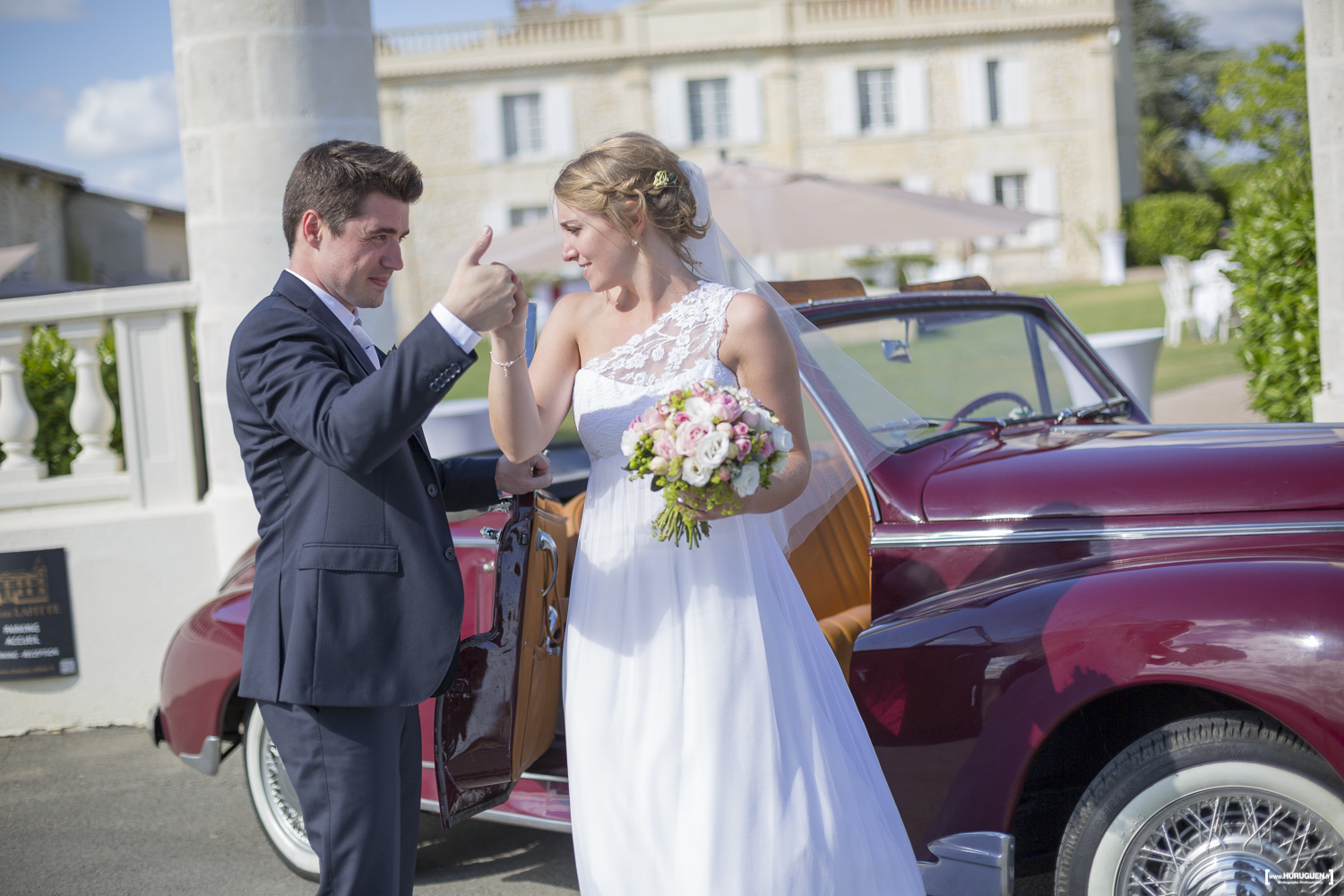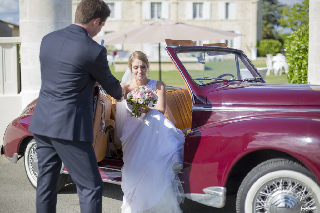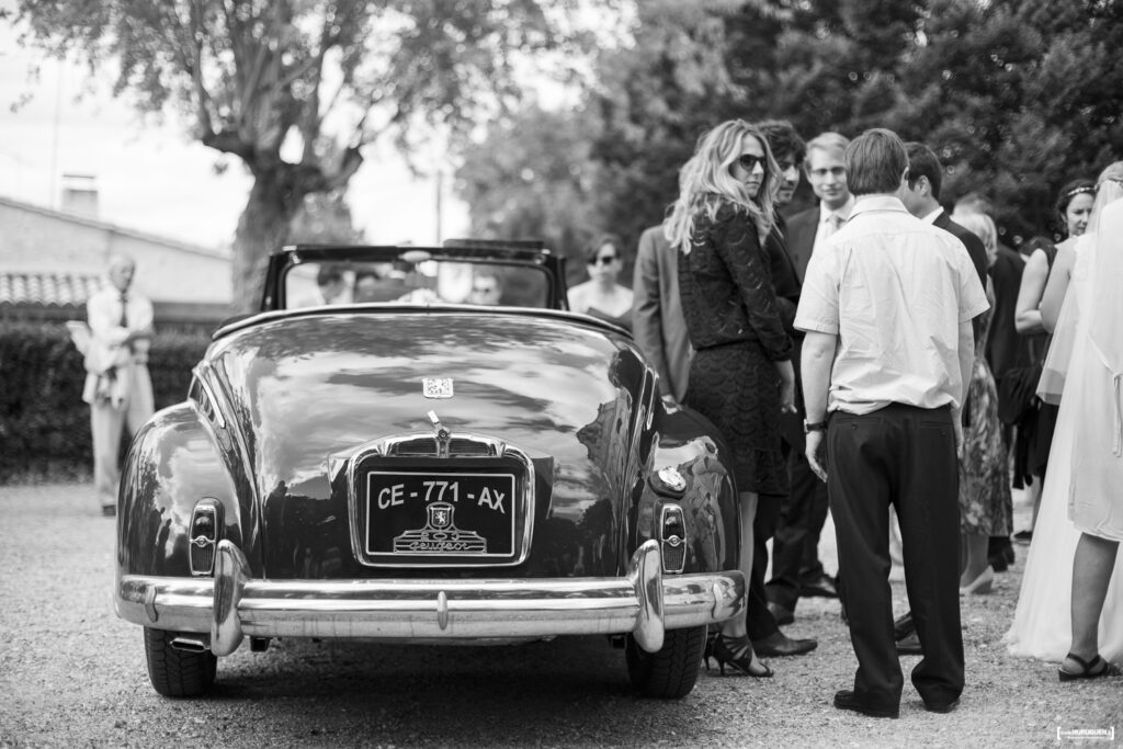 Une magnifique voiture a conduit la jeune mariée sur la place de l’église avant d’emmener le couple de jeunes mariés jusqu’au Château Lafitte à Yvrac pour un cocktail au soleil dans les jardins de la propriété au son d’un orchestre de music jazz.