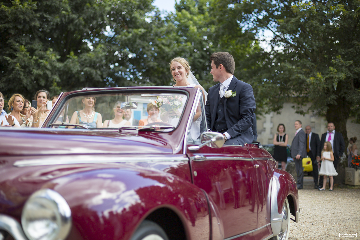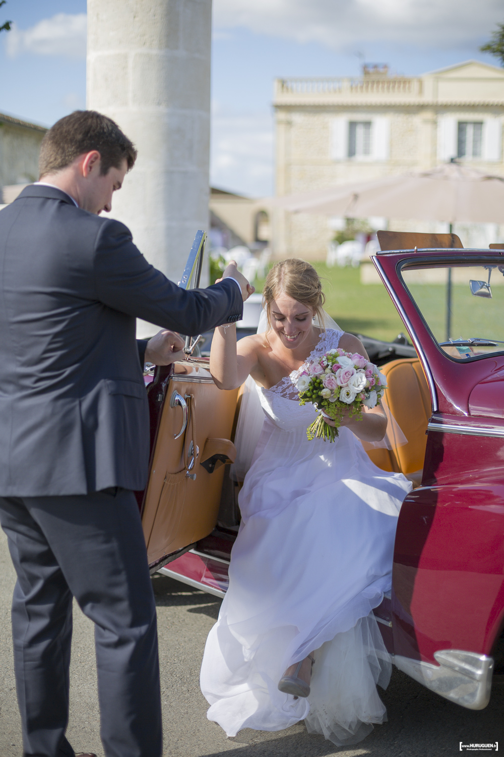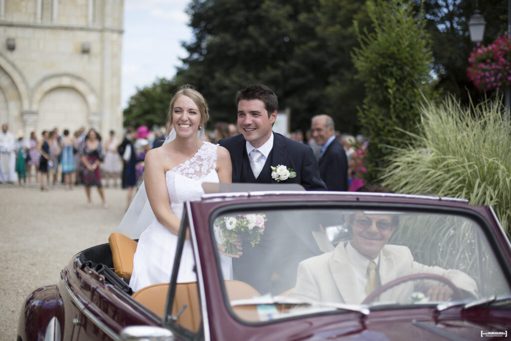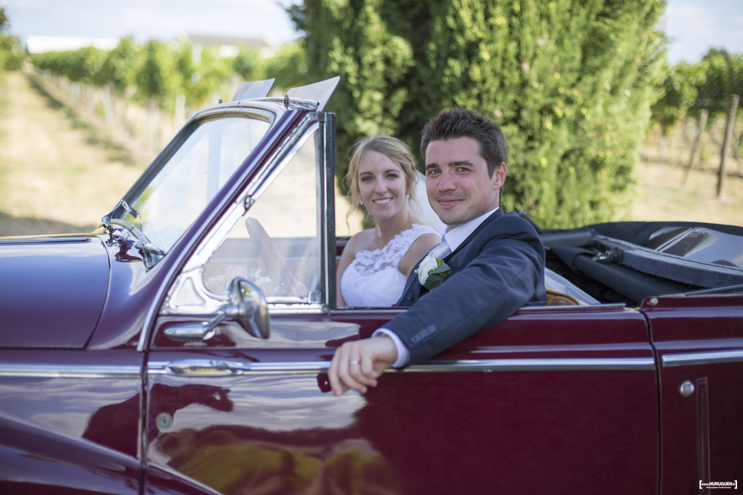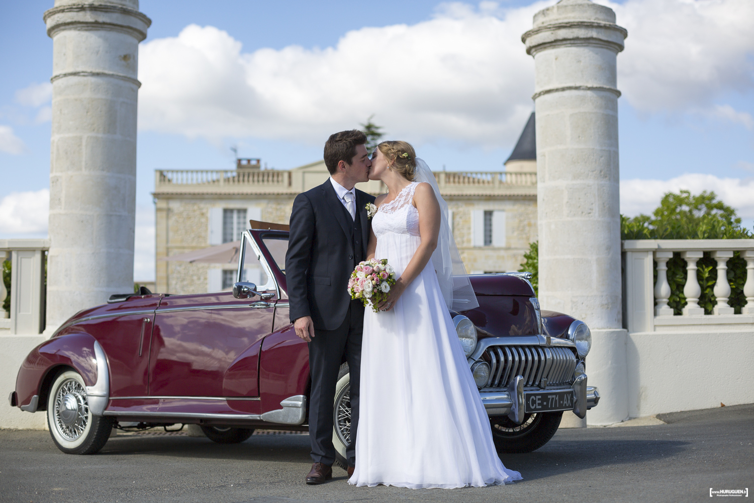Une magnifique voiture a conduit la jeune mariée sur la place de l’église avant d’emmener le couple de jeunes mariés jusqu’au Château Lafitte à Yvrac pour un cocktail au soleil dans les jardins de la propriété au son d’un orchestre de music jazz.