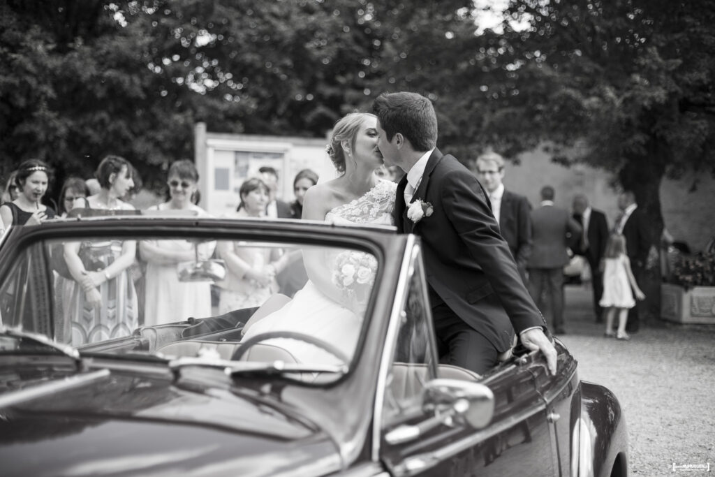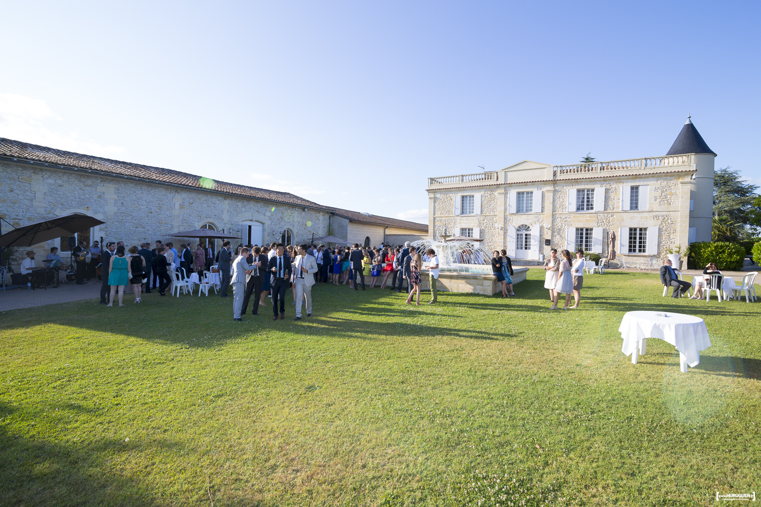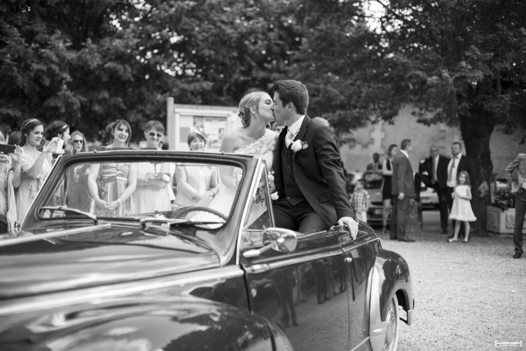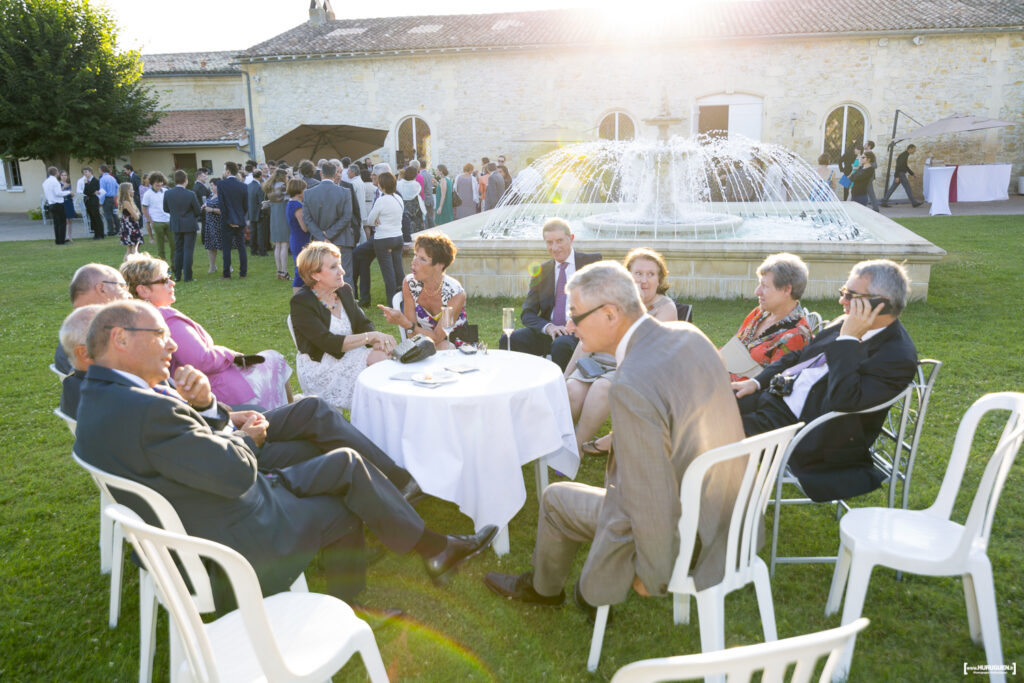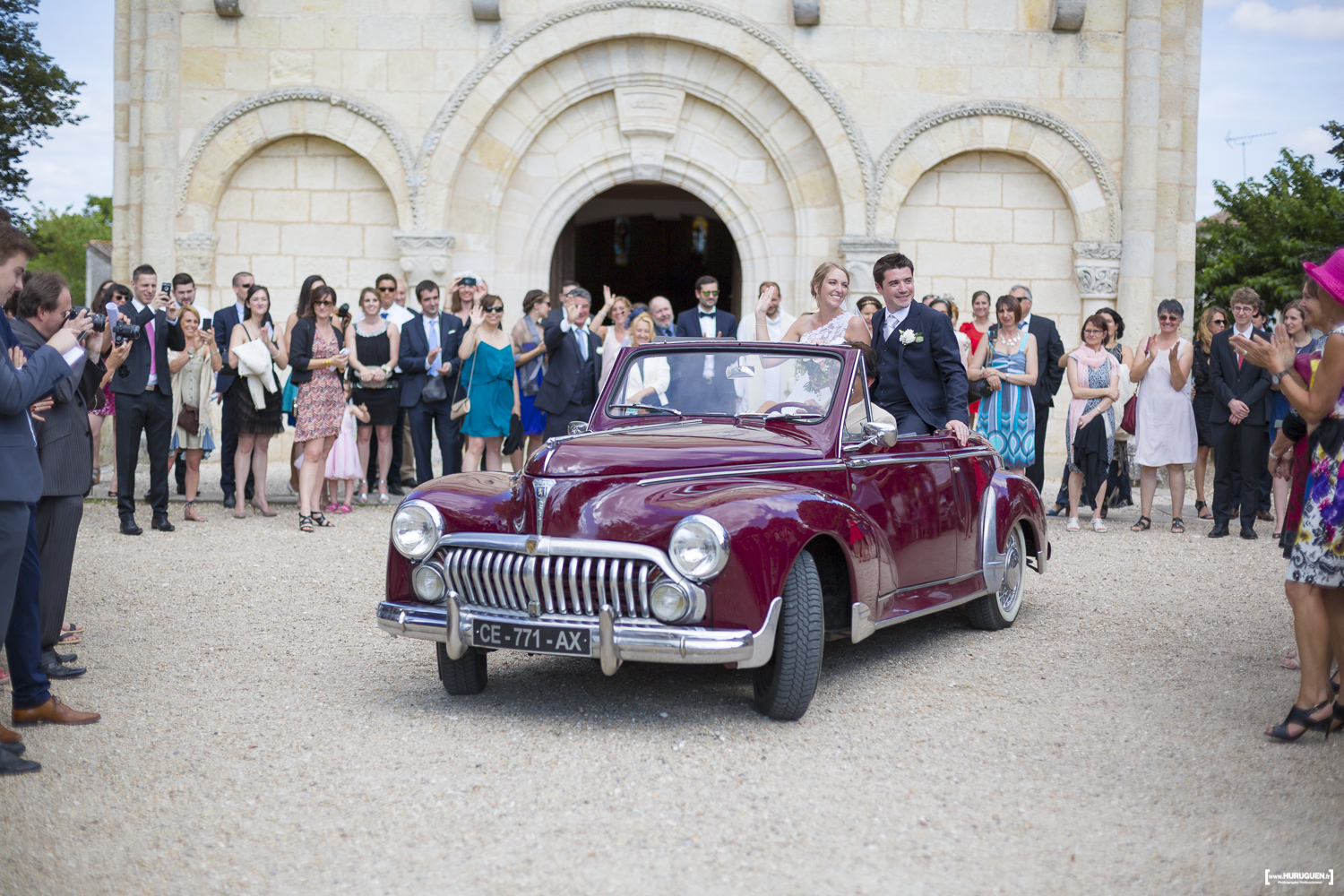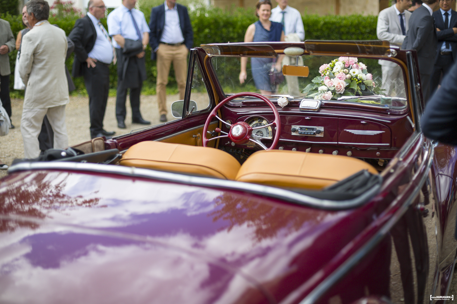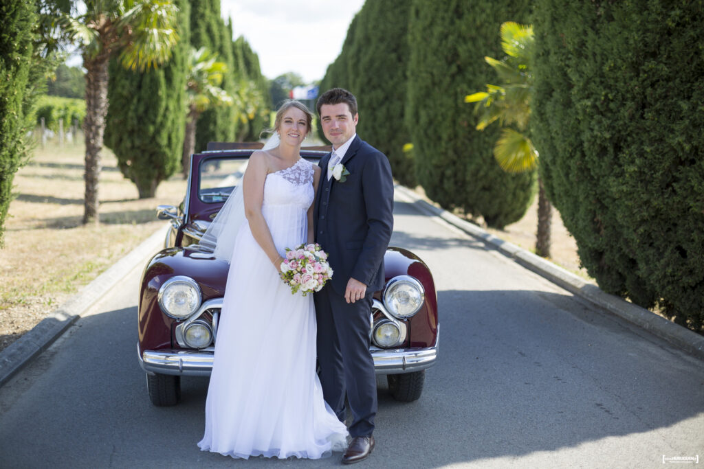 Une magnifique voiture a conduit la jeune mariée sur la place de l’église avant d’emmener le couple de jeunes mariés jusqu’au Château Lafitte à Yvrac pour un cocktail au soleil dans les jardins de la propriété au son d’un orchestre de music jazz.