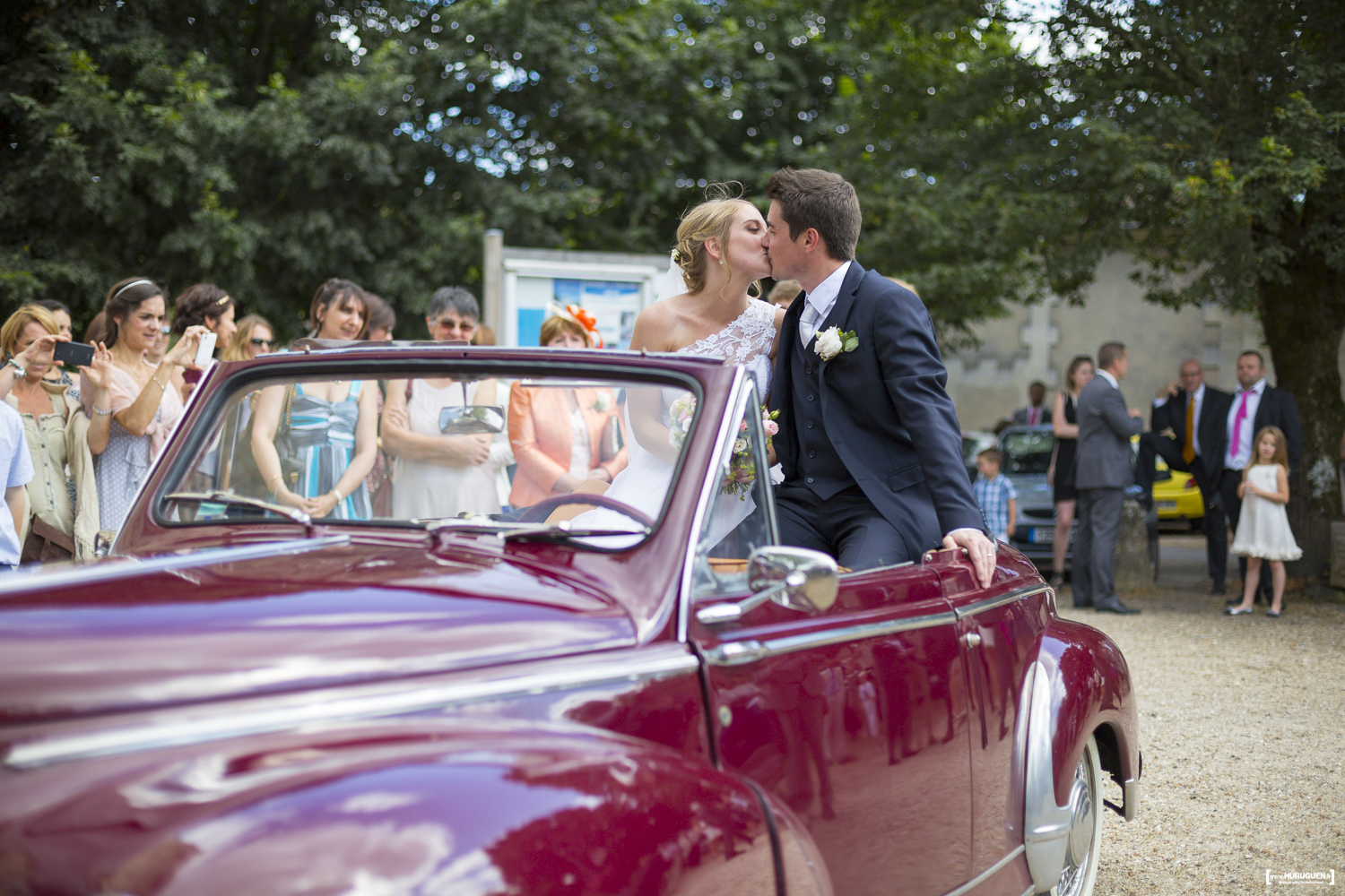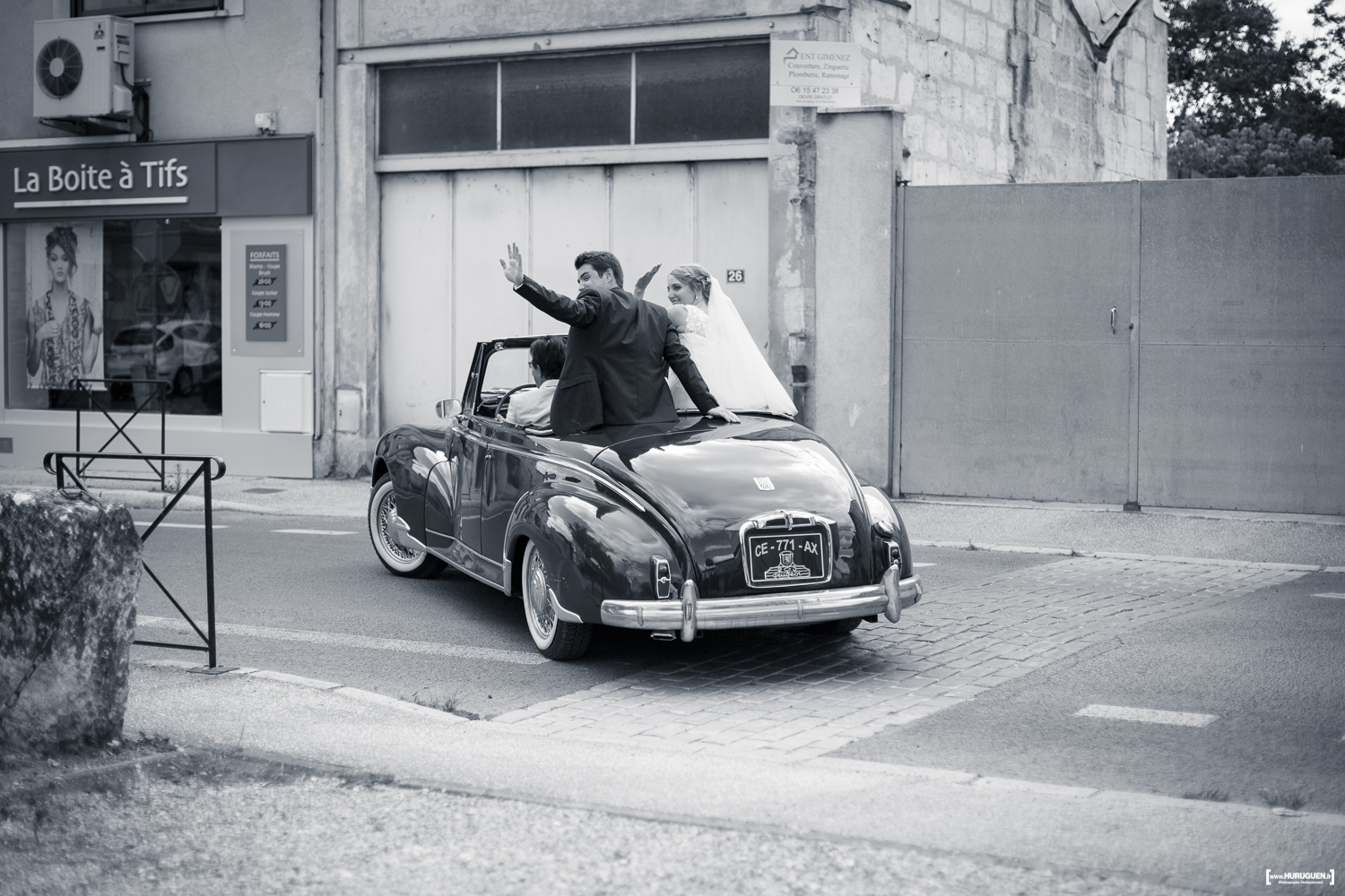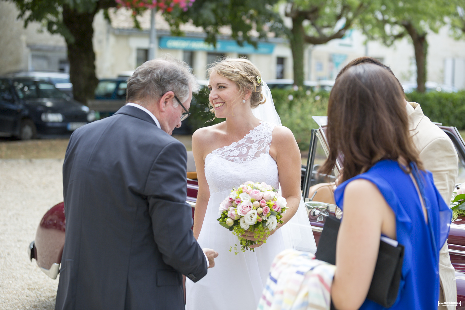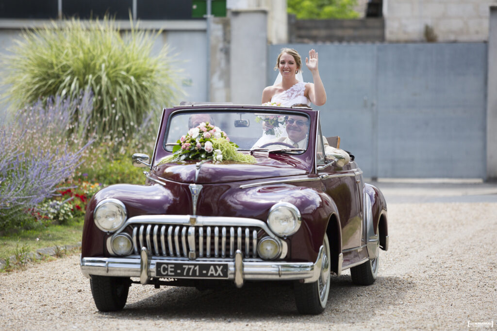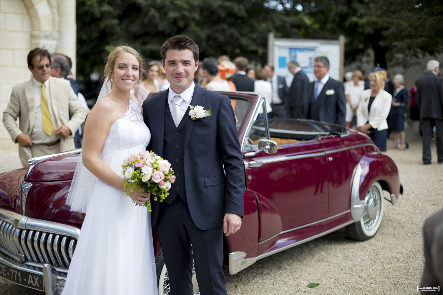 Une magnifique voiture a conduit la jeune mariée sur la place de l’église avant d’emmener le couple de jeunes mariés jusqu’au Château Lafitte à Yvrac pour un cocktail au soleil dans les jardins de la propriété au son d’un orchestre de music jazz.
