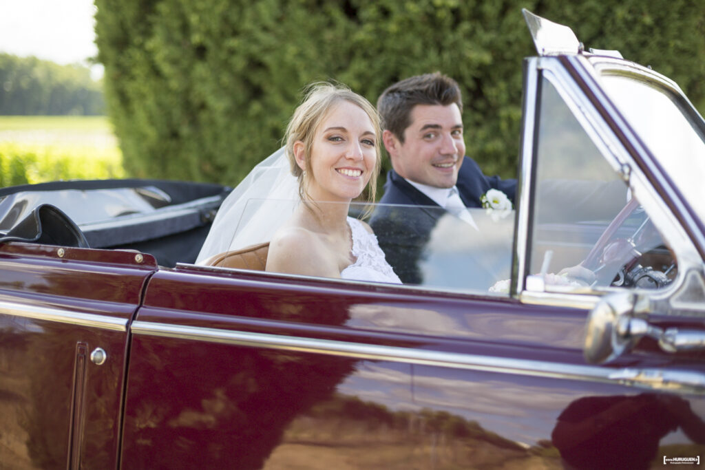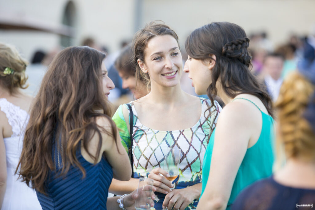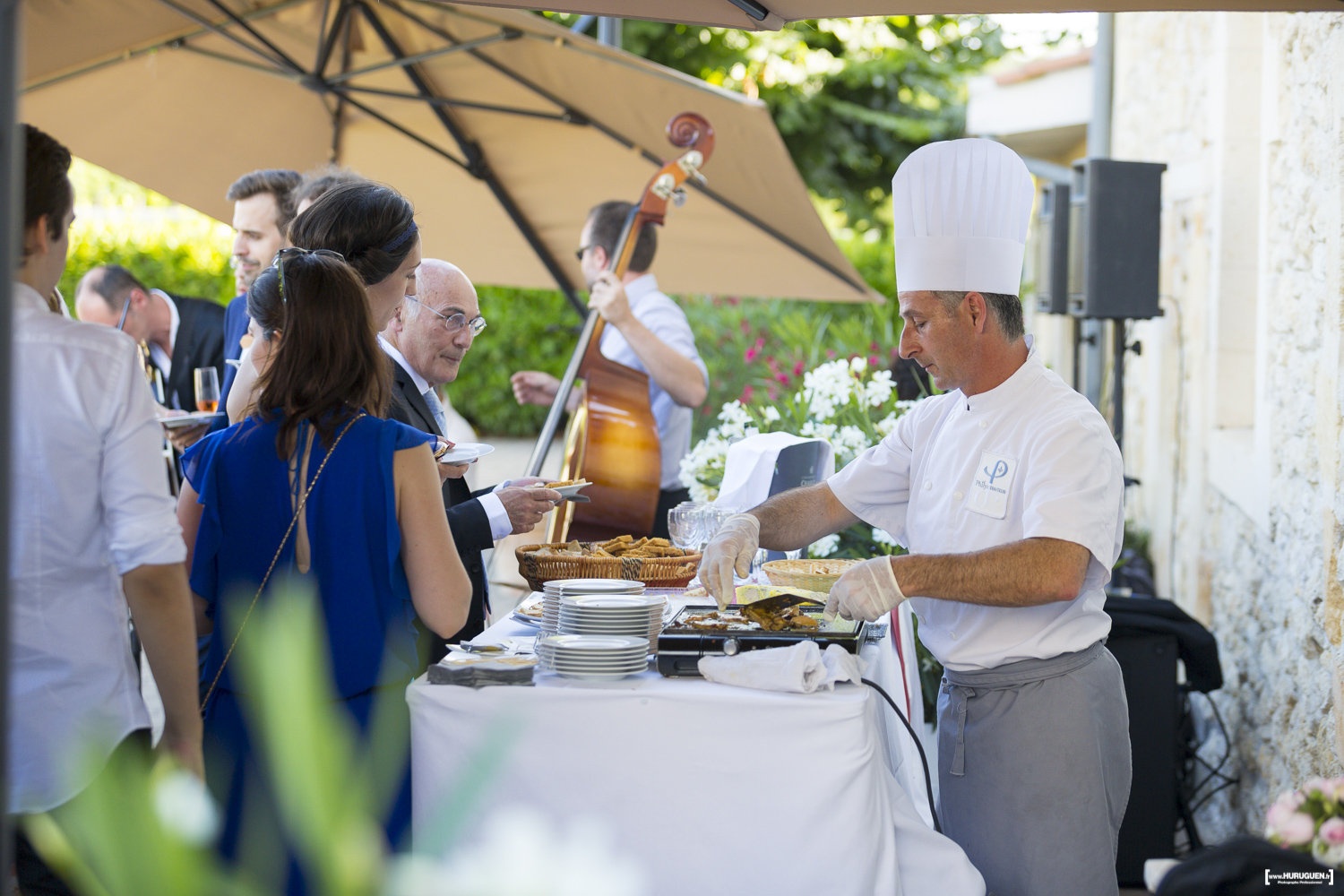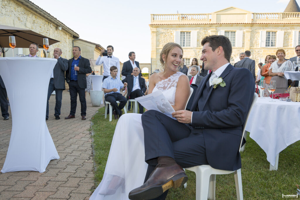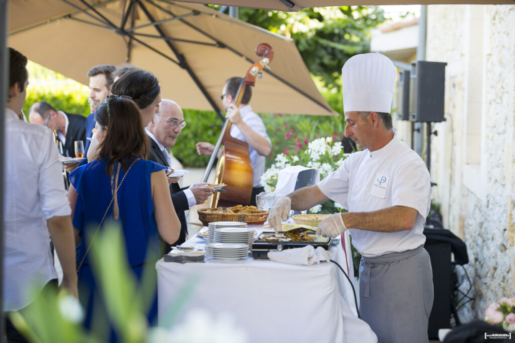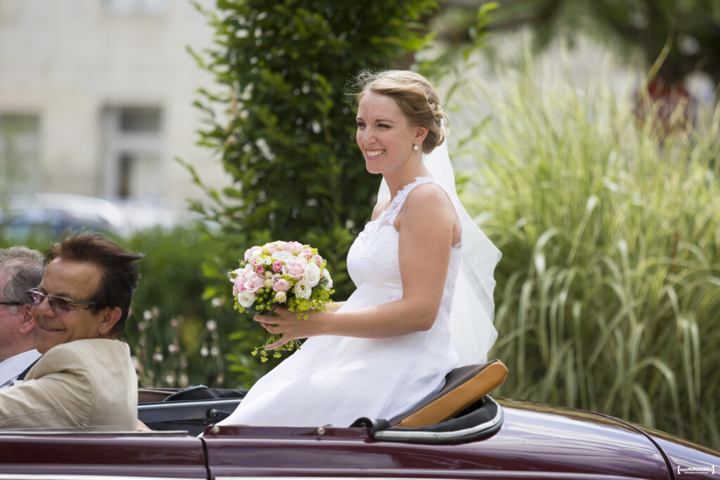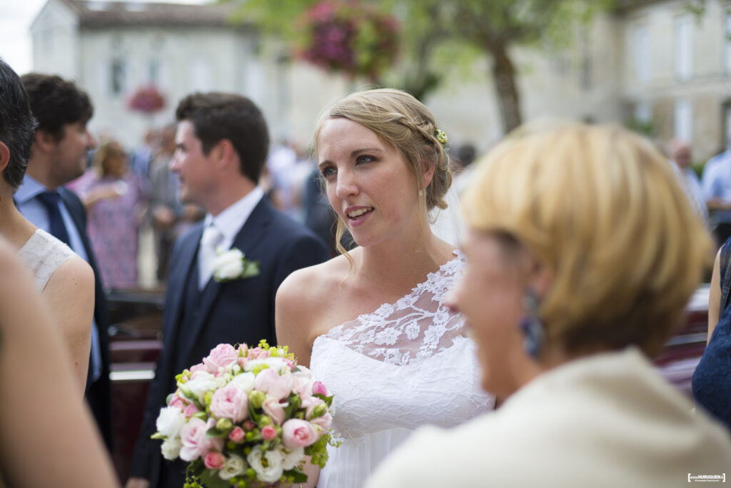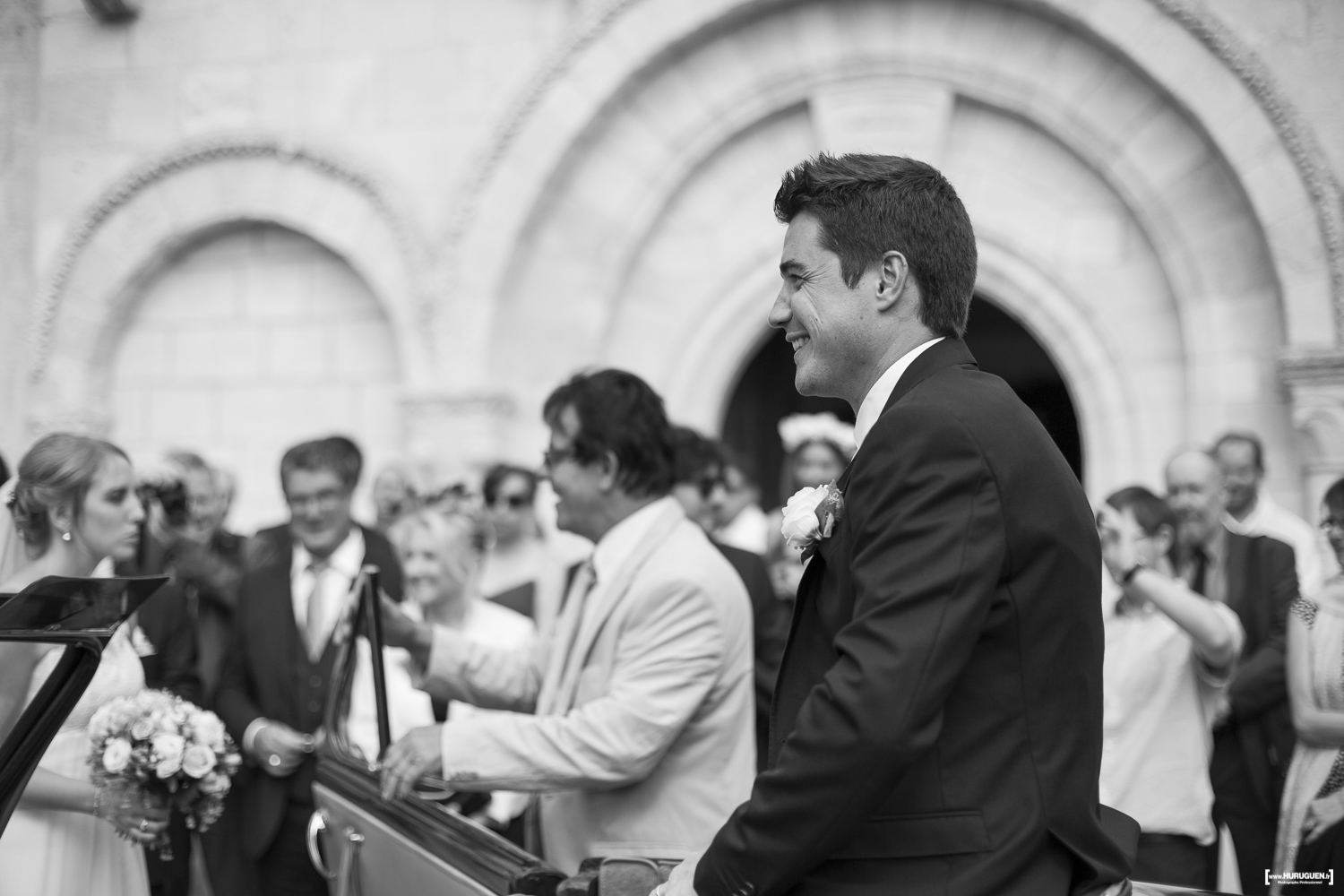 Une magnifique voiture a conduit la jeune mariée sur la place de l’église avant d’emmener le couple de jeunes mariés jusqu’au Château Lafitte à Yvrac pour un cocktail au soleil dans les jardins de la propriété au son d’un orchestre de music jazz.