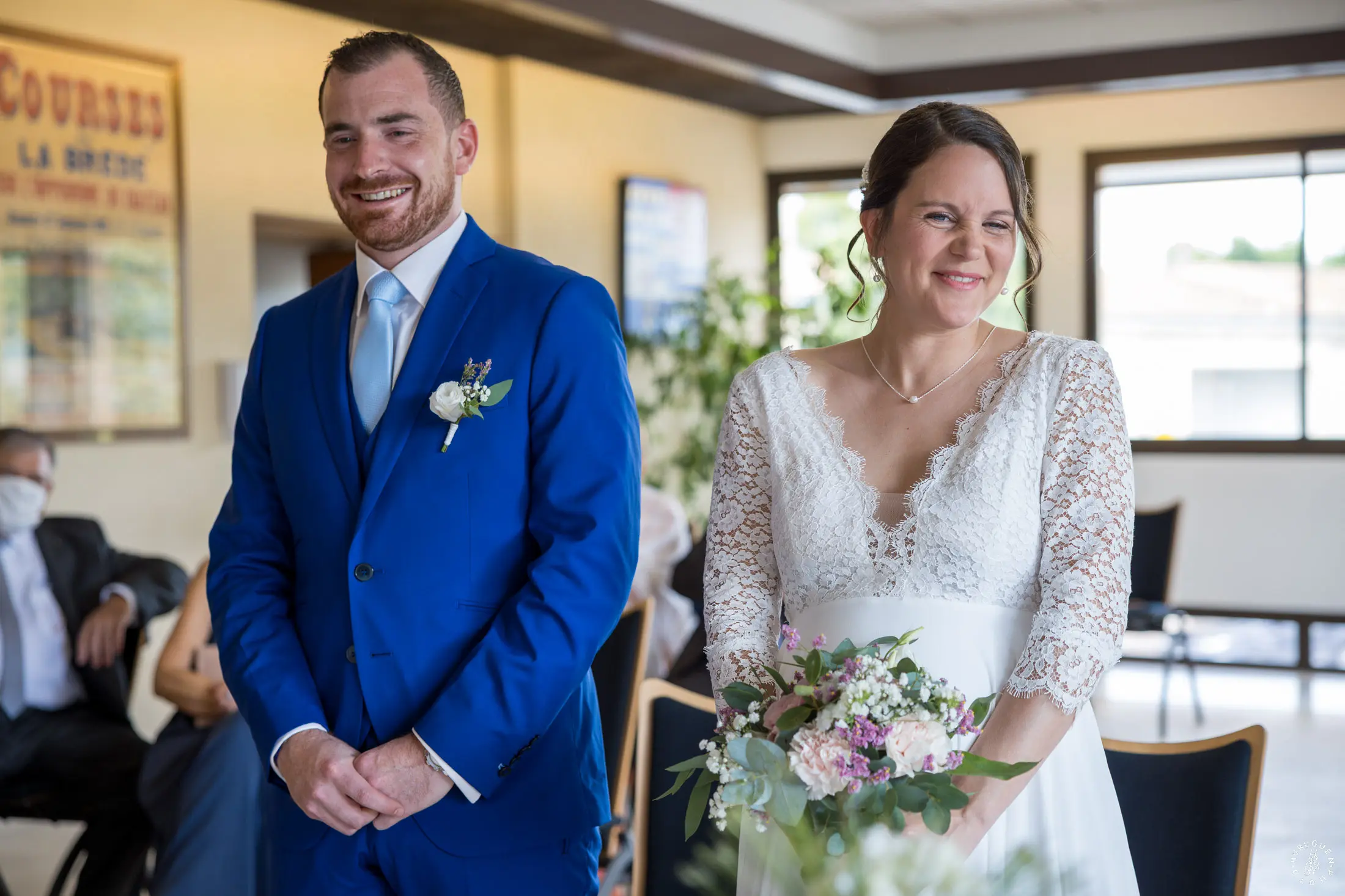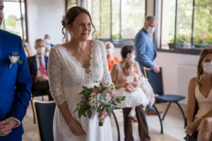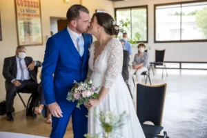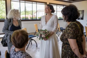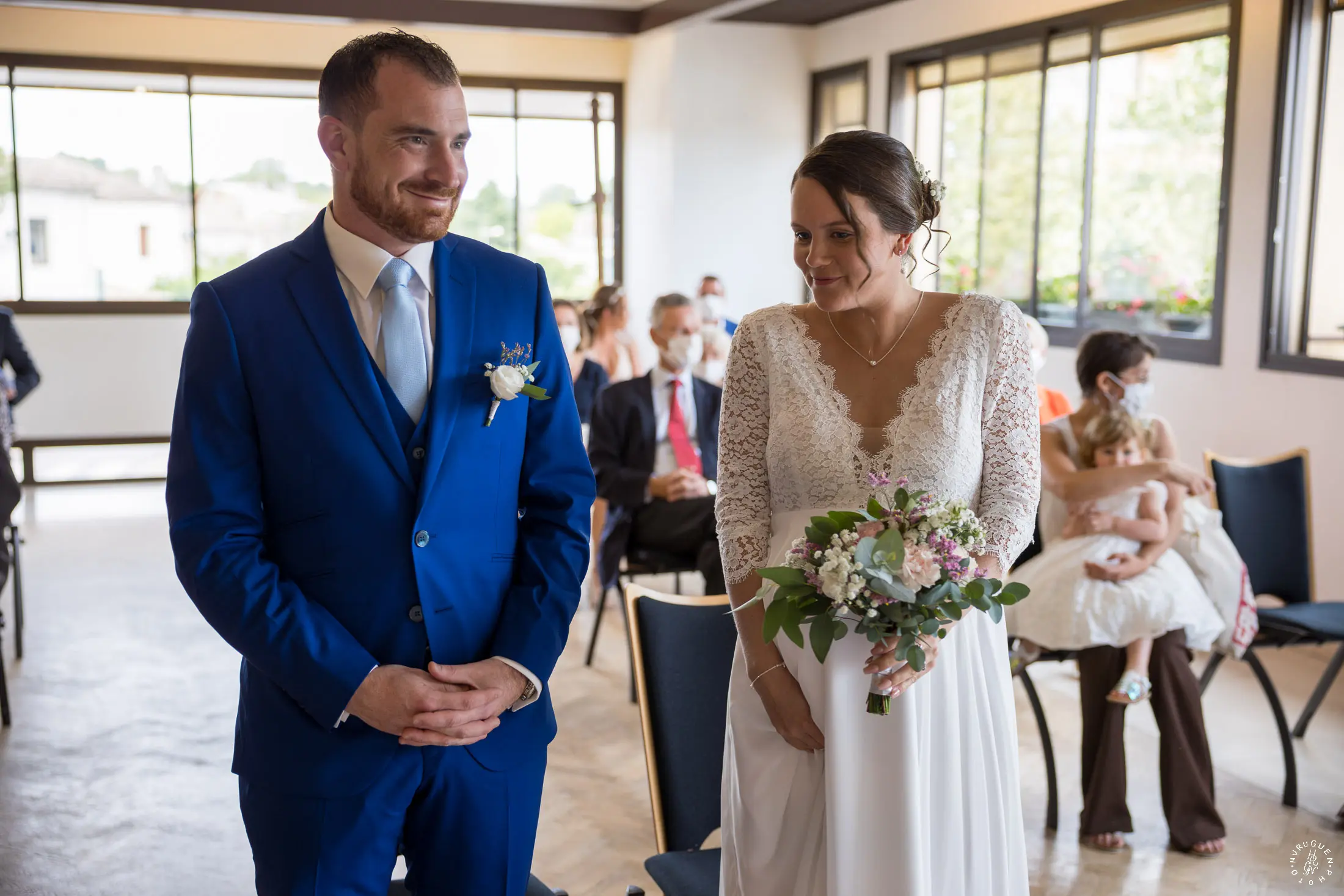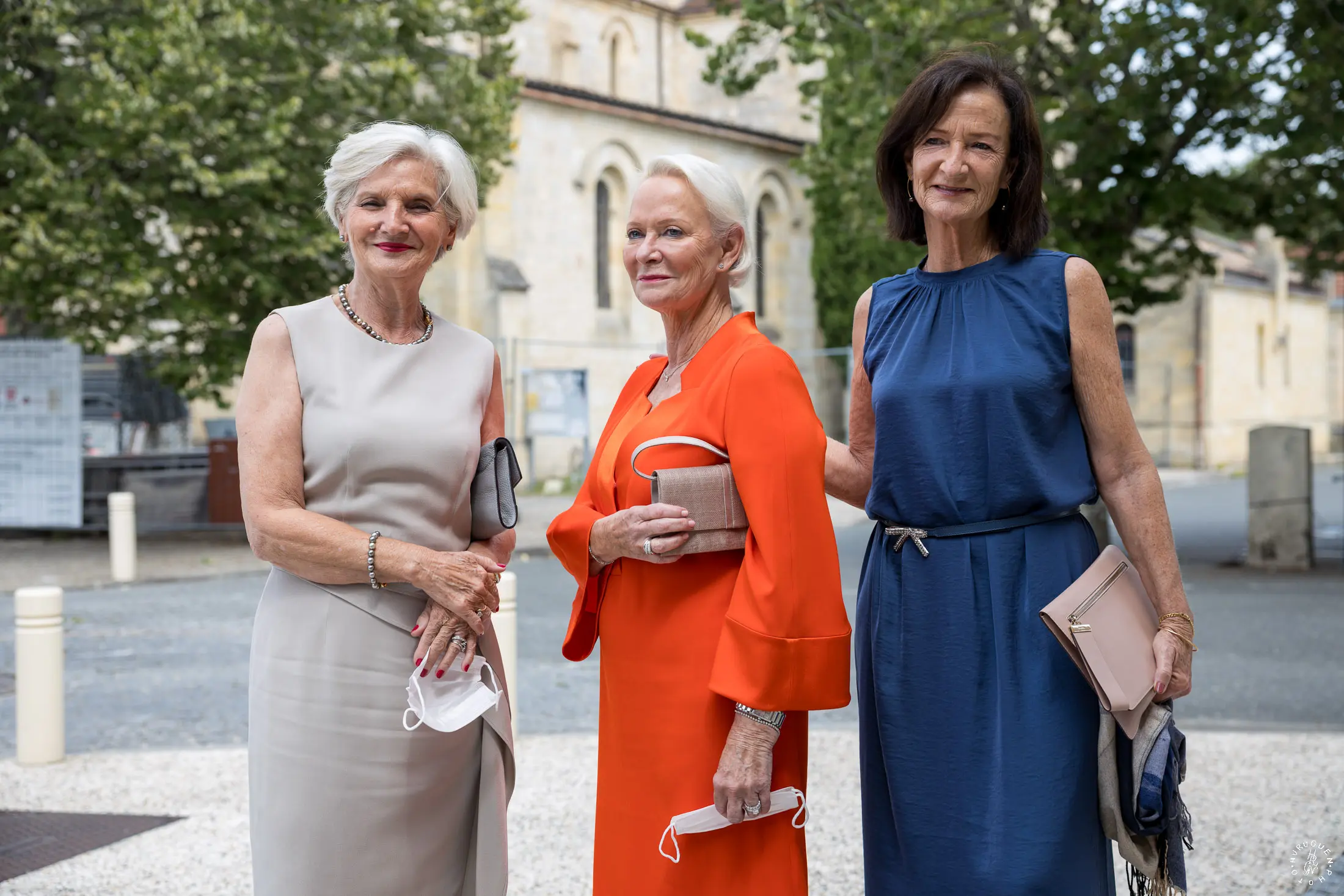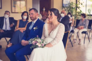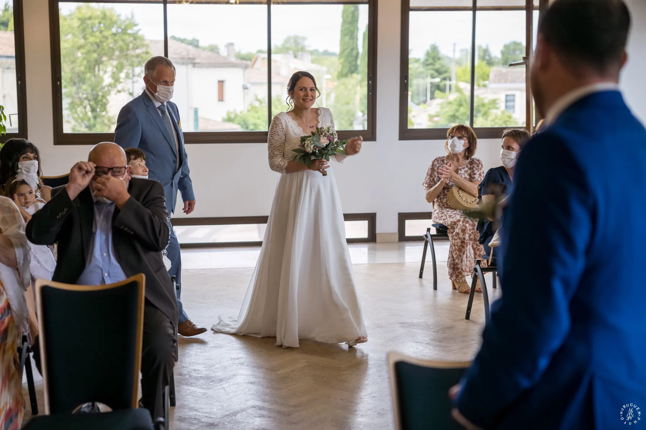 En 2021, ce mariage a débuté par une cérémonie civile à la mairie de La Brède, dans un contexte particulier. Les proches, masqués, étaient présents pour entourer les mariés avec beaucoup de bienveillance. Malgré les contraintes sanitaires de l’époque, les regards, les gestes et les sourires discrets traduisaient une émotion forte et sincère.