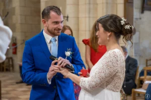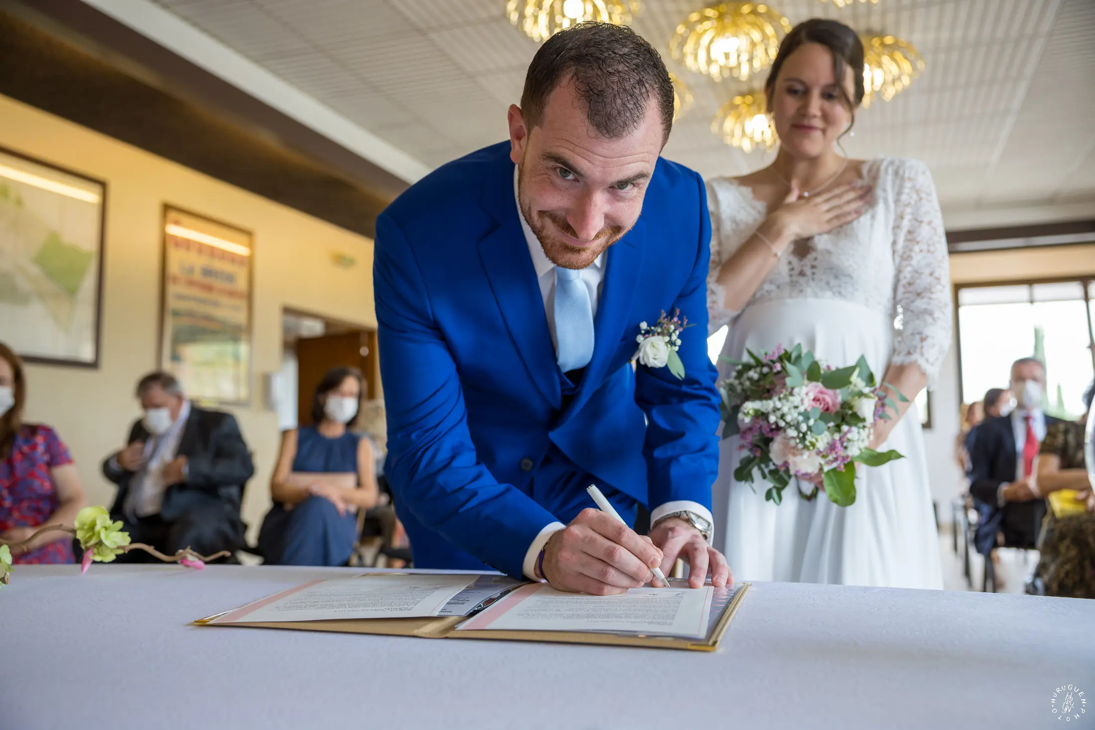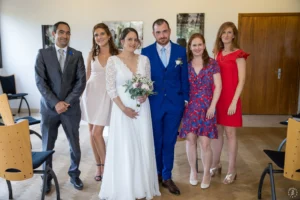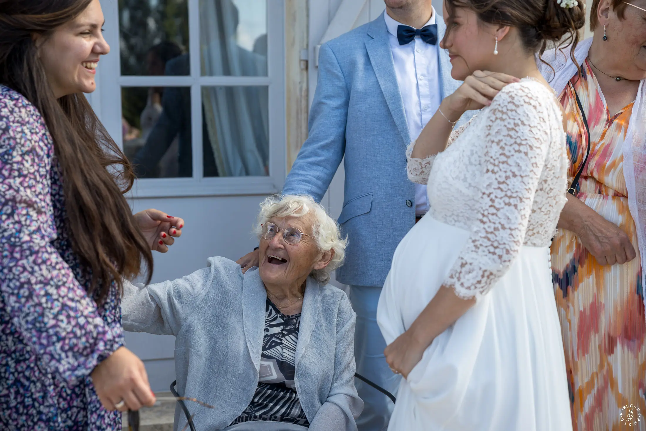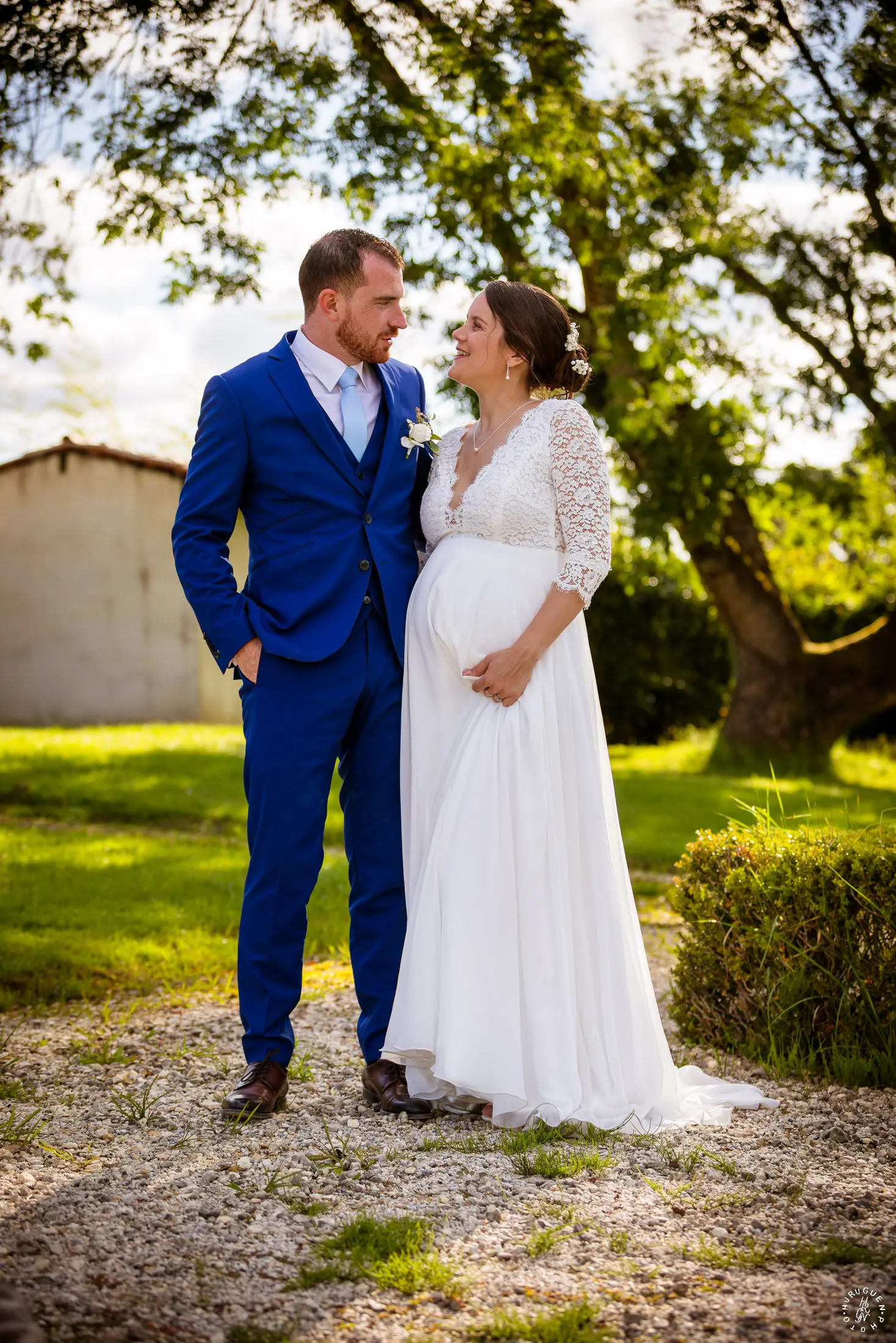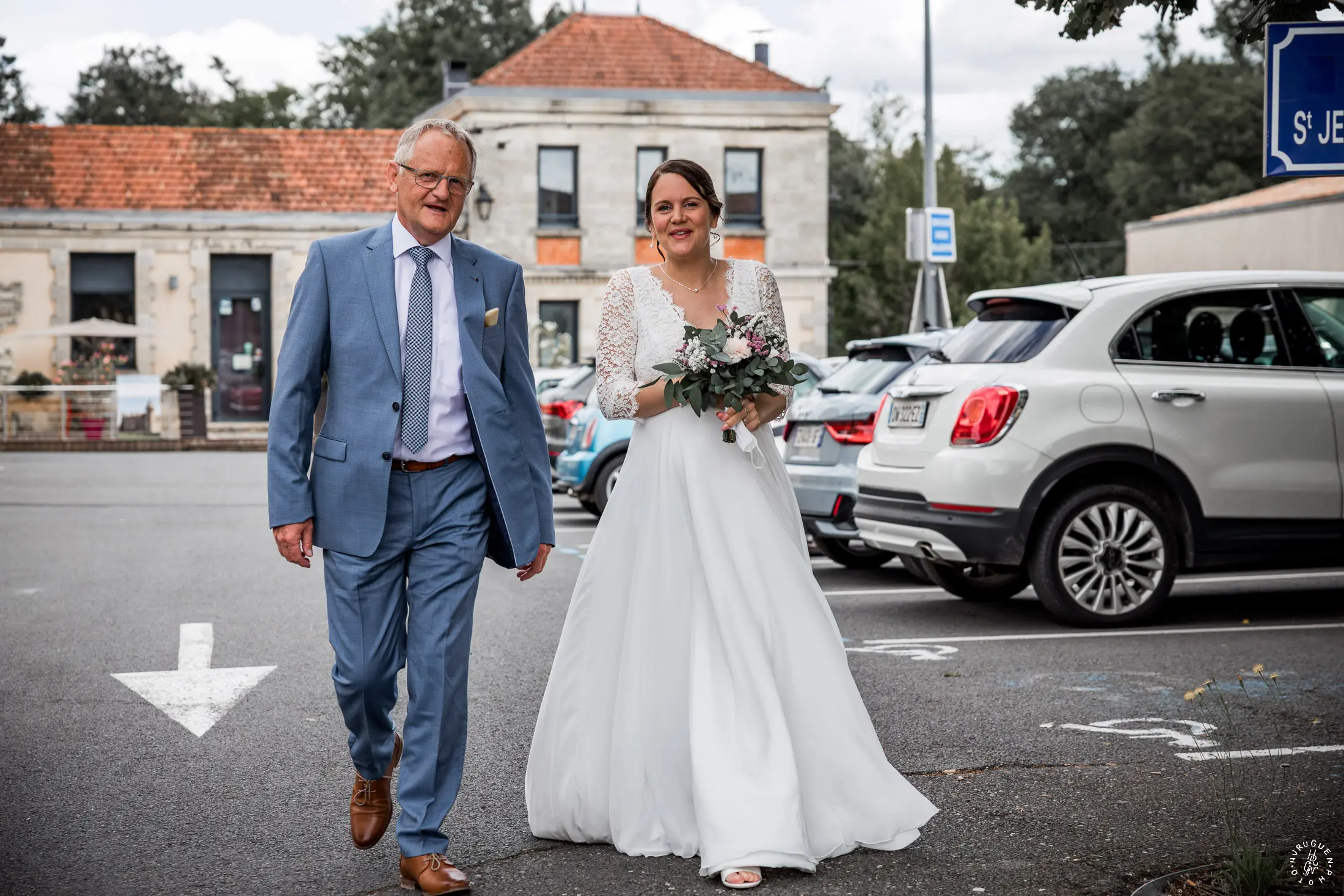 En 2021, ce mariage a débuté par une cérémonie civile à la mairie de La Brède, dans un contexte particulier. Les proches, masqués, étaient présents pour entourer les mariés avec beaucoup de bienveillance. Malgré les contraintes sanitaires de l’époque, les regards, les gestes et les sourires discrets traduisaient une émotion forte et sincère.
