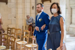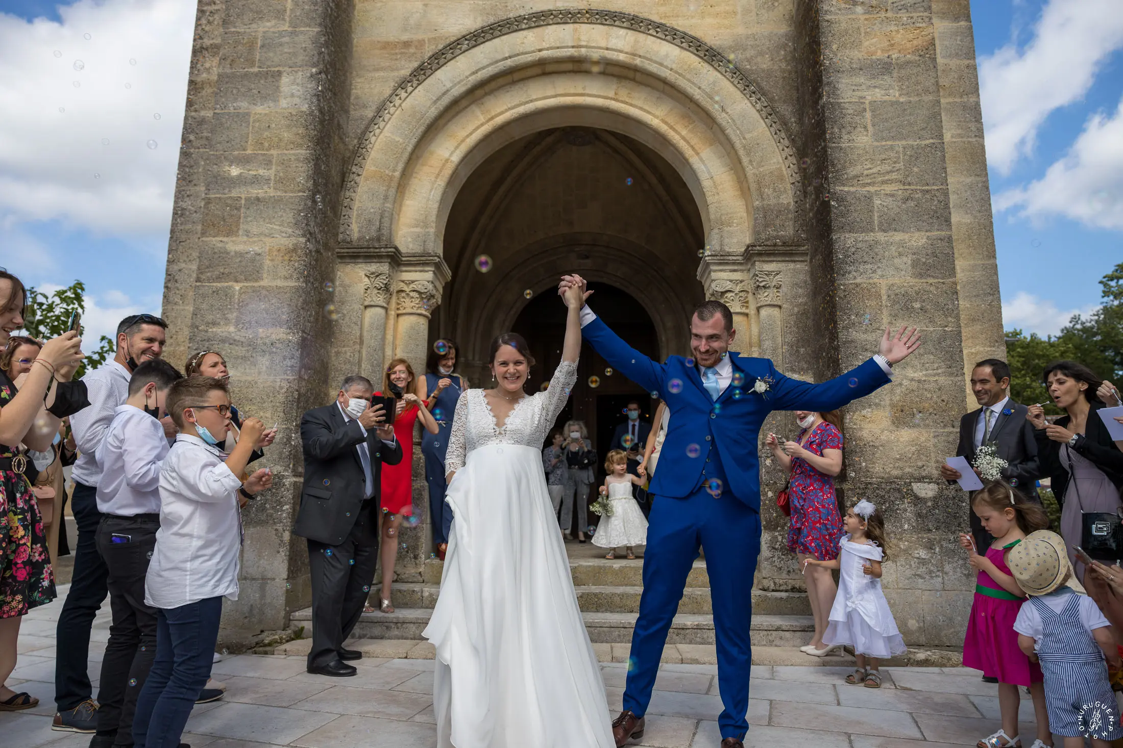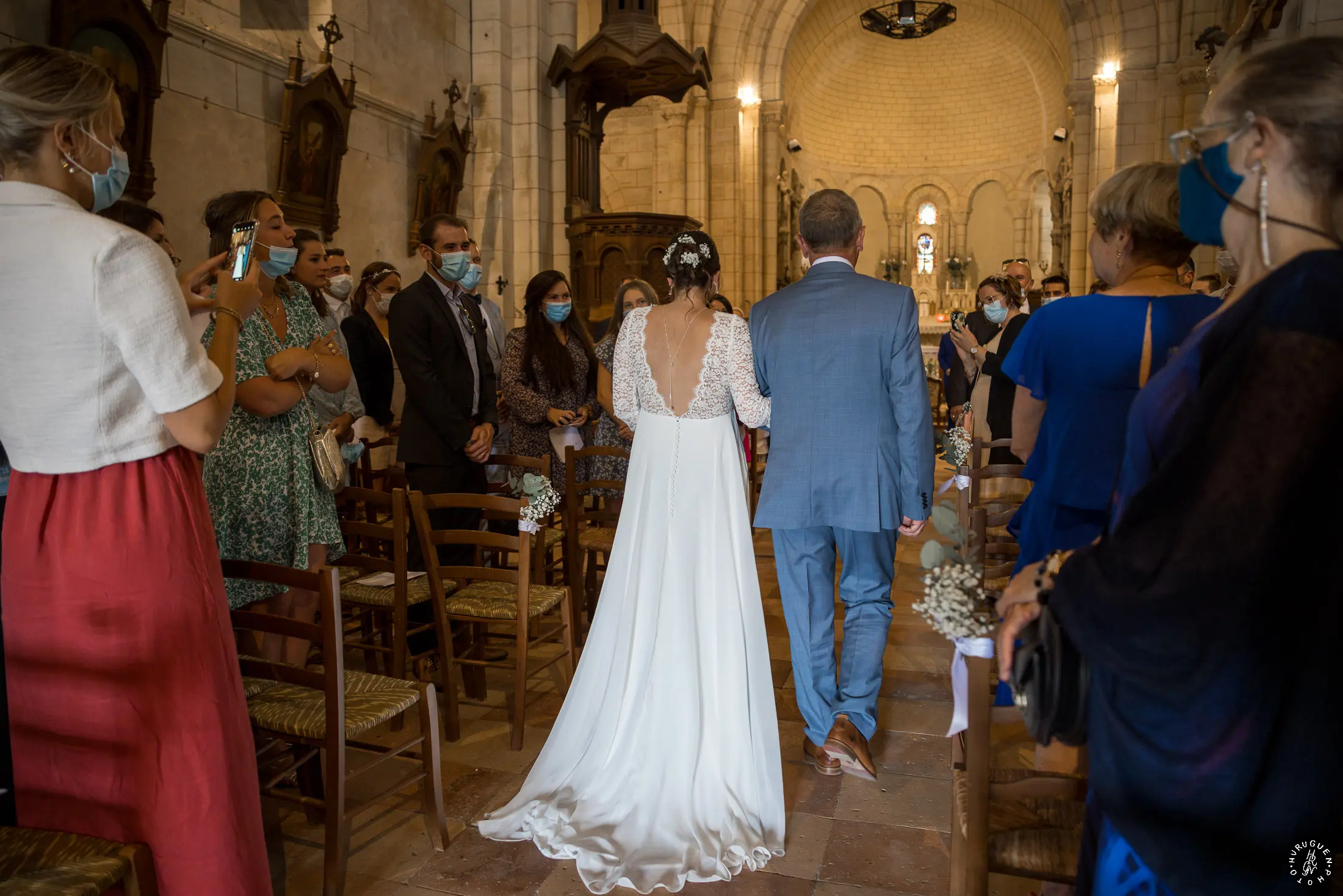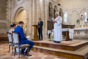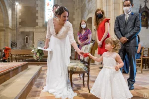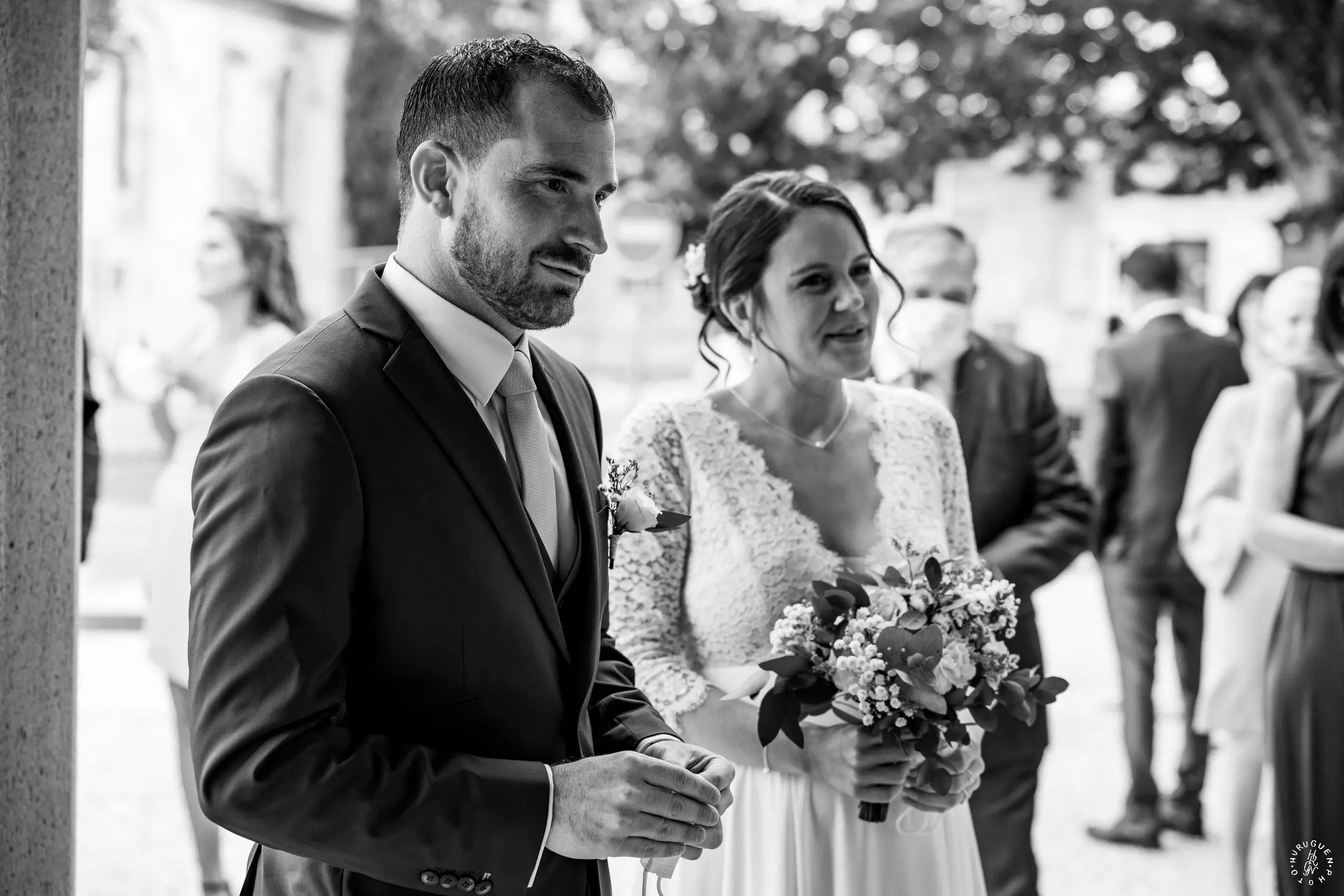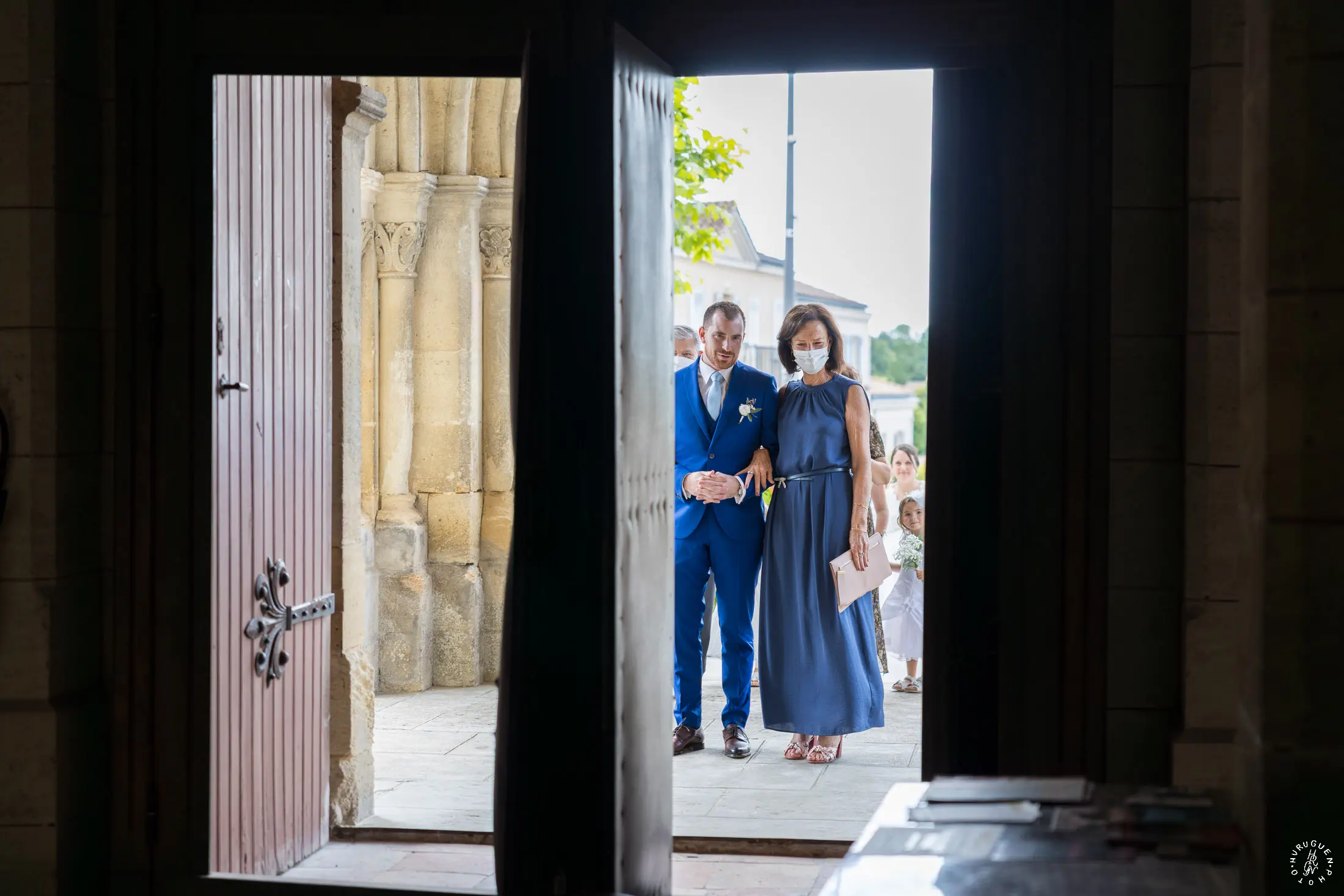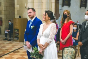 La célébration s’est poursuivie à l’église de Martillac pour une cérémonie religieuse empreinte de recueillement. Là encore, les invités portaient des masques, mais l’intensité des instants vécus restait intacte. Chaque moment fort, chaque échange et chaque émotion ont été capturés dans un esprit de reportage naturel et discret.