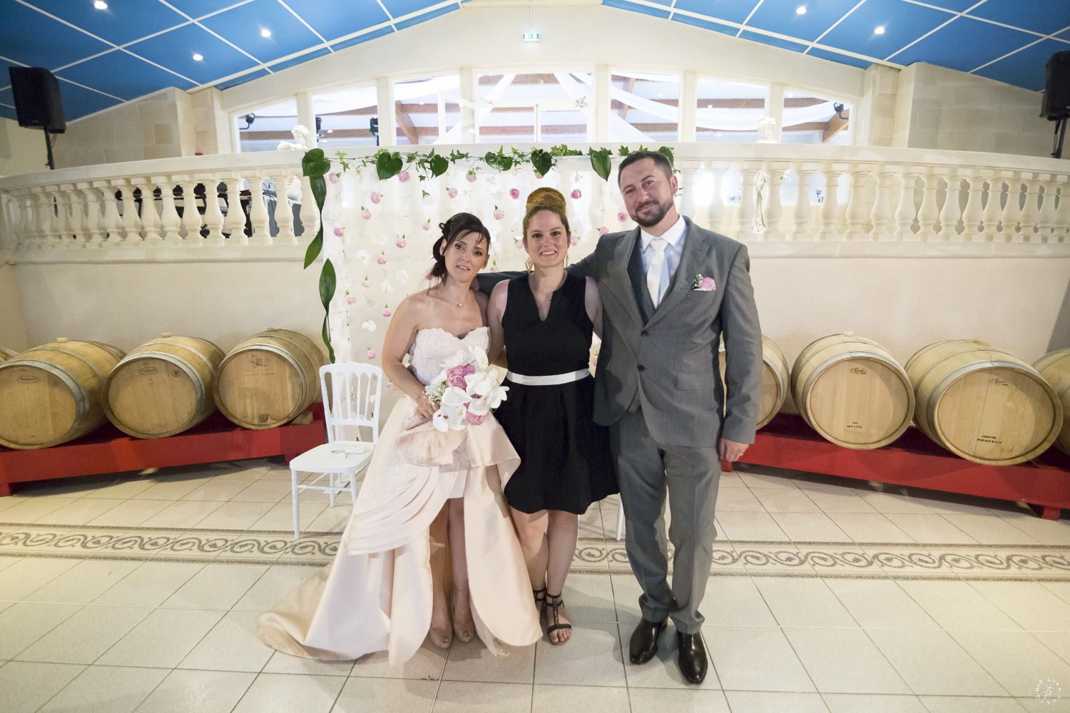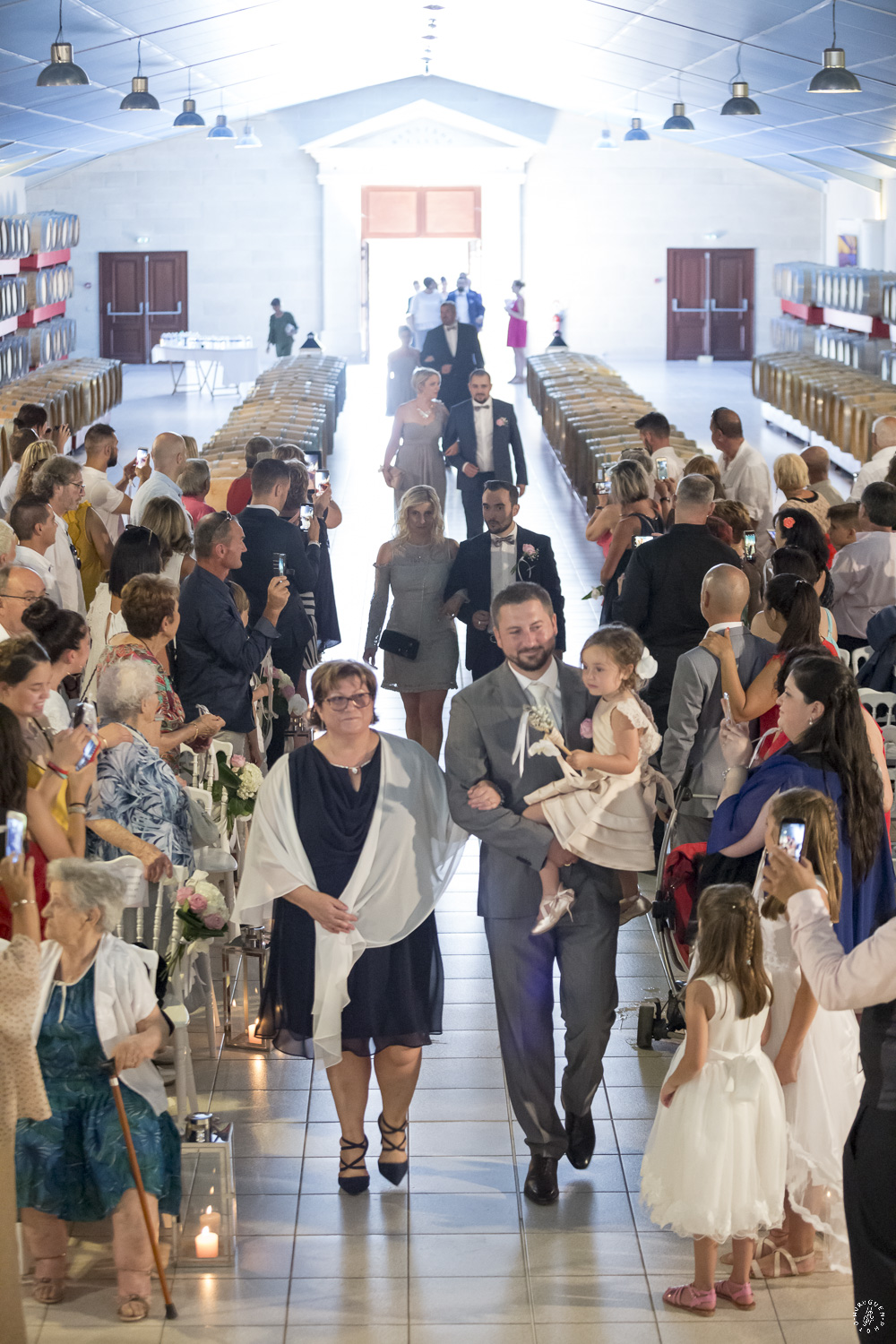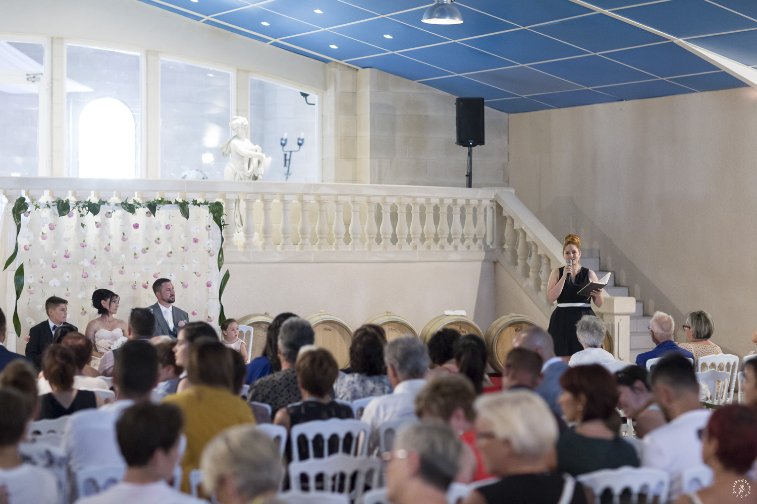Le cortège a ensuite rejoint la rive droite, direction Yvrac. Le Château Lafitte nous a ouvert les portes de son majestueux chai pour une cérémonie laïque poignante, menée avec brio par Serial Noceuse.