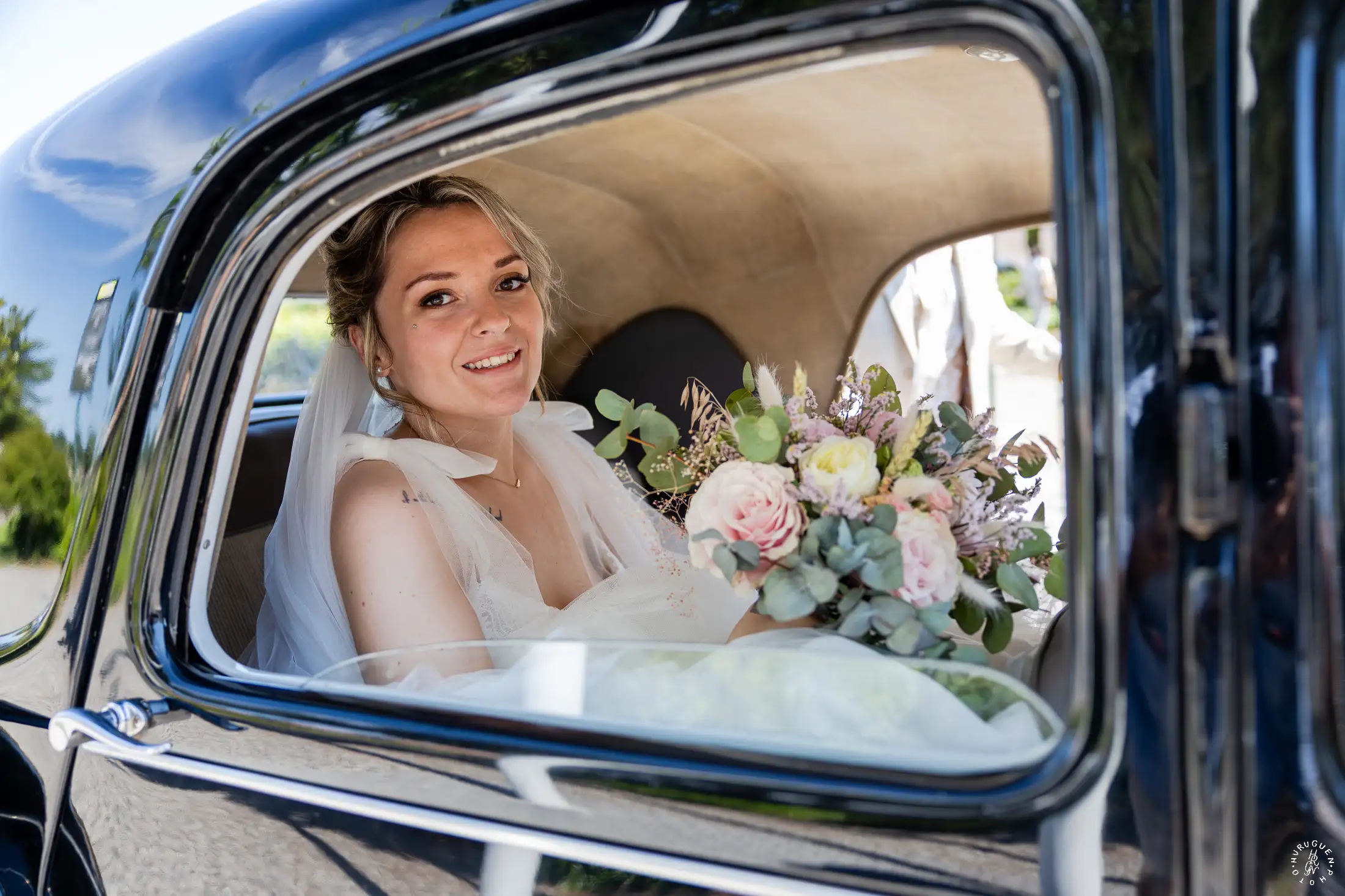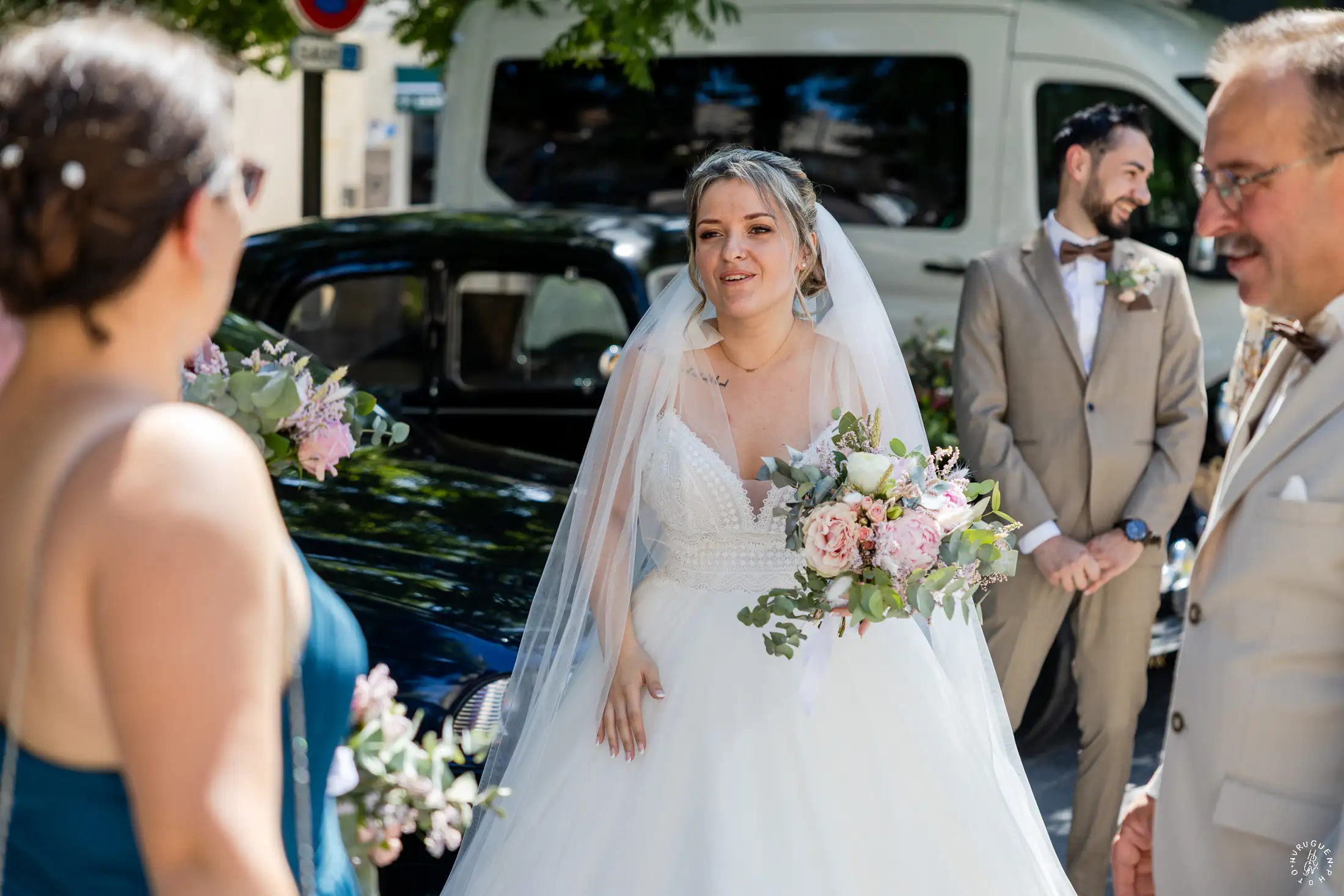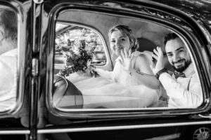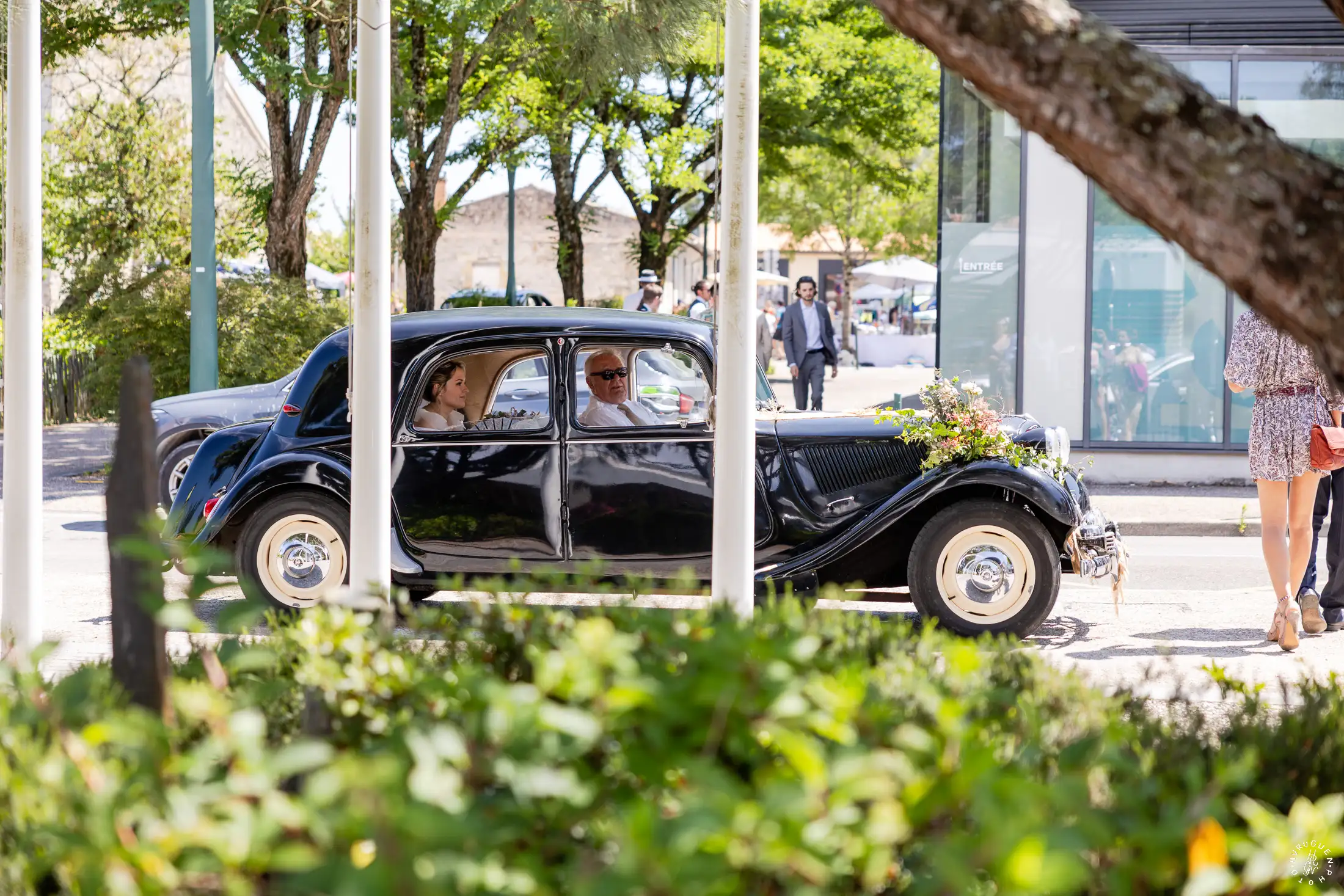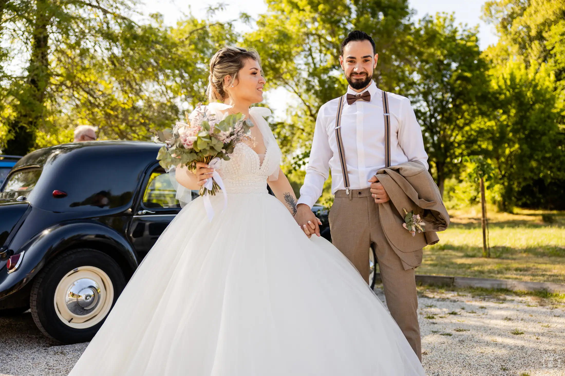 Le mariage a débuté sous un soleil éclatant. L’arrivée de la mariée dans une Citroën Traction Avant noire a immédiatement donné un cachet intemporel à l’événement.