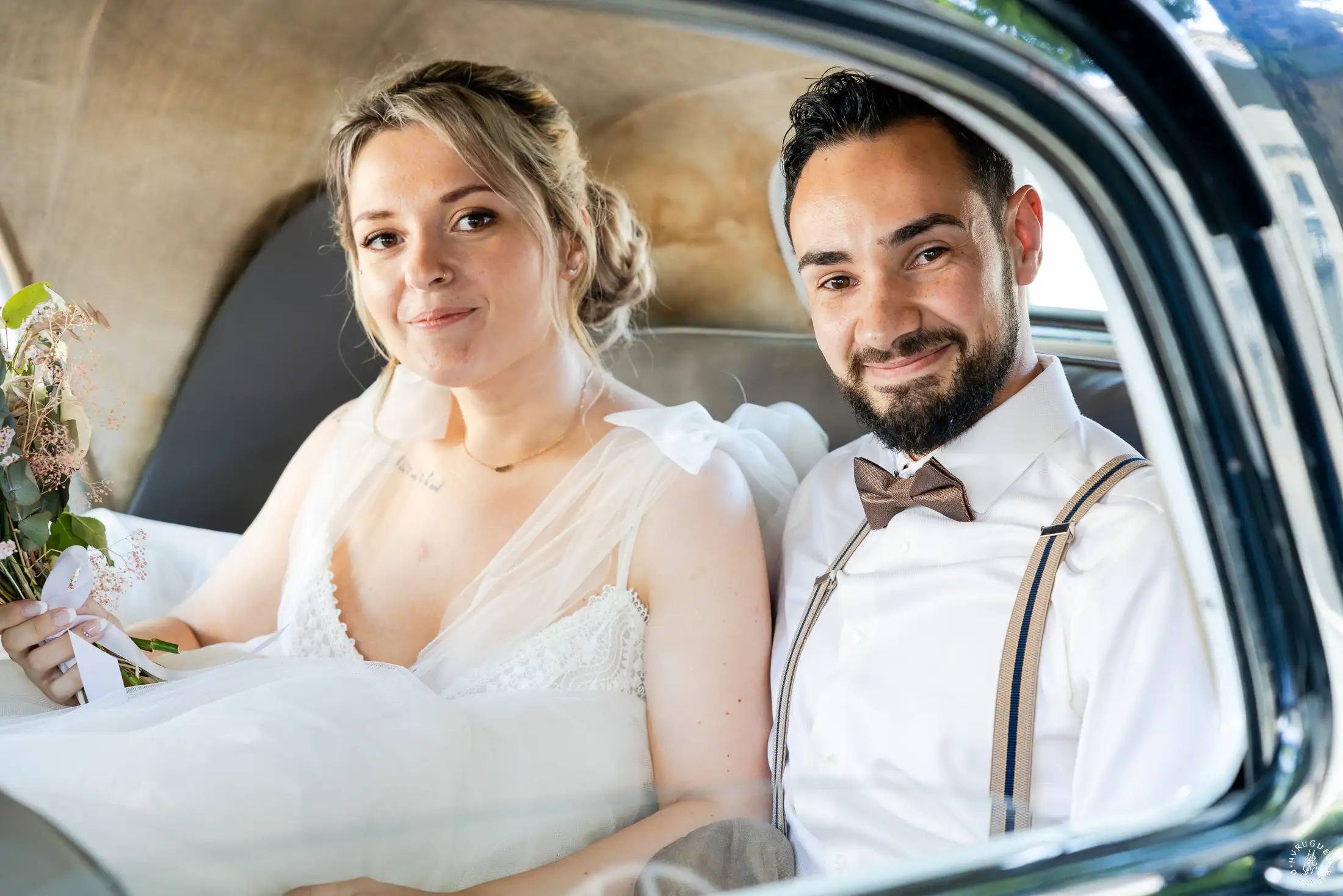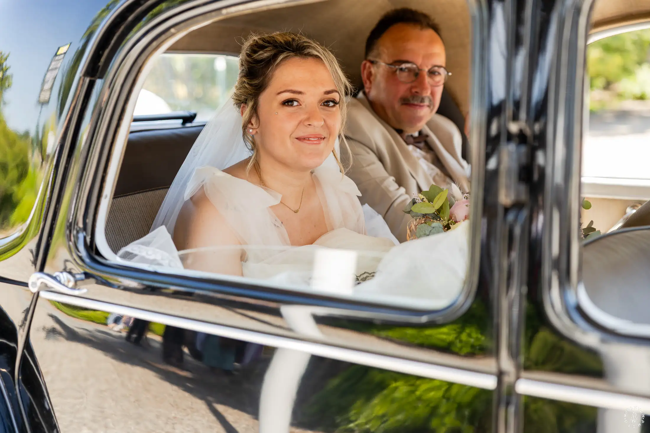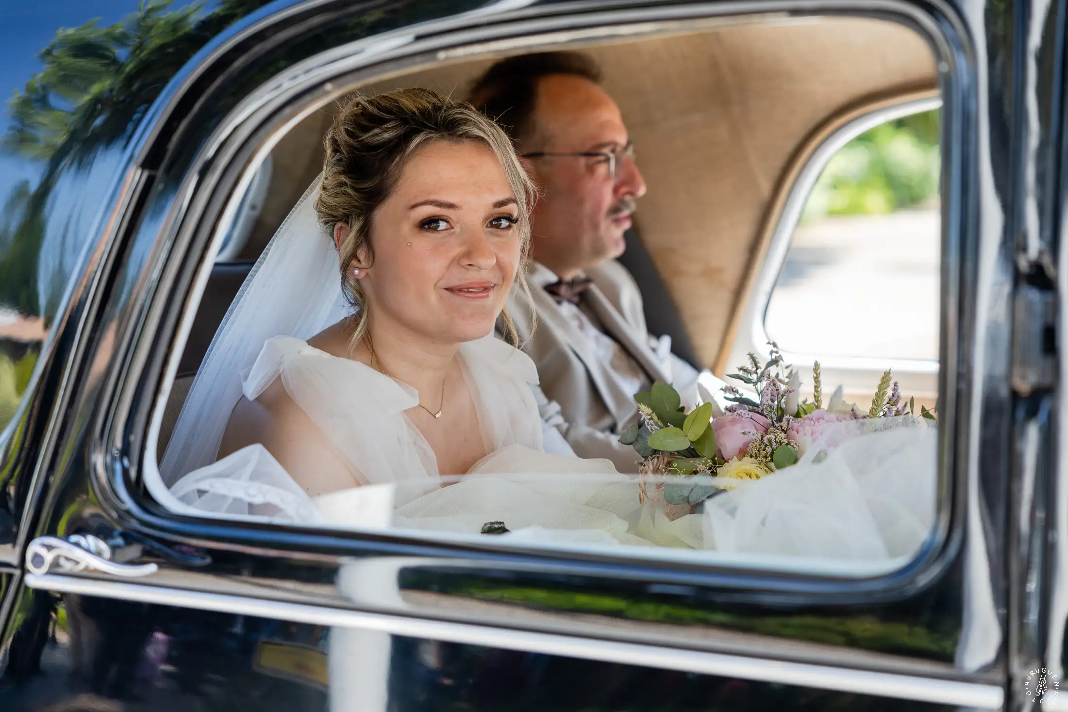 Le mariage a débuté sous un soleil éclatant. L’arrivée de la mariée dans une Citroën Traction Avant noire a immédiatement donné un cachet intemporel à l’événement.