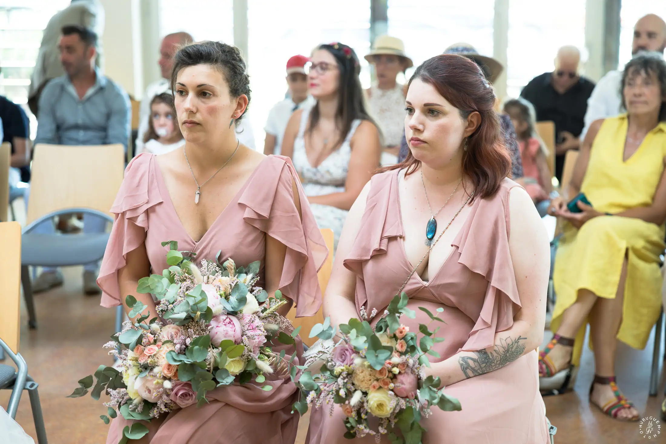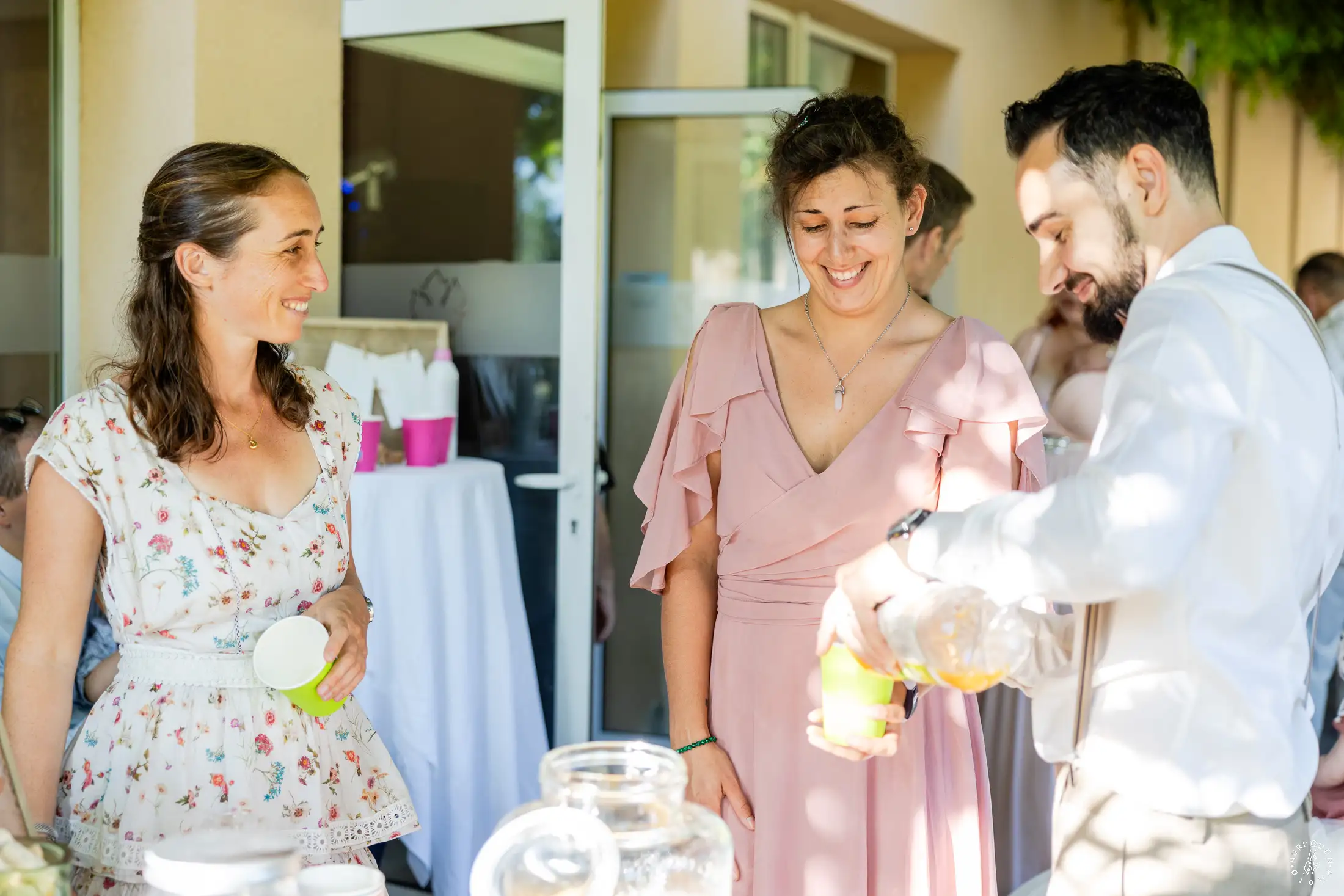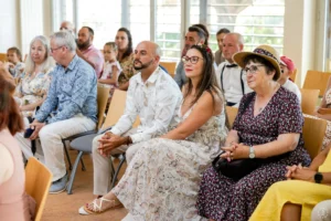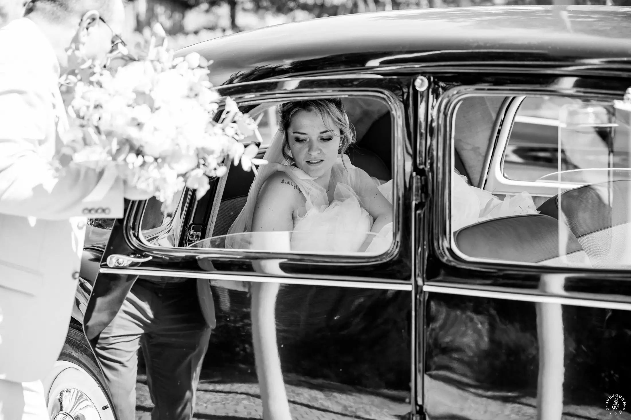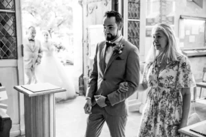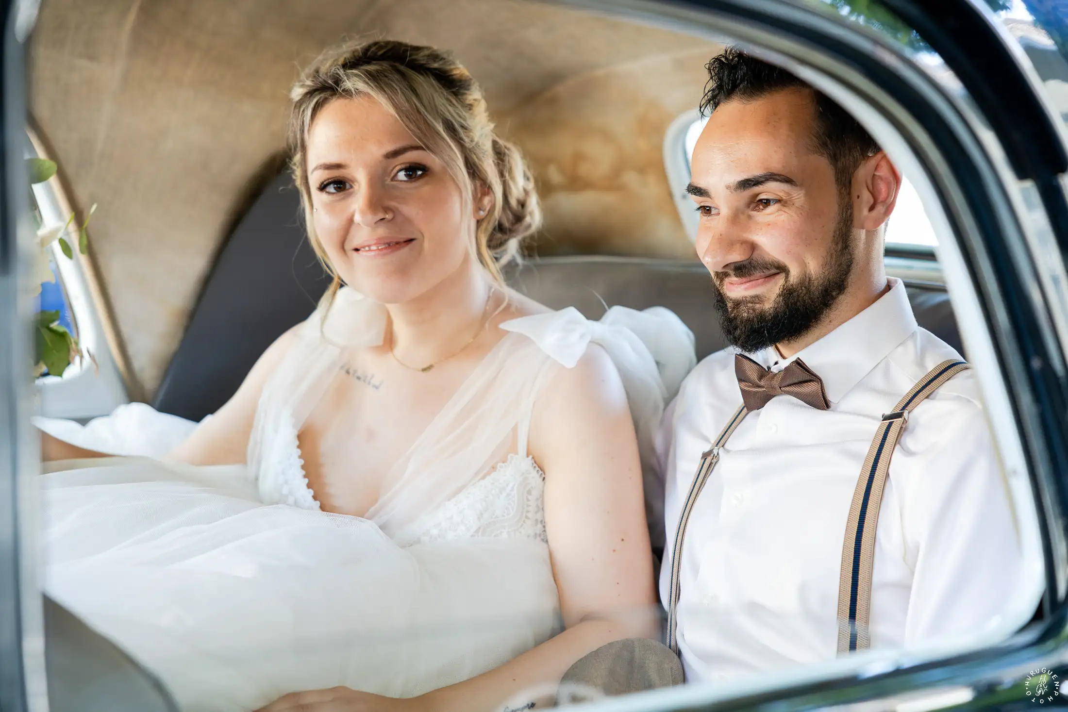 Le mariage a débuté sous un soleil éclatant. L’arrivée de la mariée dans une Citroën Traction Avant noire a immédiatement donné un cachet intemporel à l’événement.