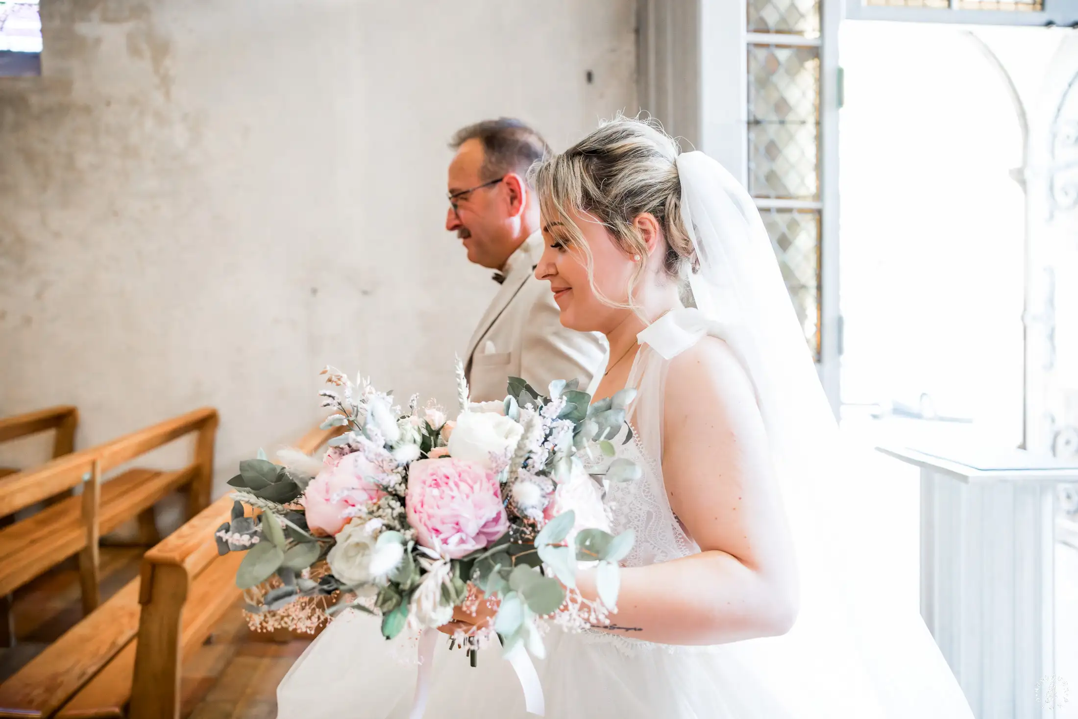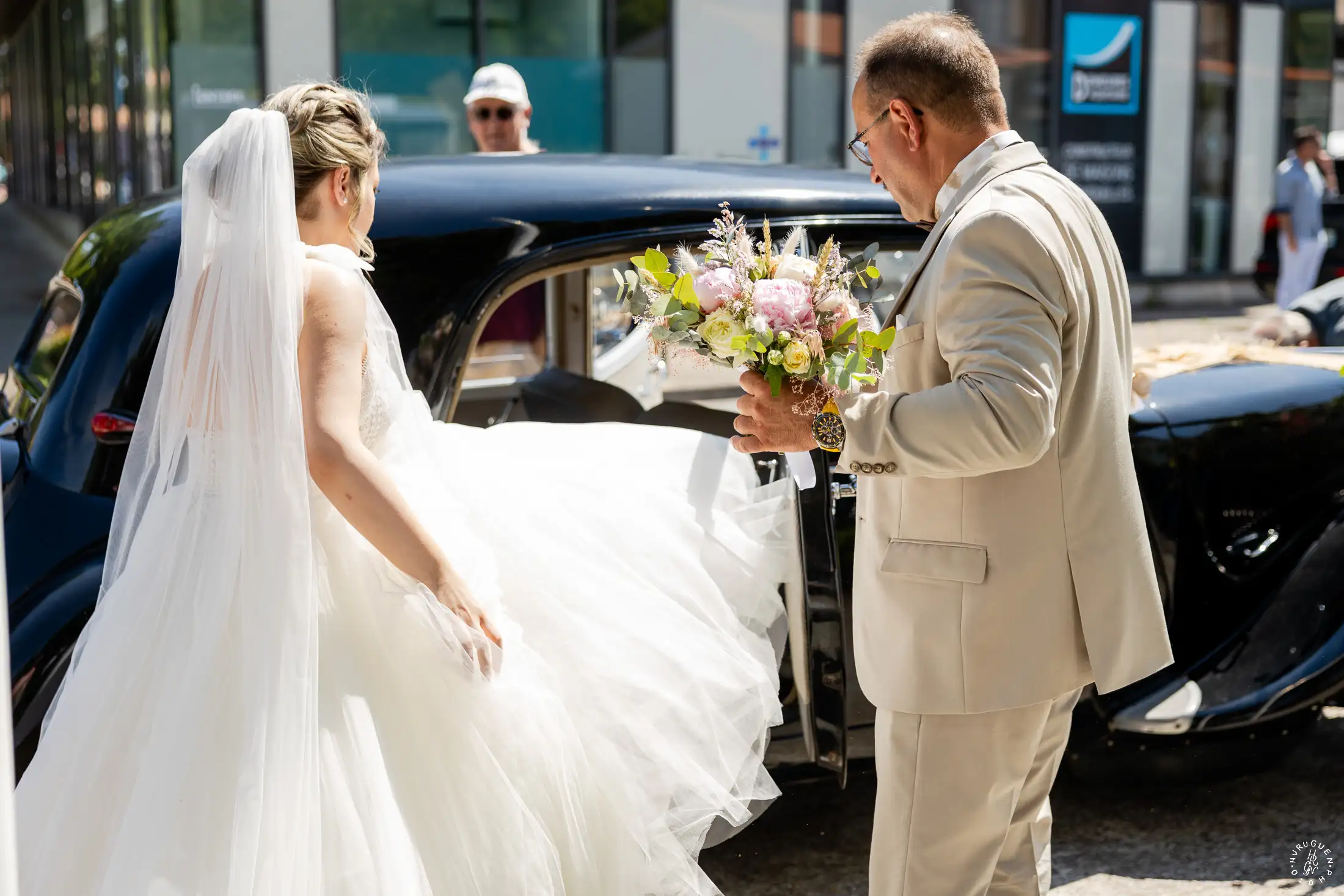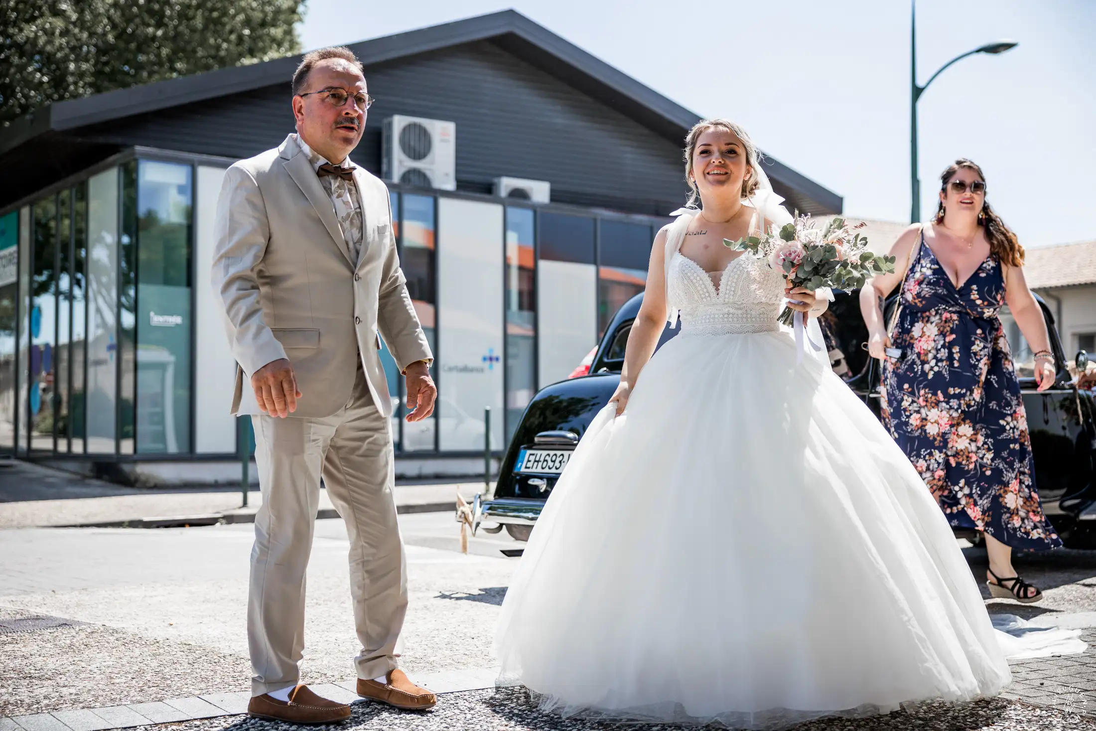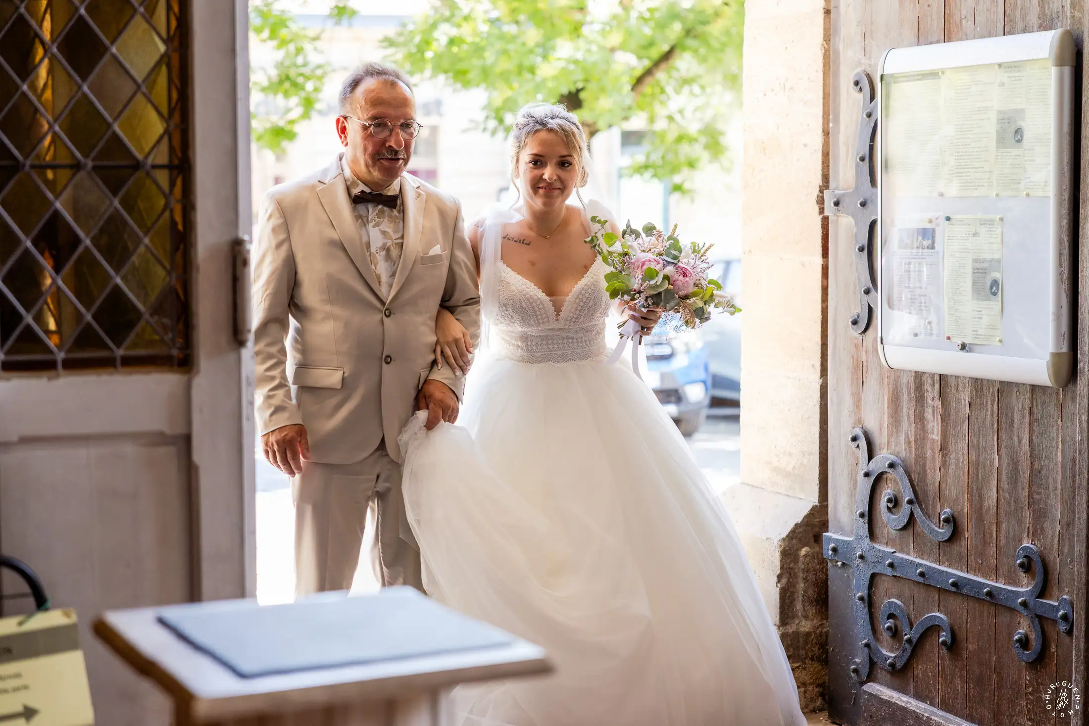 Accompagnée de son père, L rayonnait dans sa robe de dentelle, bouquet pastel à la main.