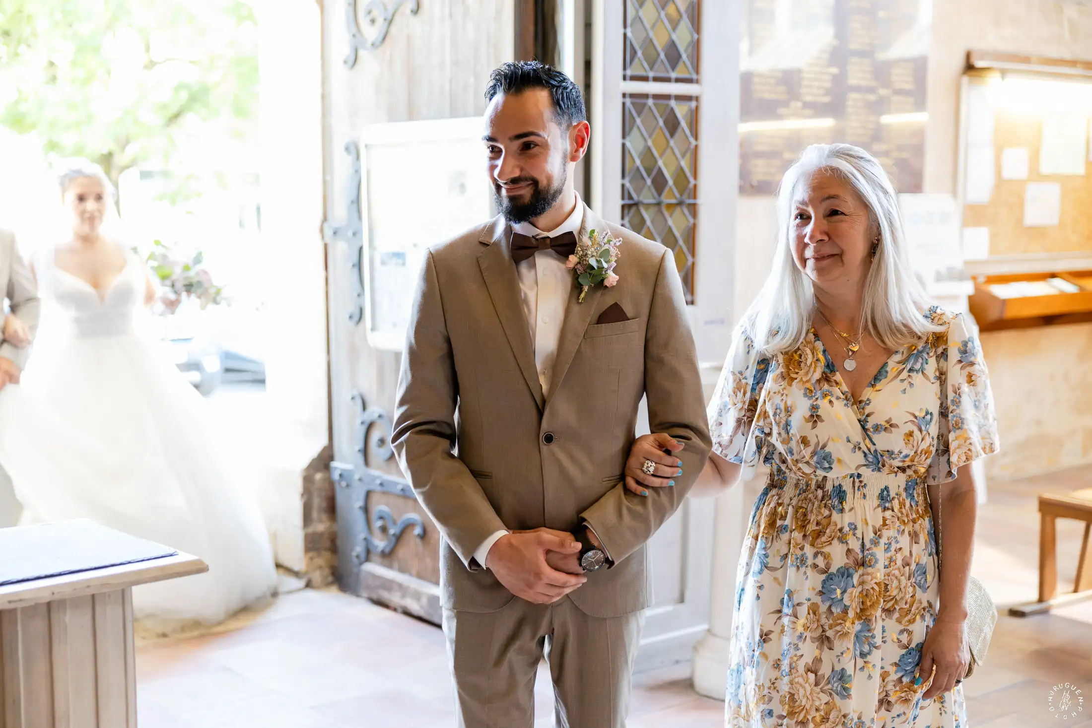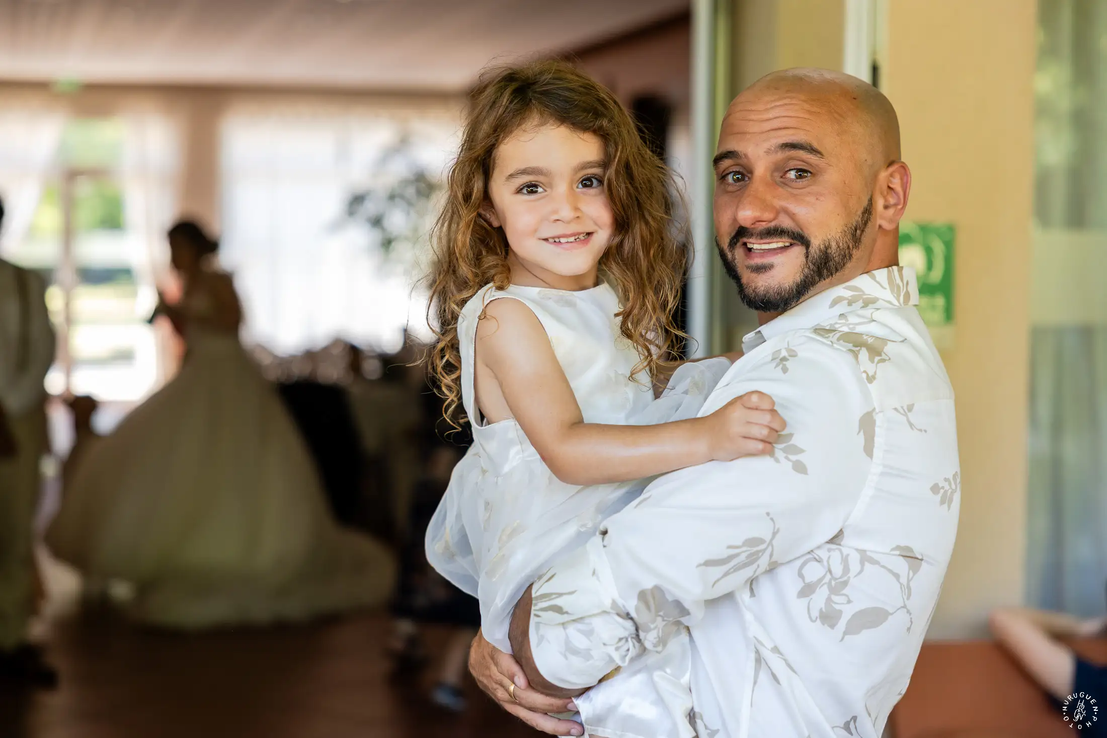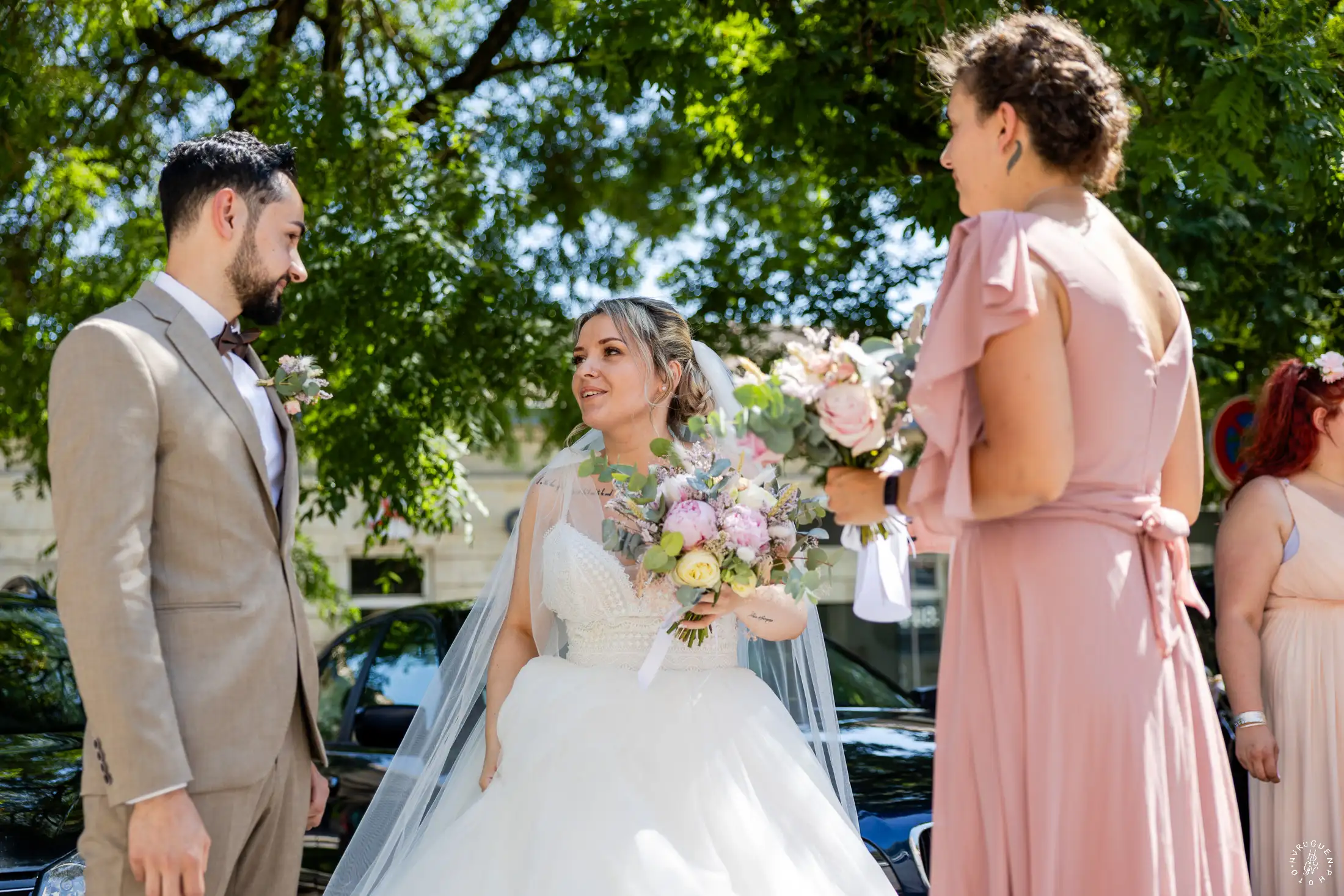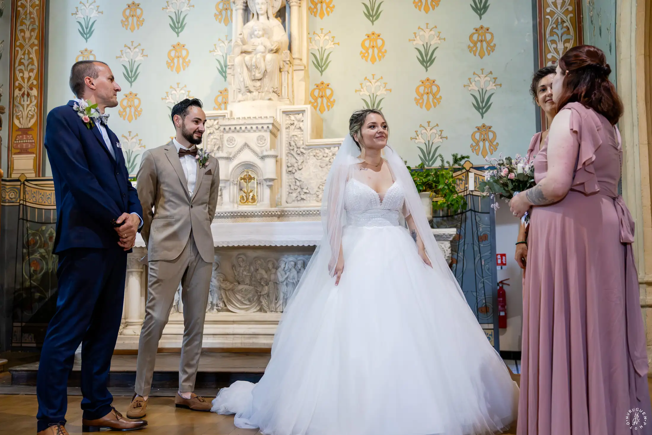 Accompagnée de son père, L rayonnait dans sa robe de dentelle, bouquet pastel à la main.