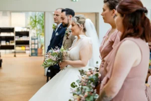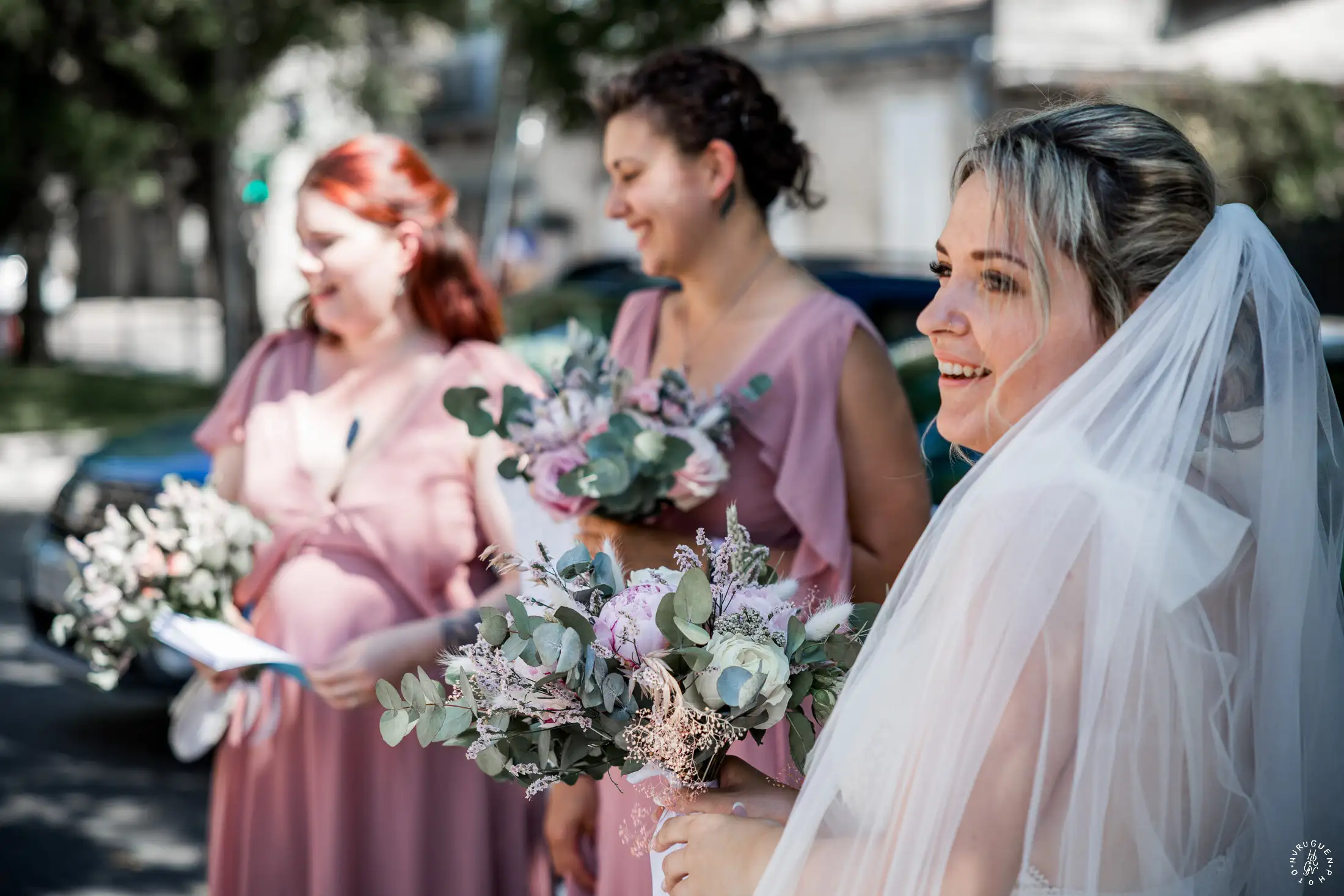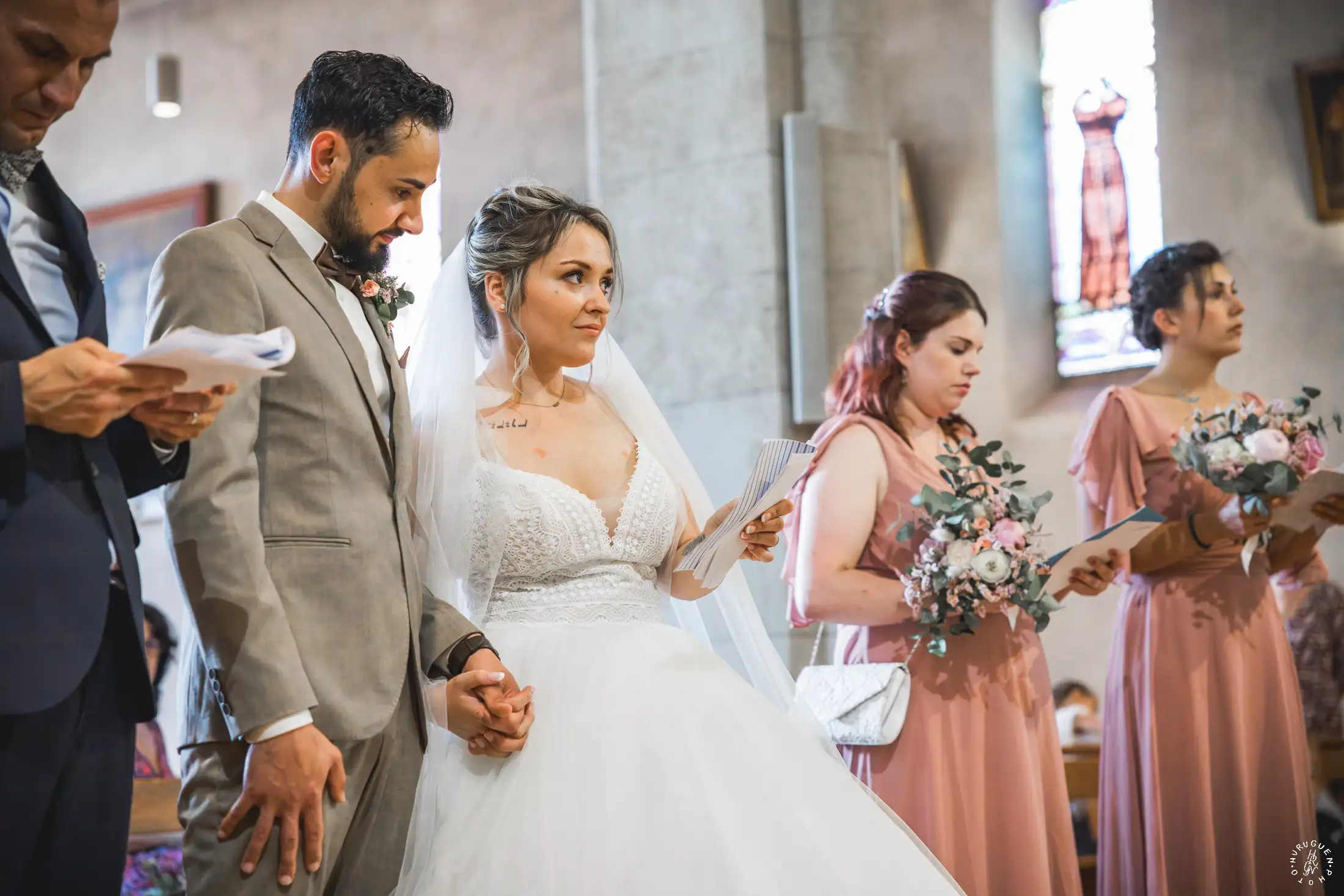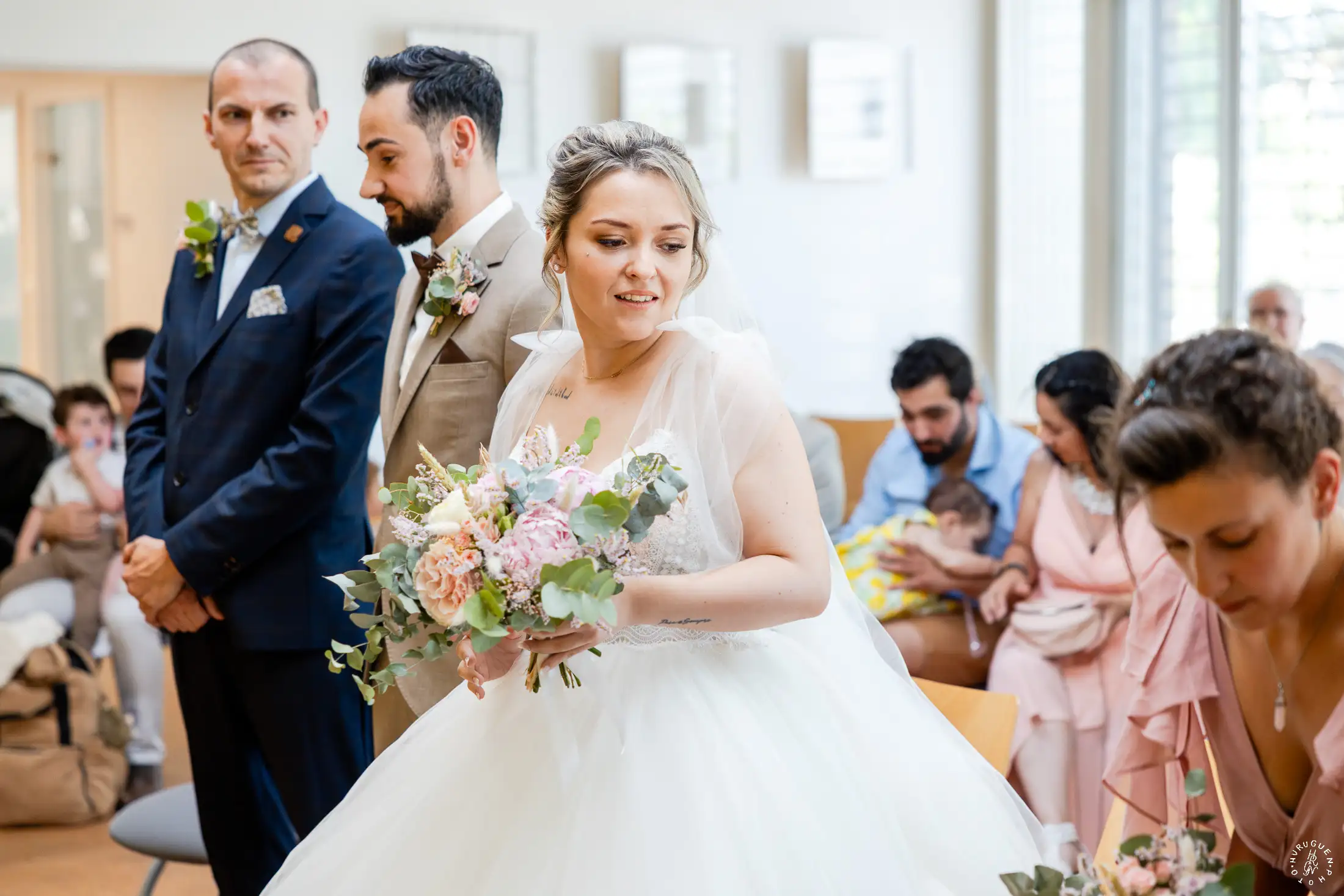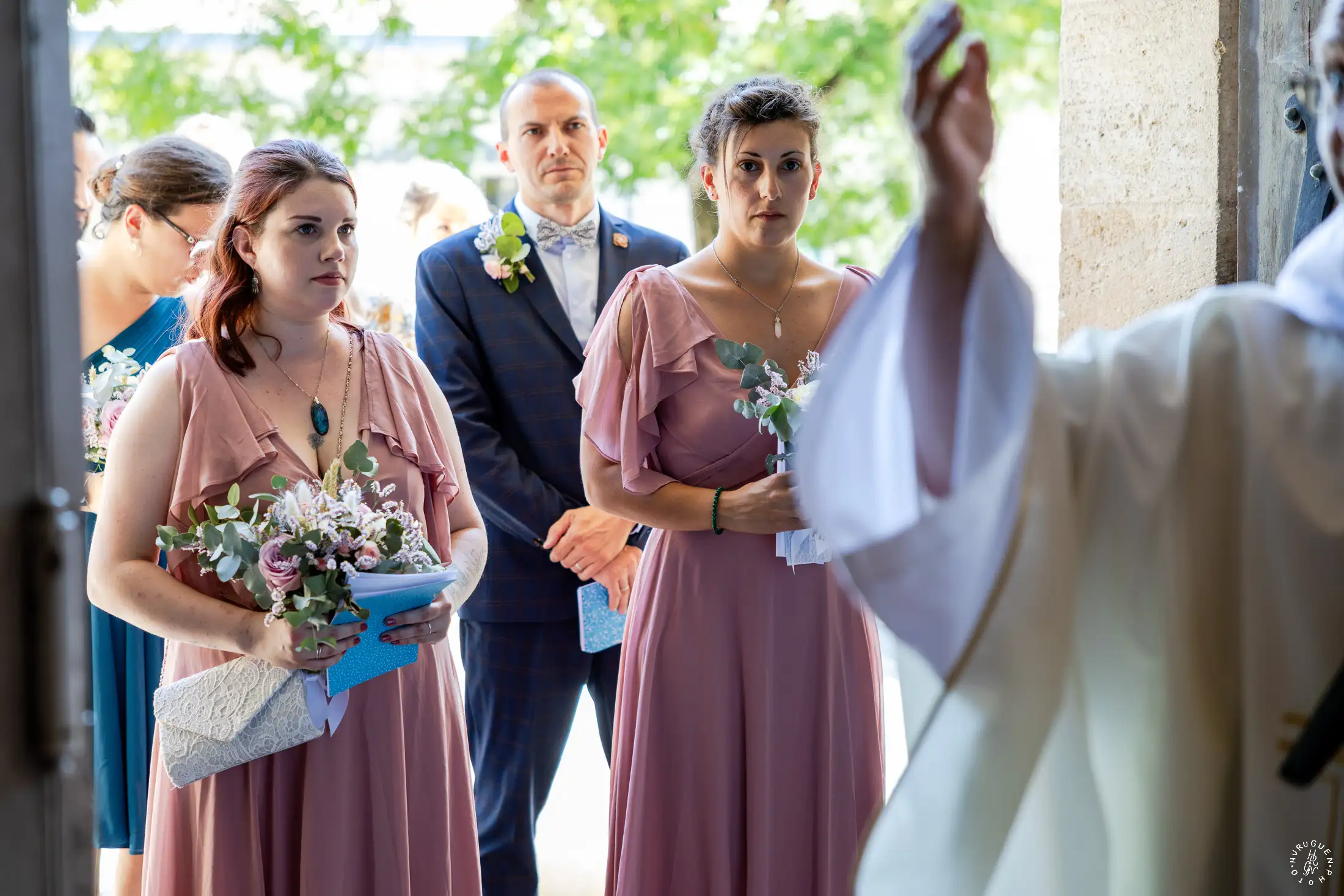 Accompagnée de son père, L rayonnait dans sa robe de dentelle, bouquet pastel à la main.