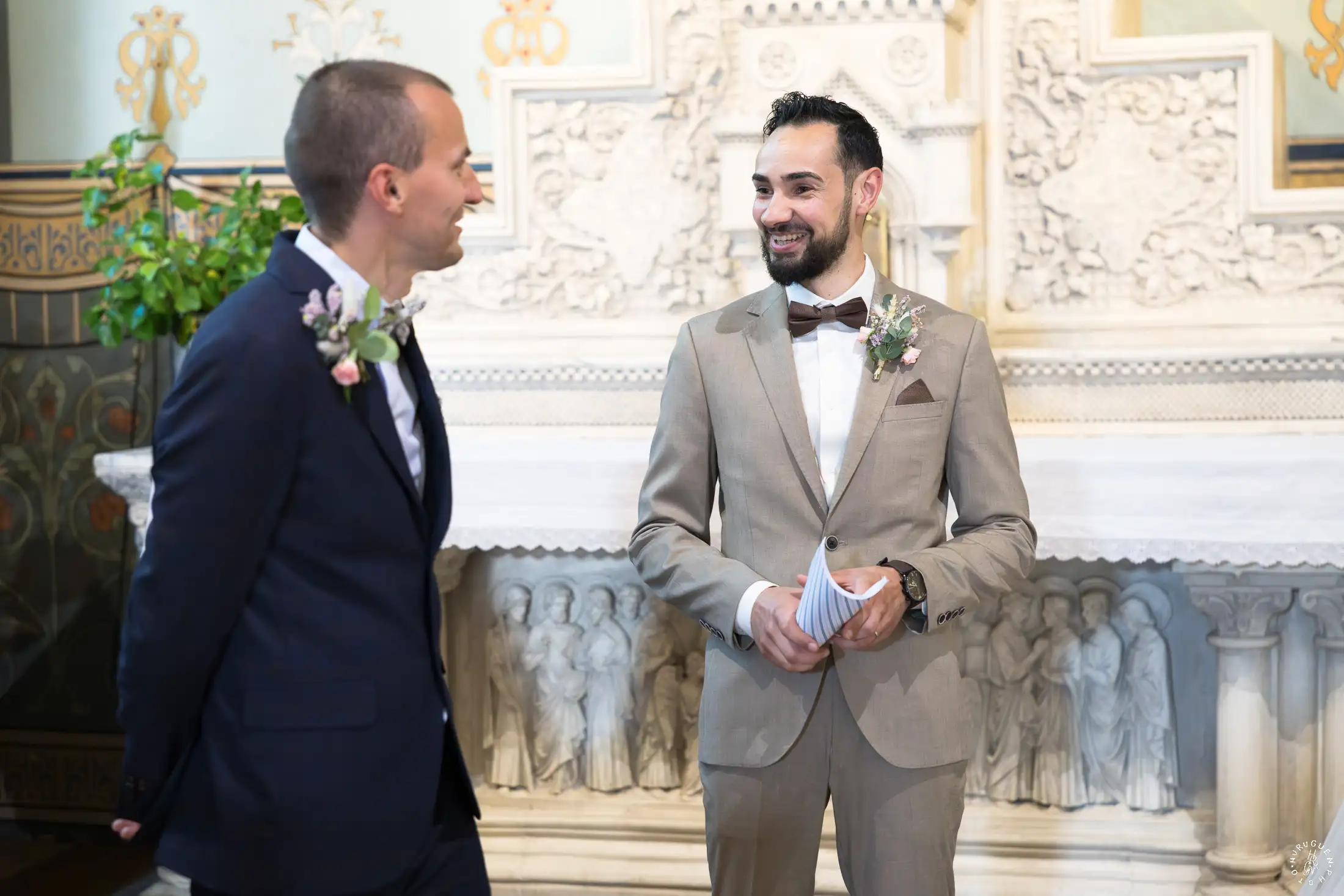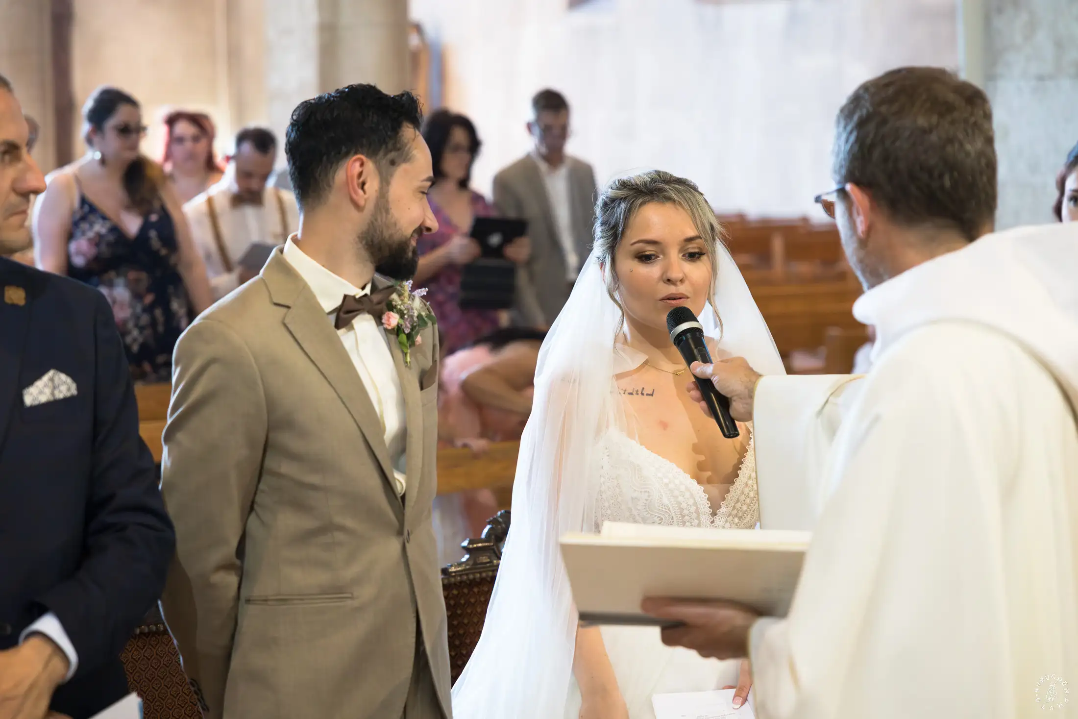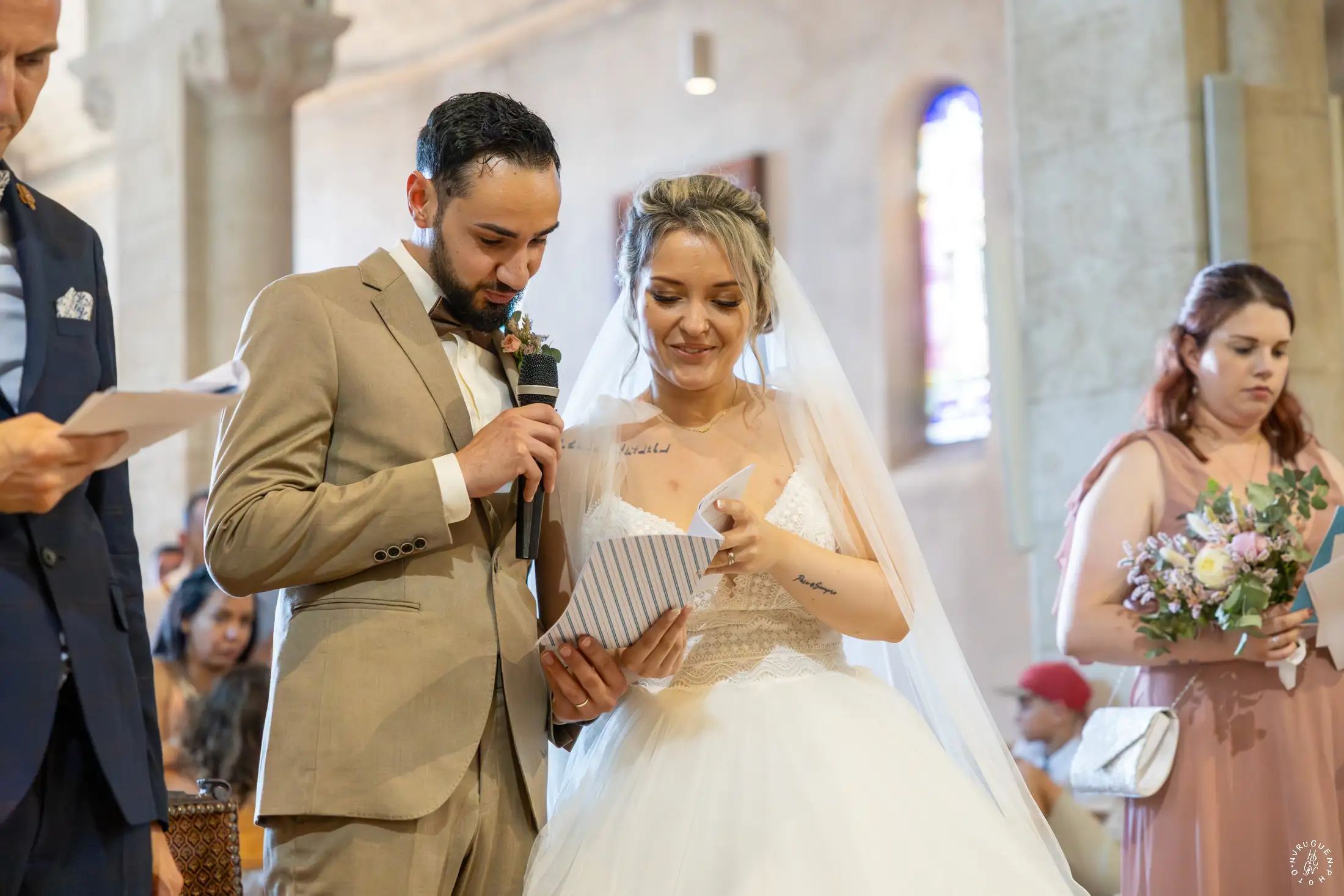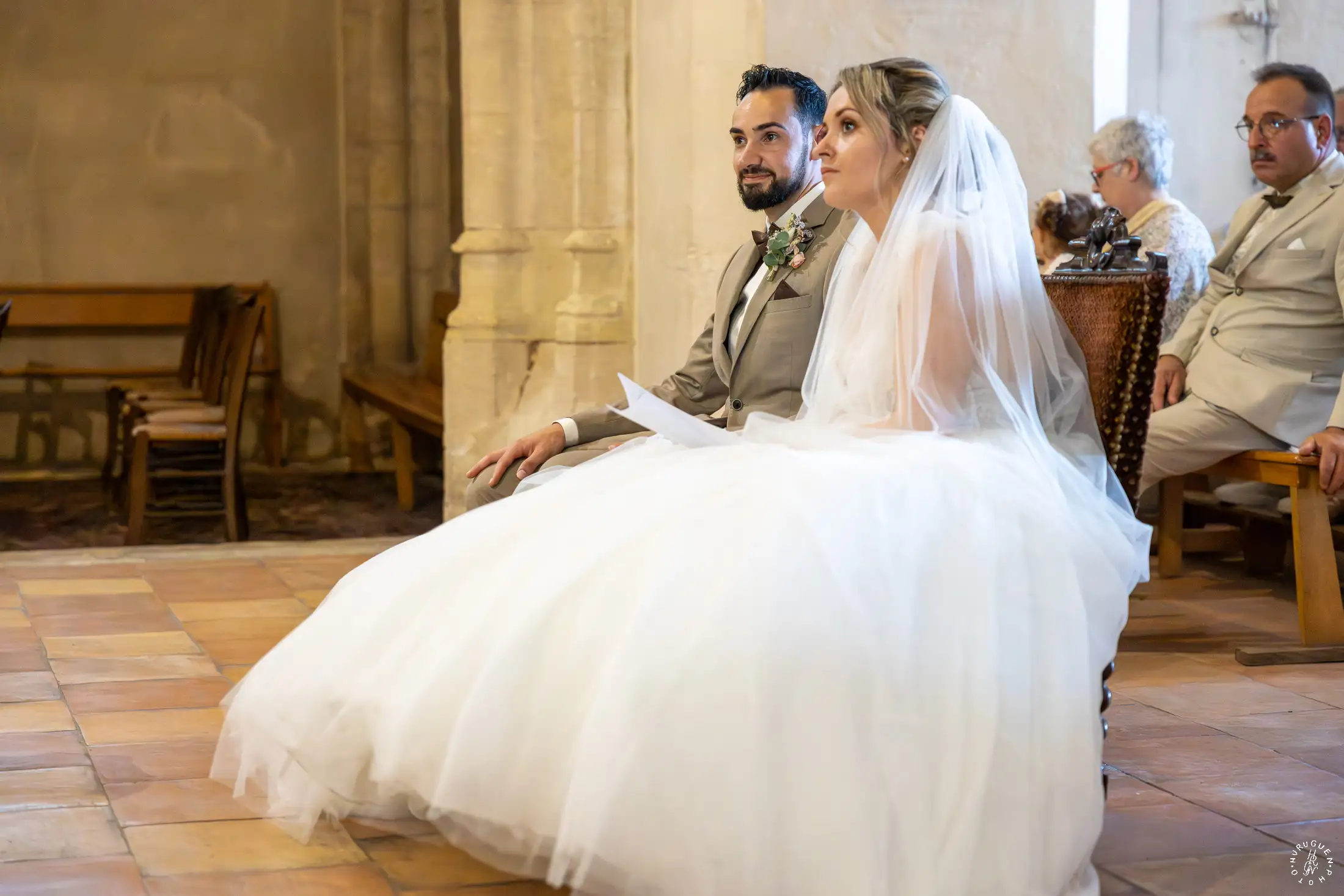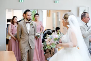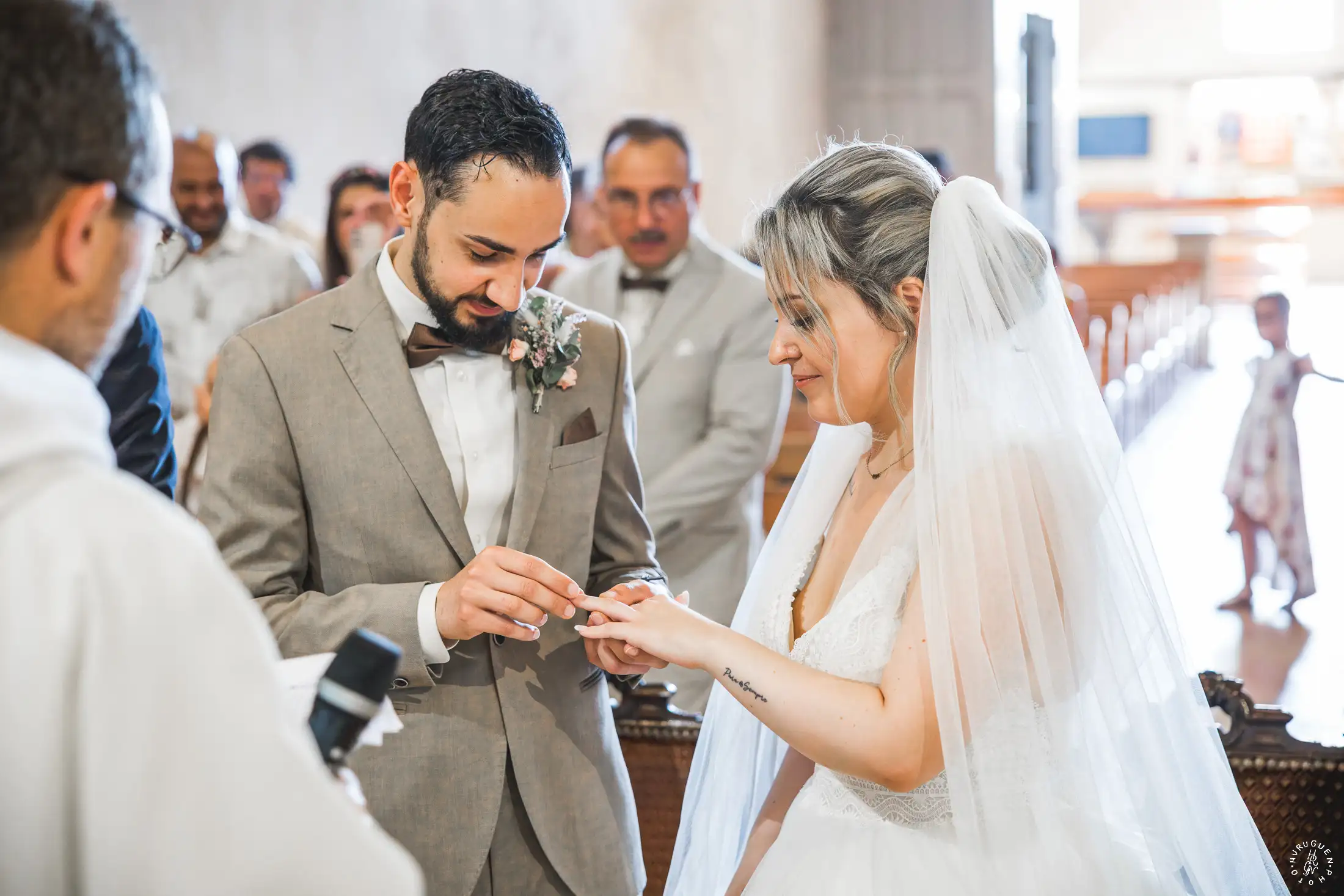 Le choix du costume beige de N, parfaitement accordé aux tons chauds de la pierre, apportait une touche de modernité très chic lors de l’échange des alliances.