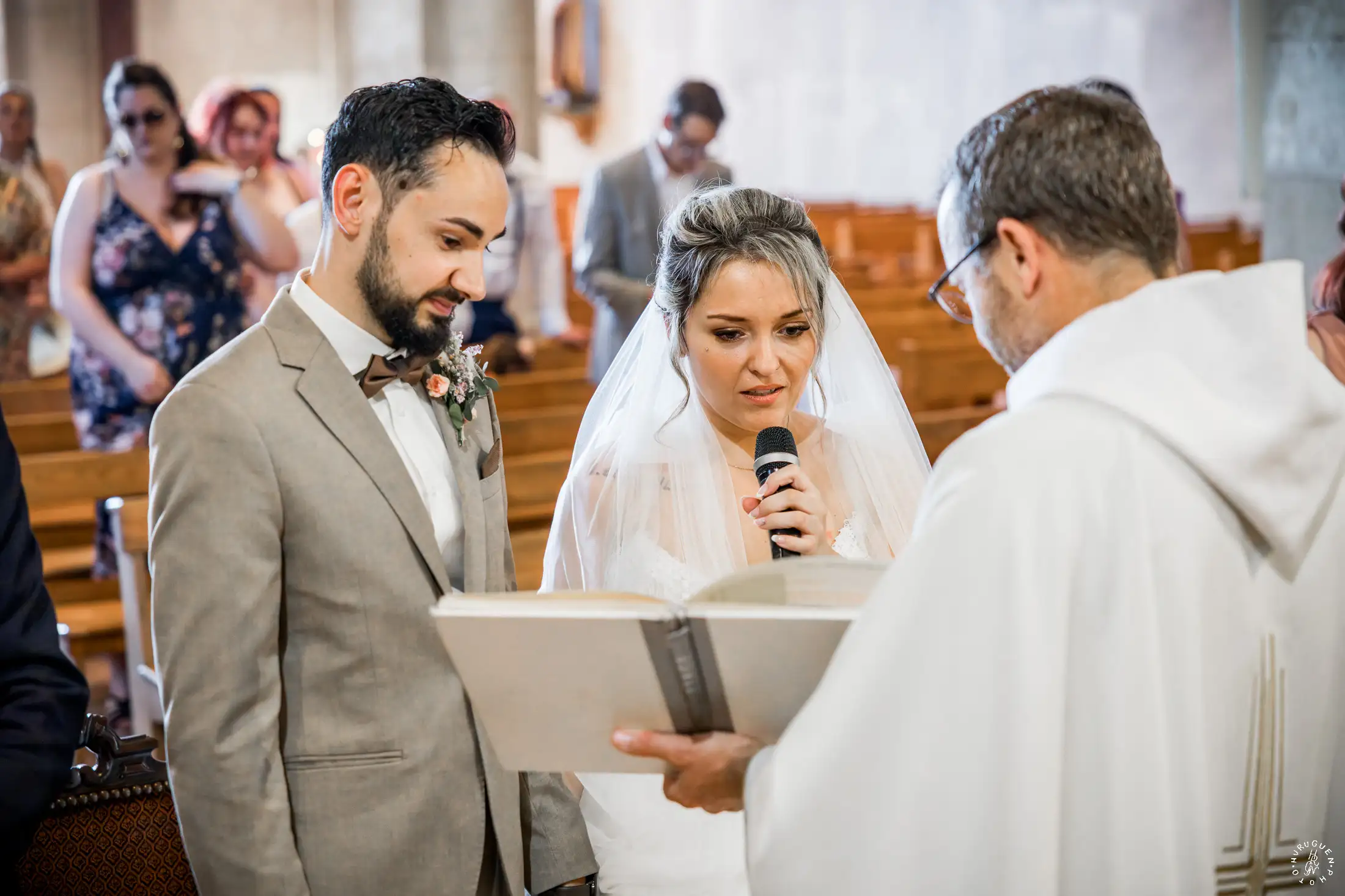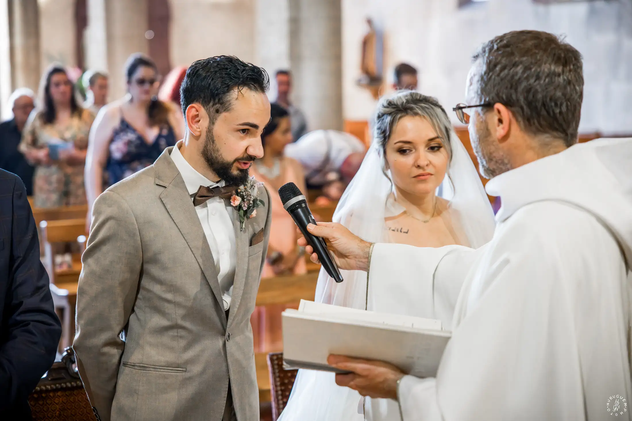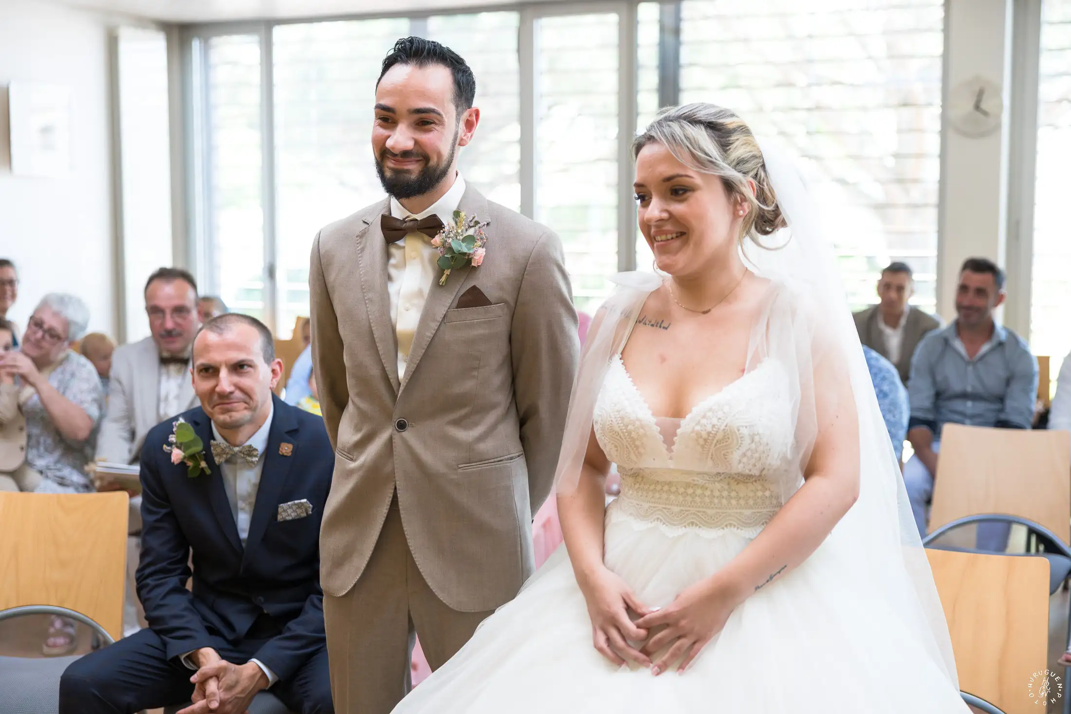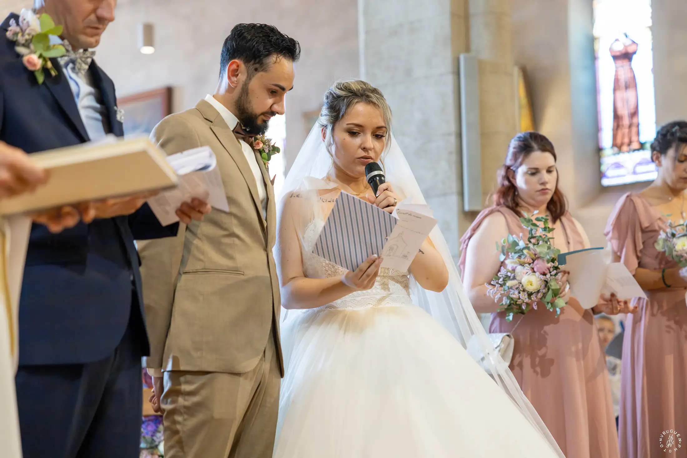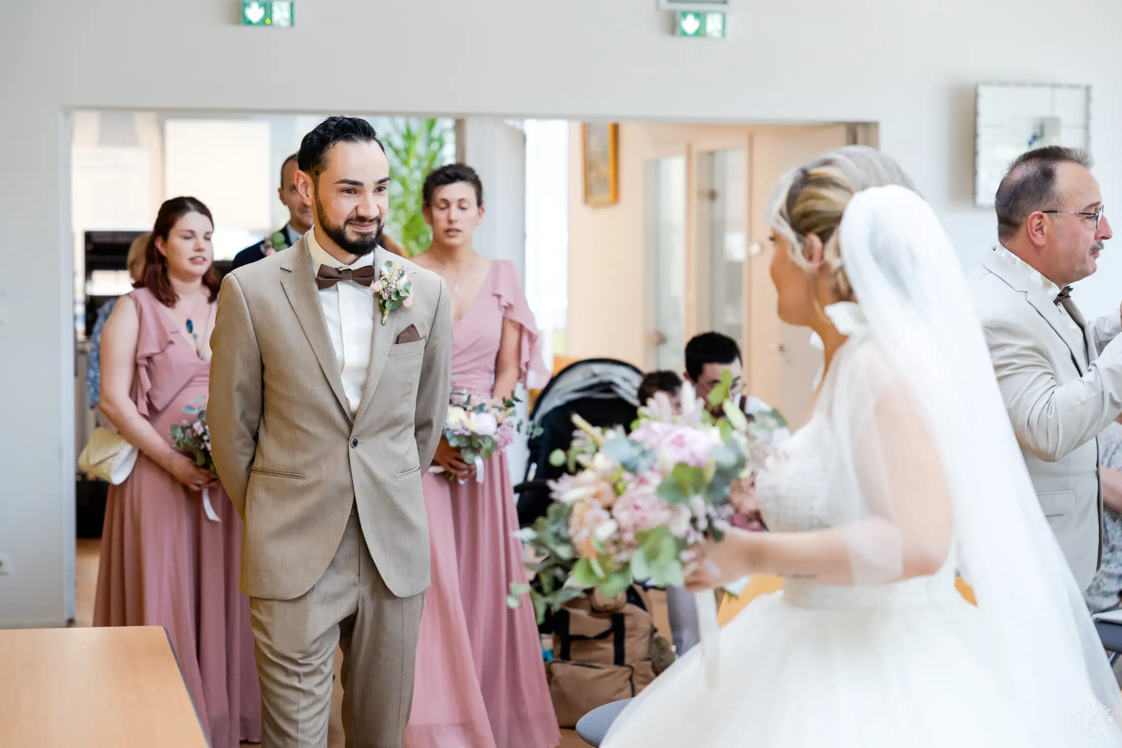 Le choix du costume beige de N, parfaitement accordé aux tons chauds de la pierre, apportait une touche de modernité très chic lors de l’échange des alliances.
