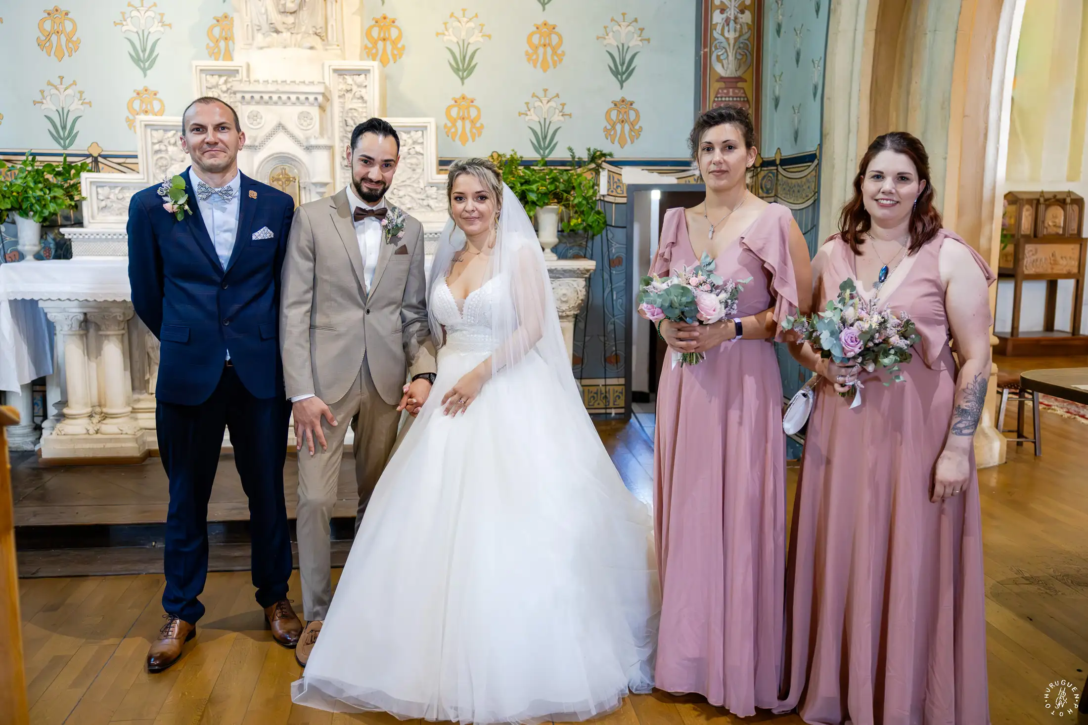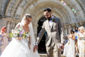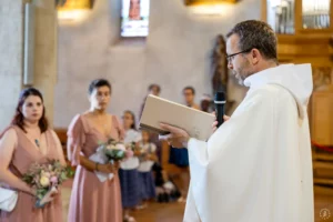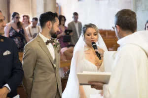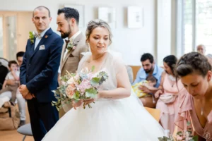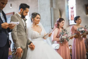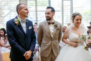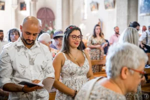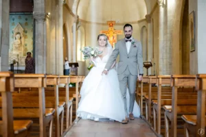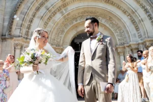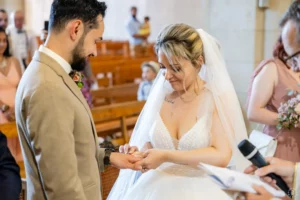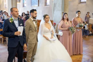 Après une cérémonie civile pleine de sourires à Saint-Aubin, le cortège s’est dirigé vers l’église de Saint-Médard-en-Jalles pour une bénédiction solennelle et touchante, marquée par la présence joyeuse de leurs enfants au premier rang.